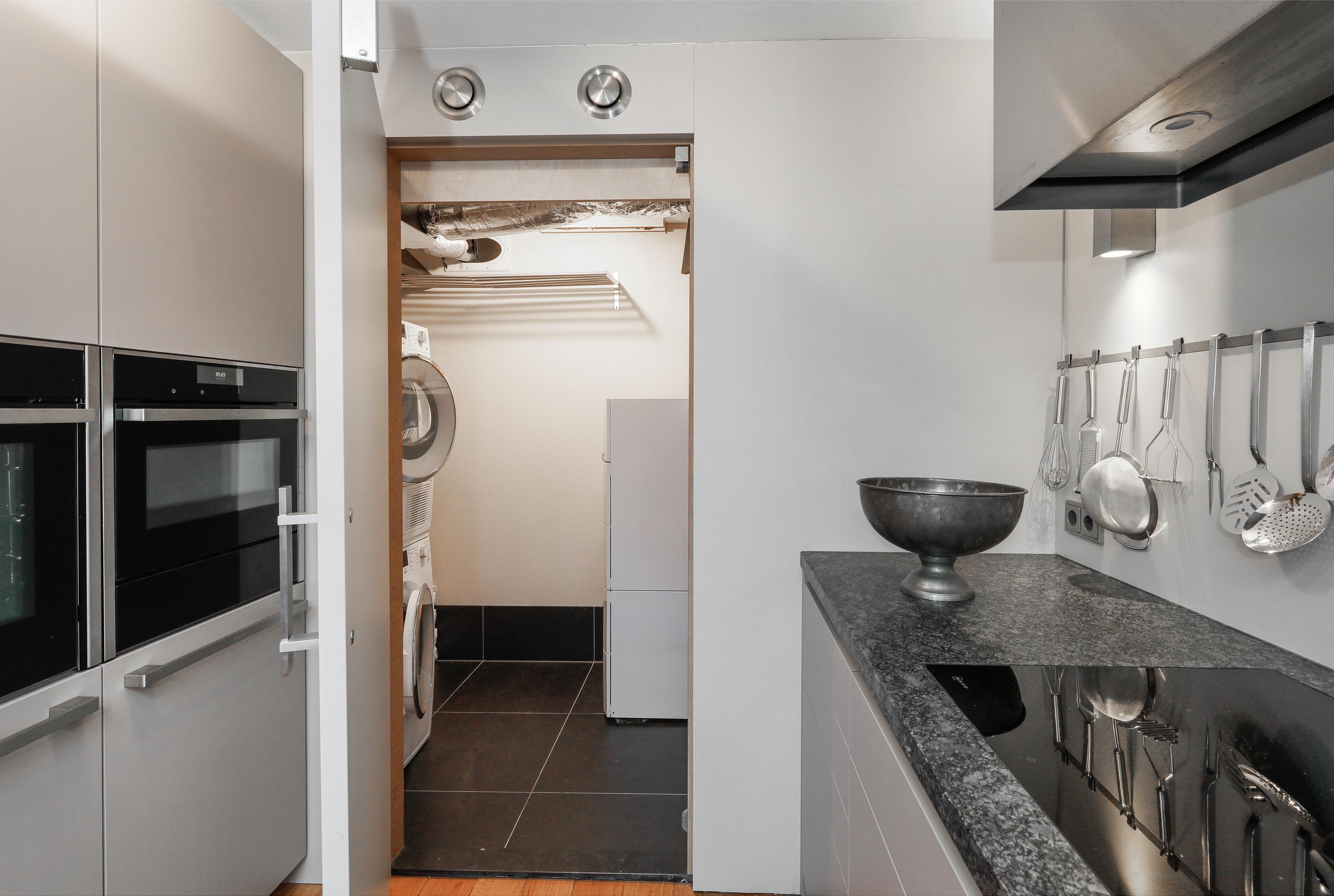 Don't be misled by the understated style of this kitchen. Poggenpohl created thoughtful, high-quality custom work tailored to the owner's wishes. This exceptionally practical and functional kitchen has everything you need to make a culinary splash. Behind the sleek design, you'll find a dishwasher, refrigerator, freezer, induction cooktop, extractor hood, combination grill oven, oven, microwave, plate warmer, and wine cooler. There's an anti-reflective natural stone countertop, good lighting, and ample storage space. Even more space can be found in the utility room, which houses the washing machine connections, central heating boiler, and water softener.