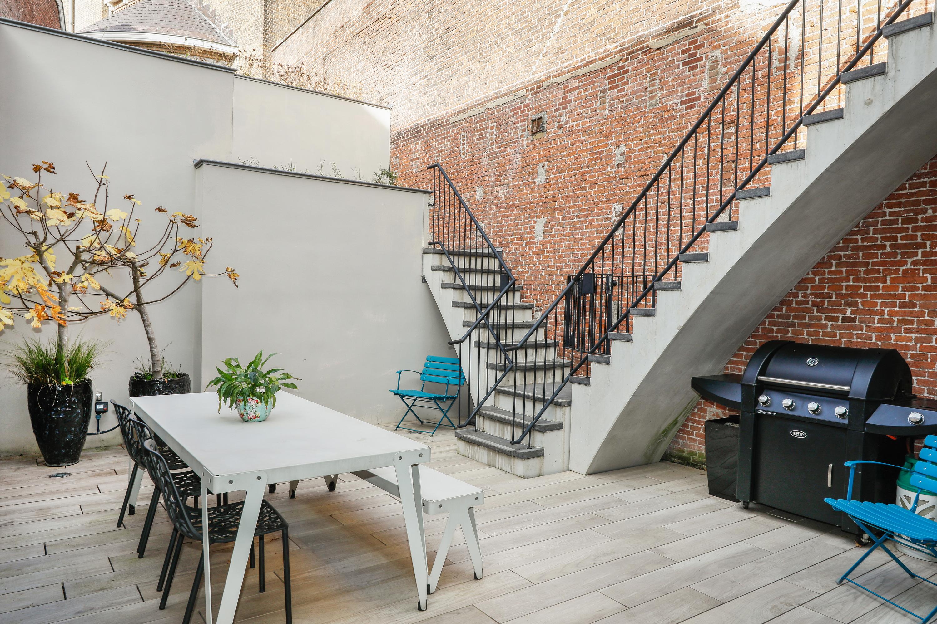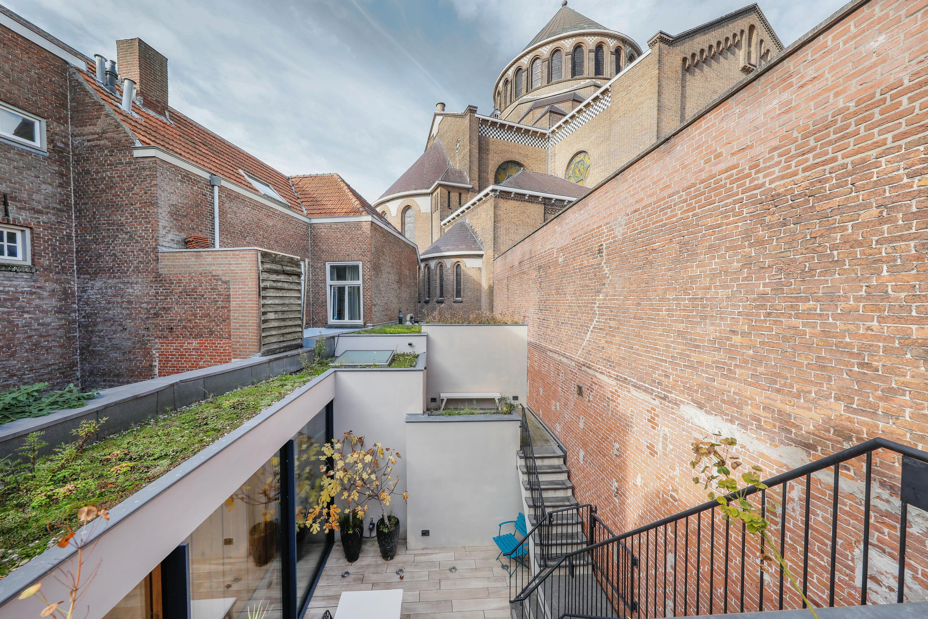 Of course, everyone is familiar with the front of St. Jacob's Church. But your visitors will still be surprised by the view from this side. The architect's approach to this project was a surprising one. By installing a huge transparent wall, the inside becomes the outside, and vice versa. The wall can be slid open in two directions from the corner. During the day, it's a wonderfully bright spot for a cozy dining table, and in the evening, you can dine with this remarkable view. The long wall of cabinets makes your home both practical and tasteful. This home also offers more outdoor space than is typical in the city center. In addition to a large courtyard garden, there are two roof terraces. So, you can choose your own spot for sun, shade, reading a book, enjoying a glass of wine together, or enjoying a delicious dinner al fresco.