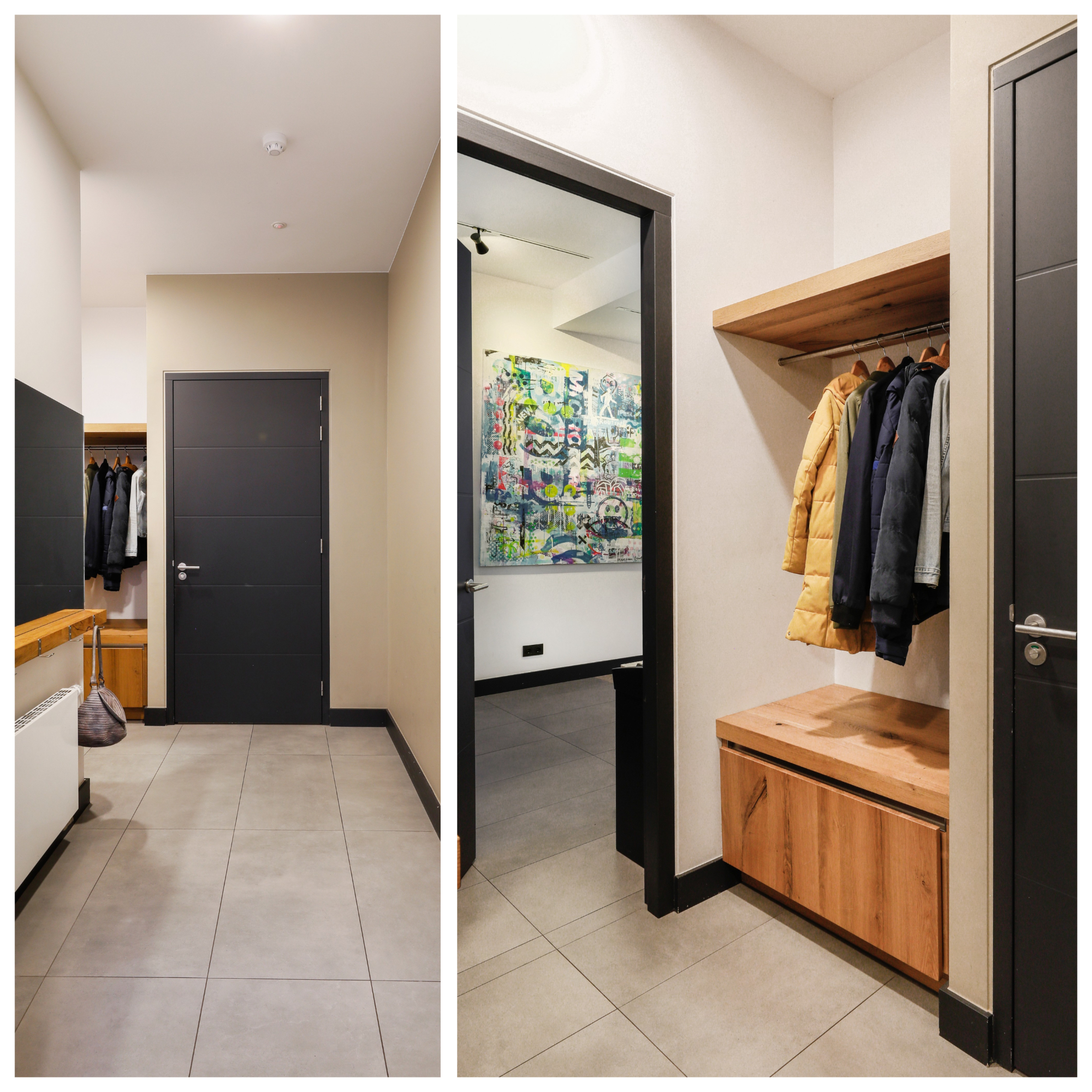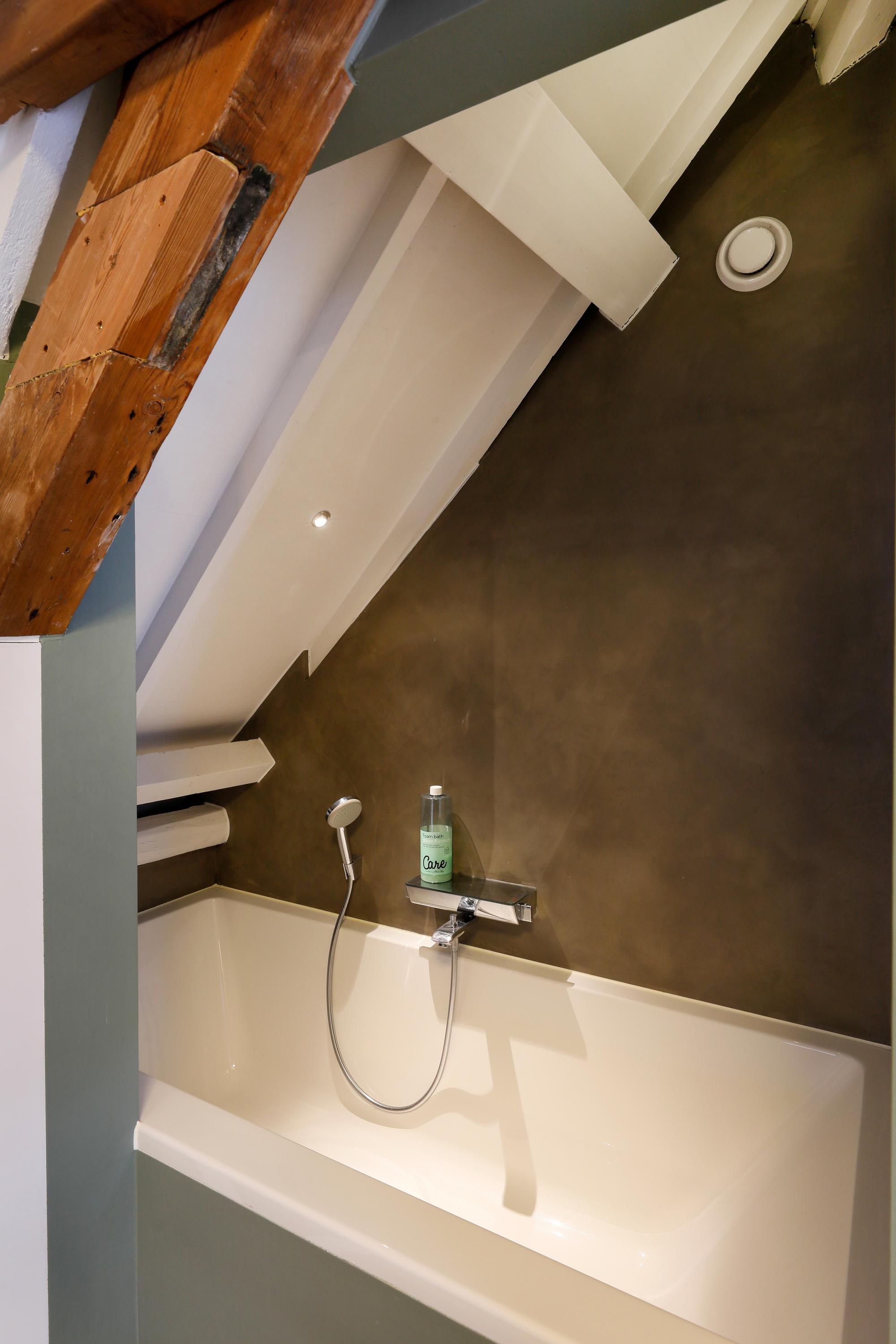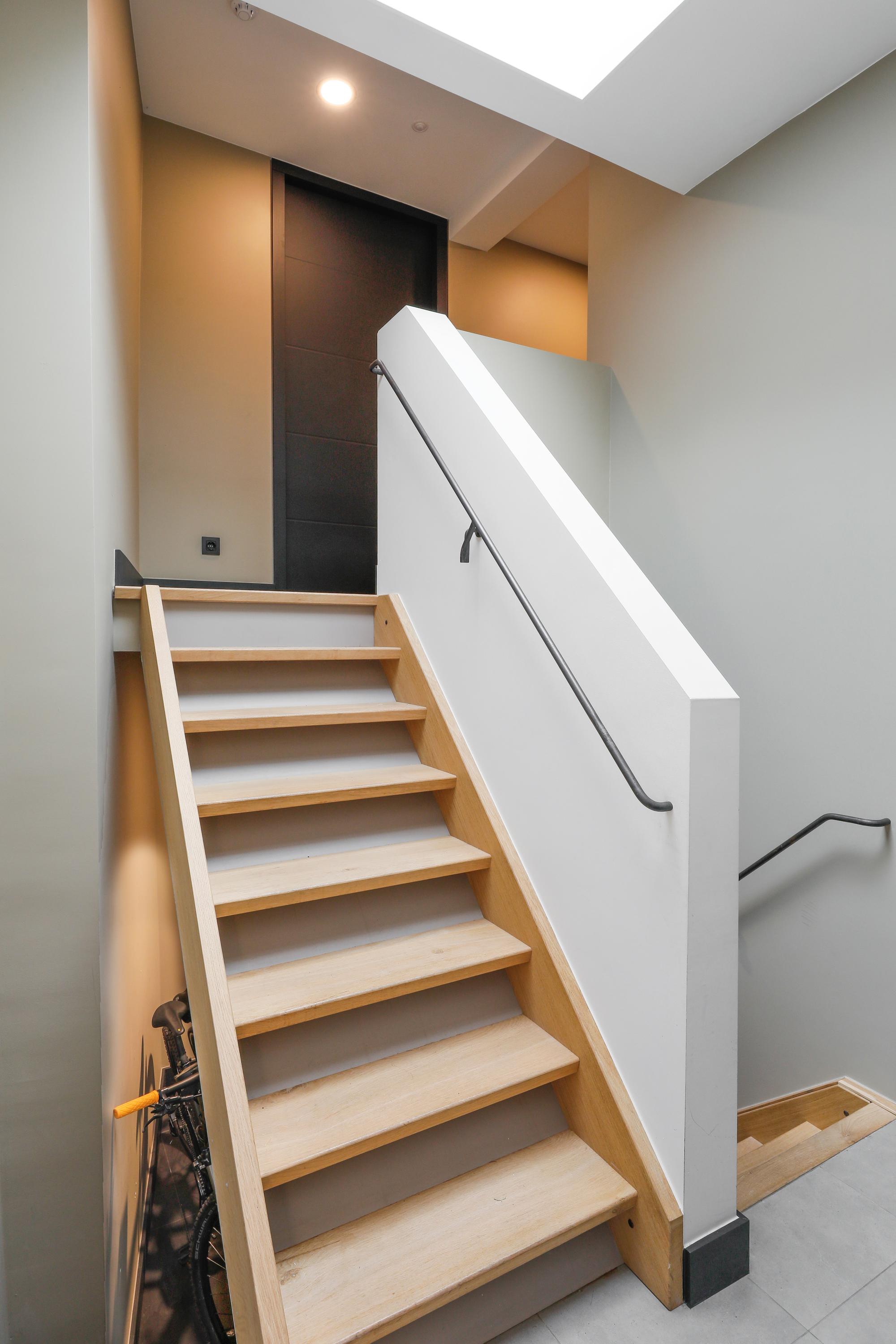 This was once an upstairs and downstairs apartment. By combining the two, a staircase could be removed. The current staircase is beautifully concealed behind a sliding door. We recognize this architect by the banister, but also by the interplay of lines on this staircase and the light line between the wall and the sloping surface. Laundry appliances are concealed in a cupboard on the spacious landing.