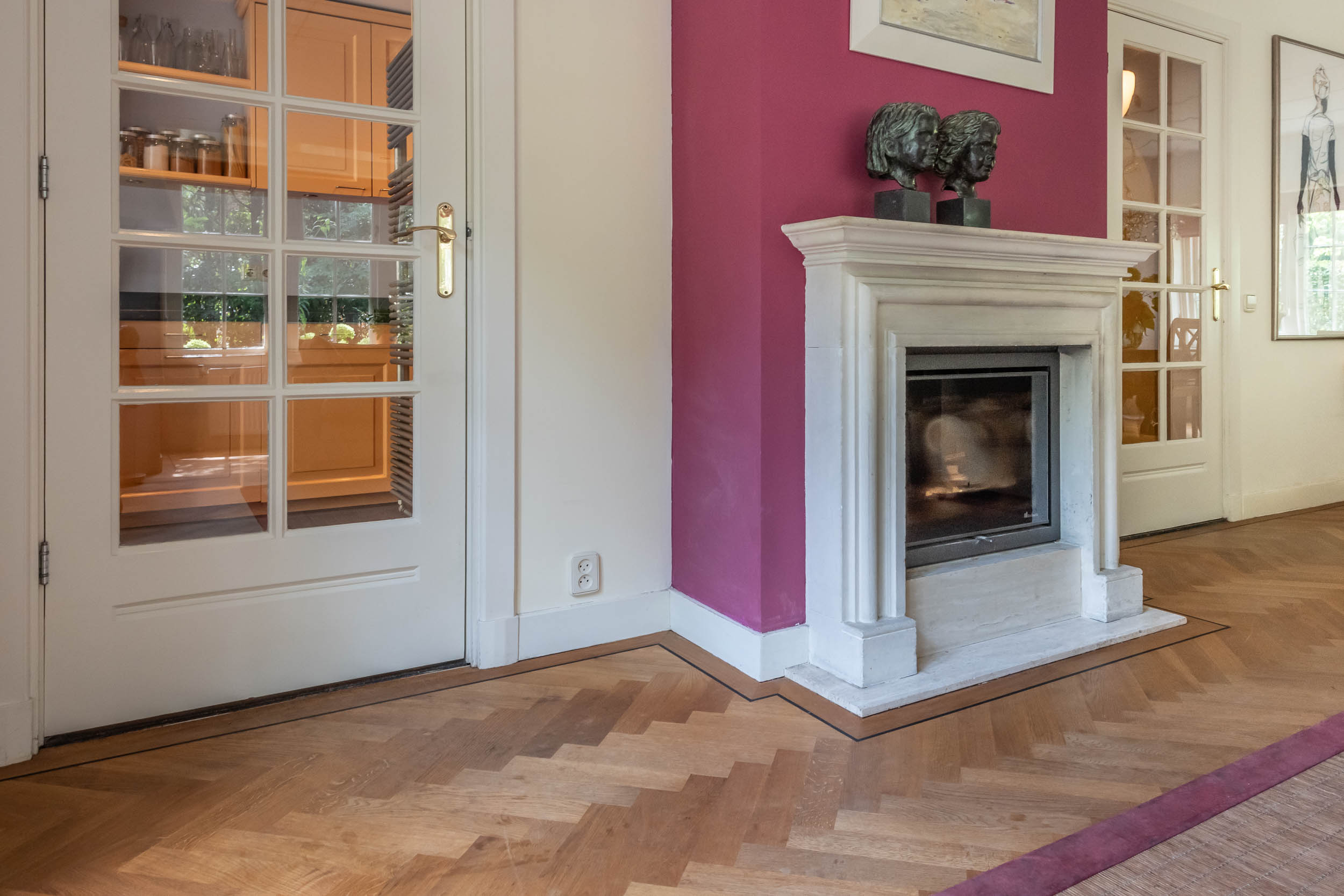 Entrance, vestibule with cupboard, L-shaped hall with toilet and access to basement with standing height, attractive and spacious living room with parquet floor (2022), two fireplaces (2024) and French doors to the rear terrace. Glass doors provide access to the conservatory with underfloor heating. The open-plan kitchen has various built-in appliances and gives access to the cozy dining room with underfloor heating, French doors and a beautiful view of the garden.
