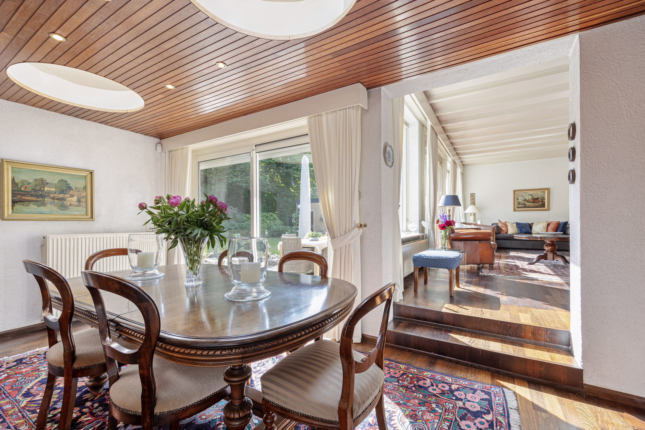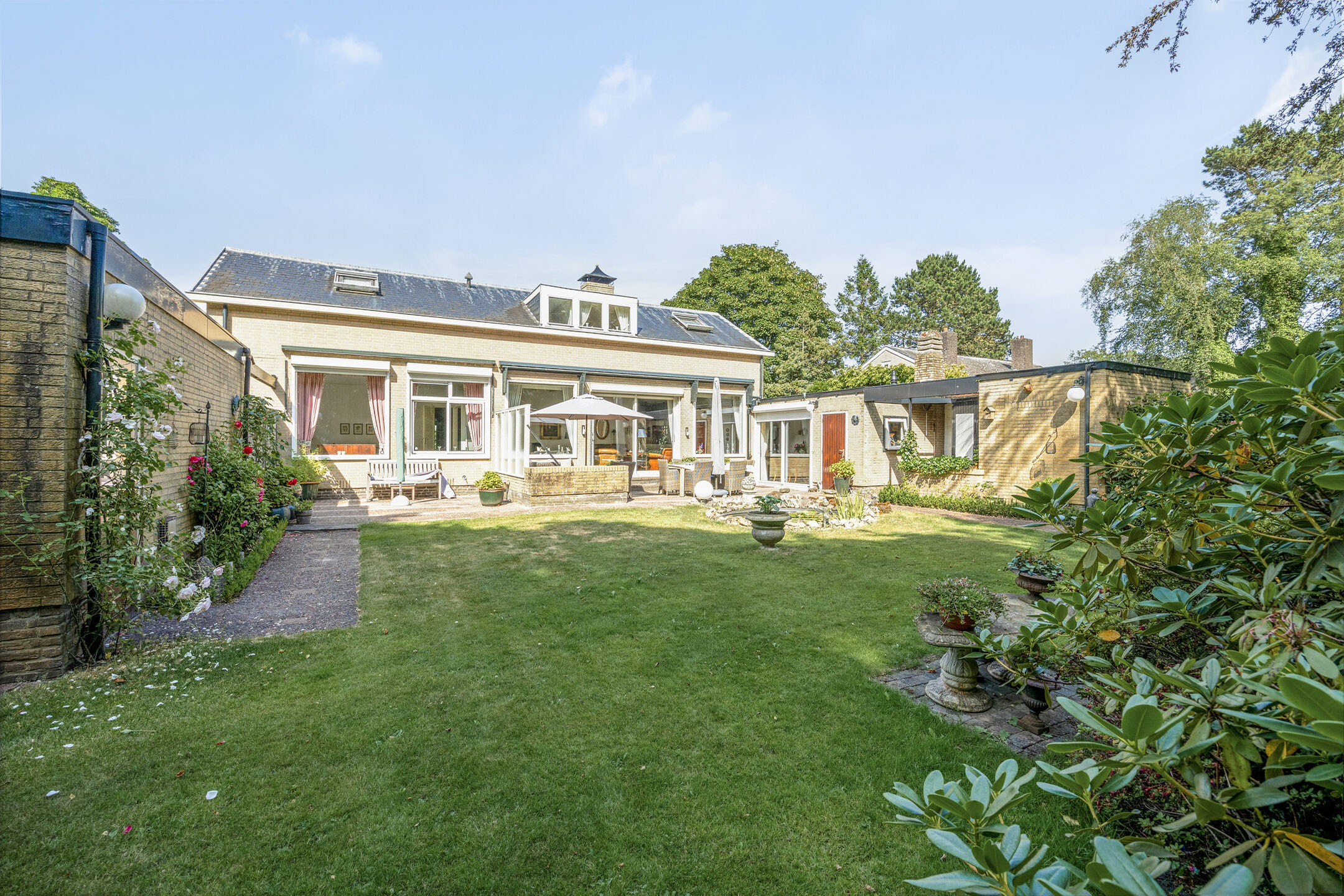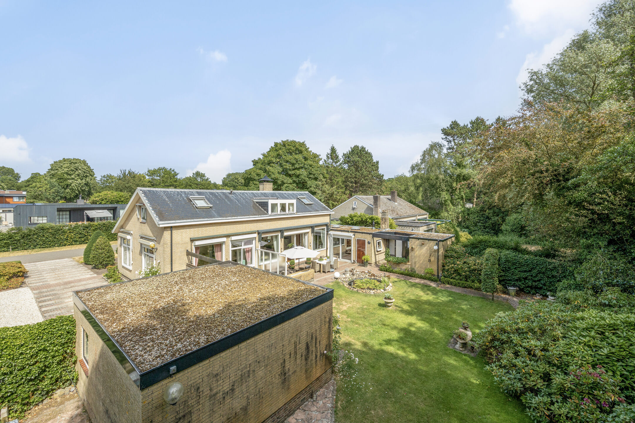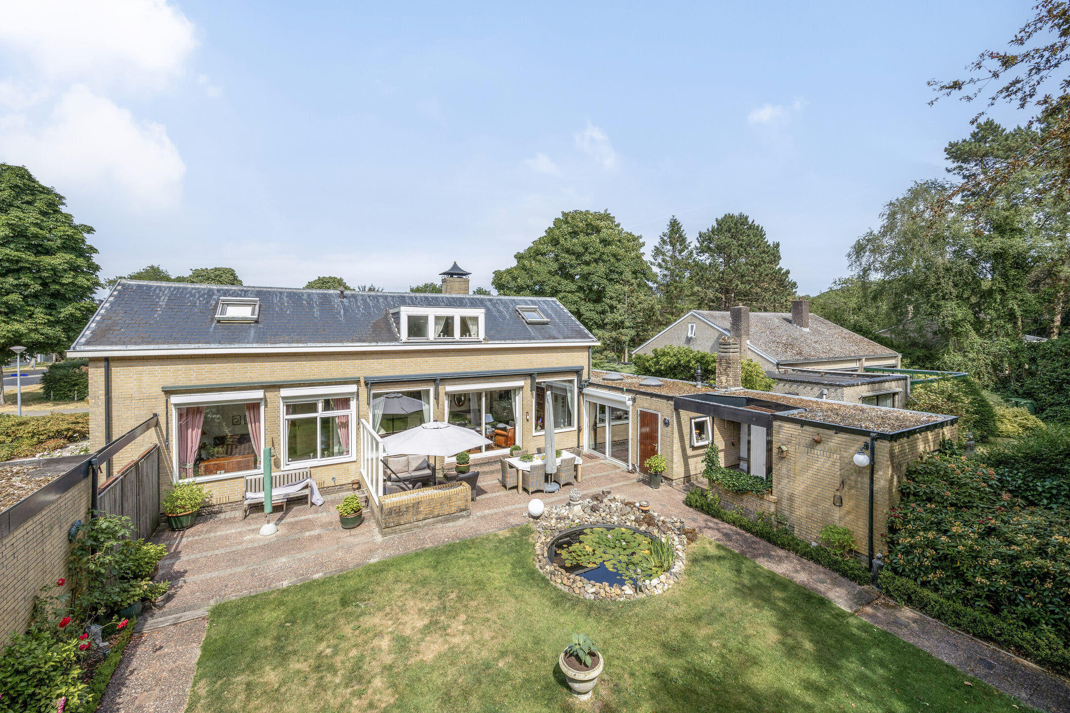 Upon entering a spacious living room with separate dining room, you are immediately embraced by the lightness brought by the numerous windows. The spacious sliding doors in the living room open onto a spacious panorama, where a lushly landscaped garden stretches out. The sun-drenched terrace, with garden lighting and a pond, offers a serene invitation to relax. The surrounding green oasis guarantees total privacy. The garden, with its spring drainage and sprinkler system, is lovingly maintained.