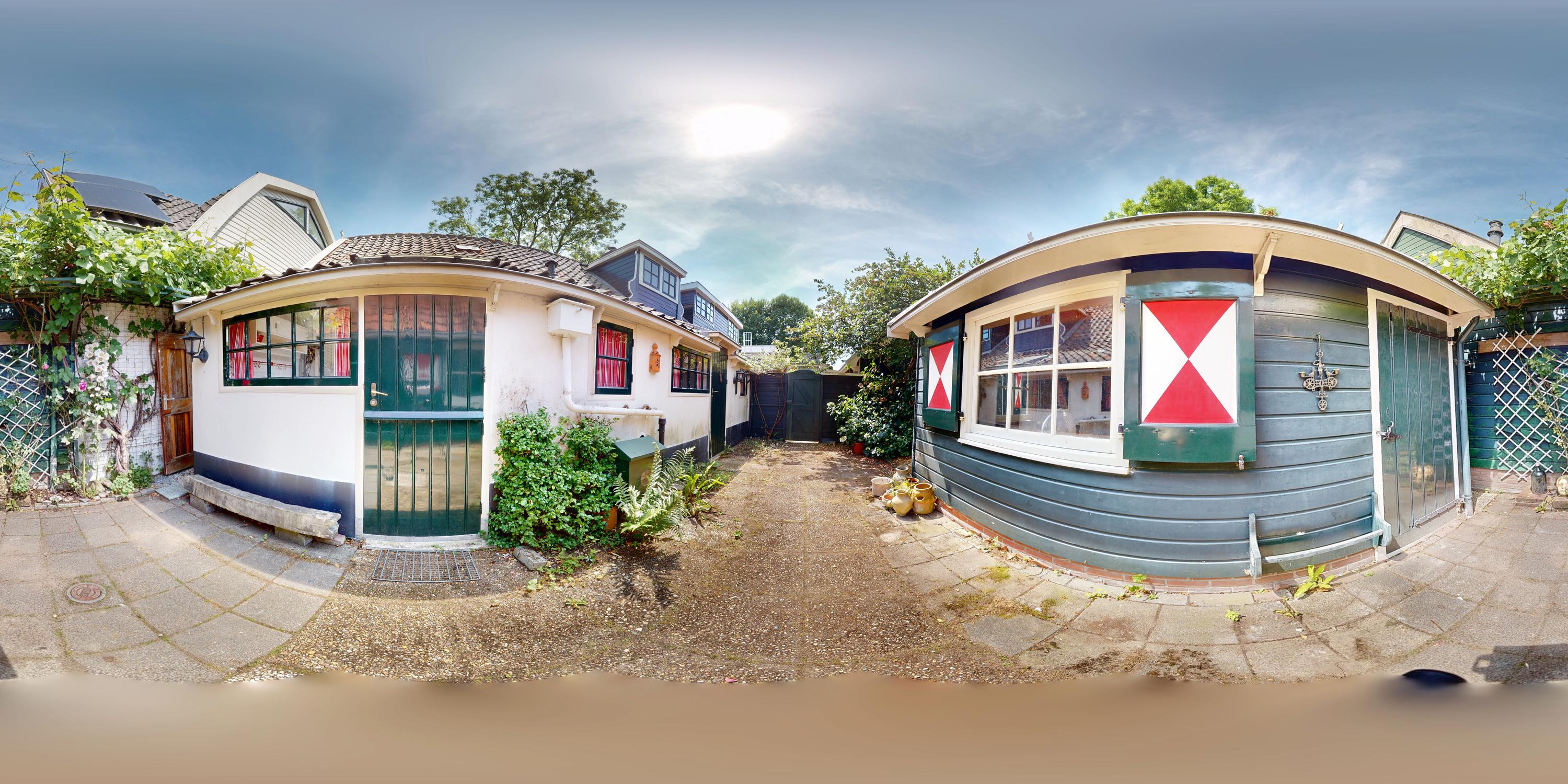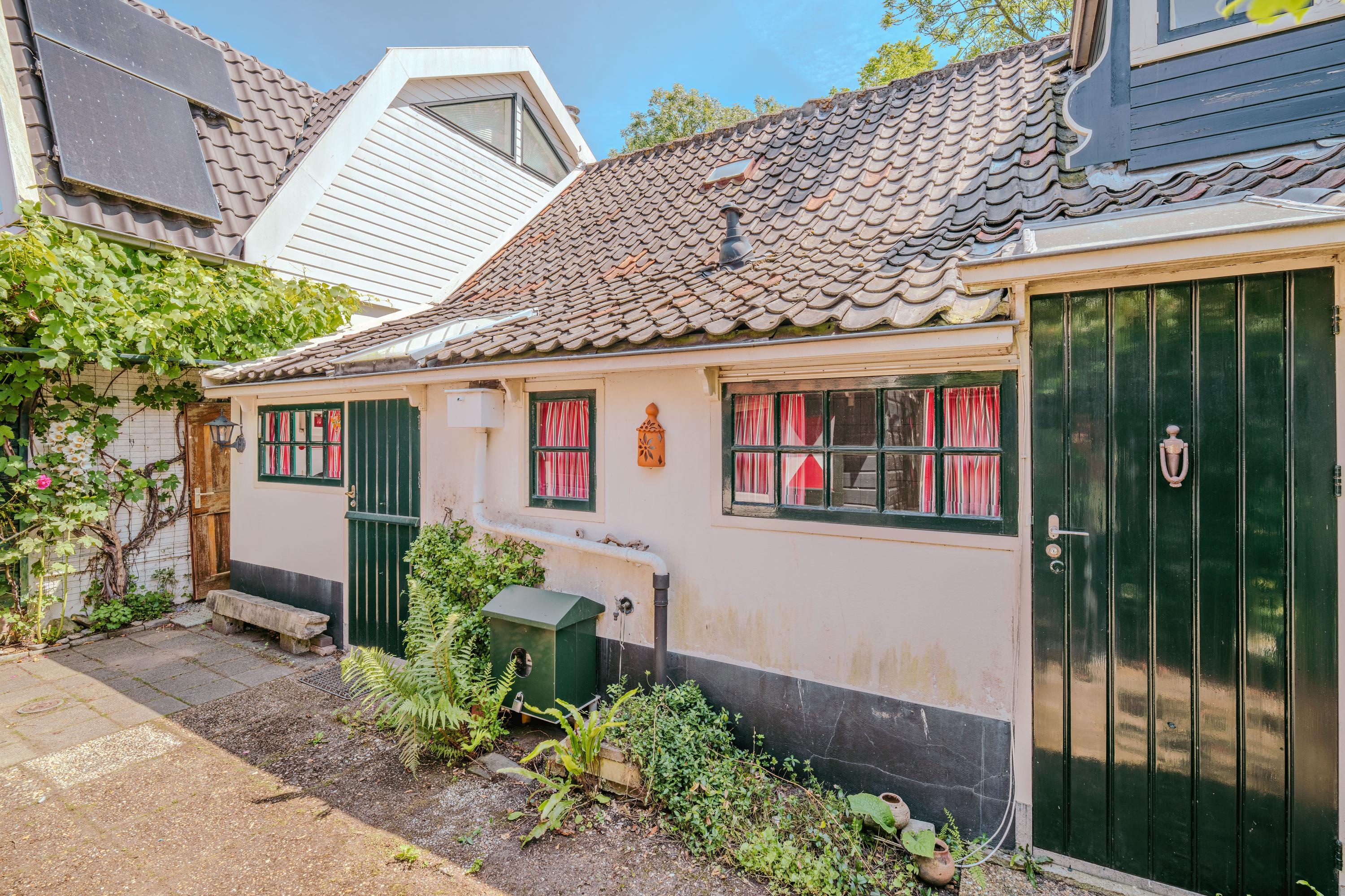 This authentic property offers a unique opportunity for those seeking a characteristic home in a special location, ready to be renovated entirely to one’s own taste. Situated along the Amsteldijk, the house lies slightly below road level and is partly hidden among the greenery. From the dike, a staircase descends to the front garden – a green space offering peace and privacy. On the right-hand side of the house, a narrow path runs along the façade to the front door, subtly set into the exterior wall.