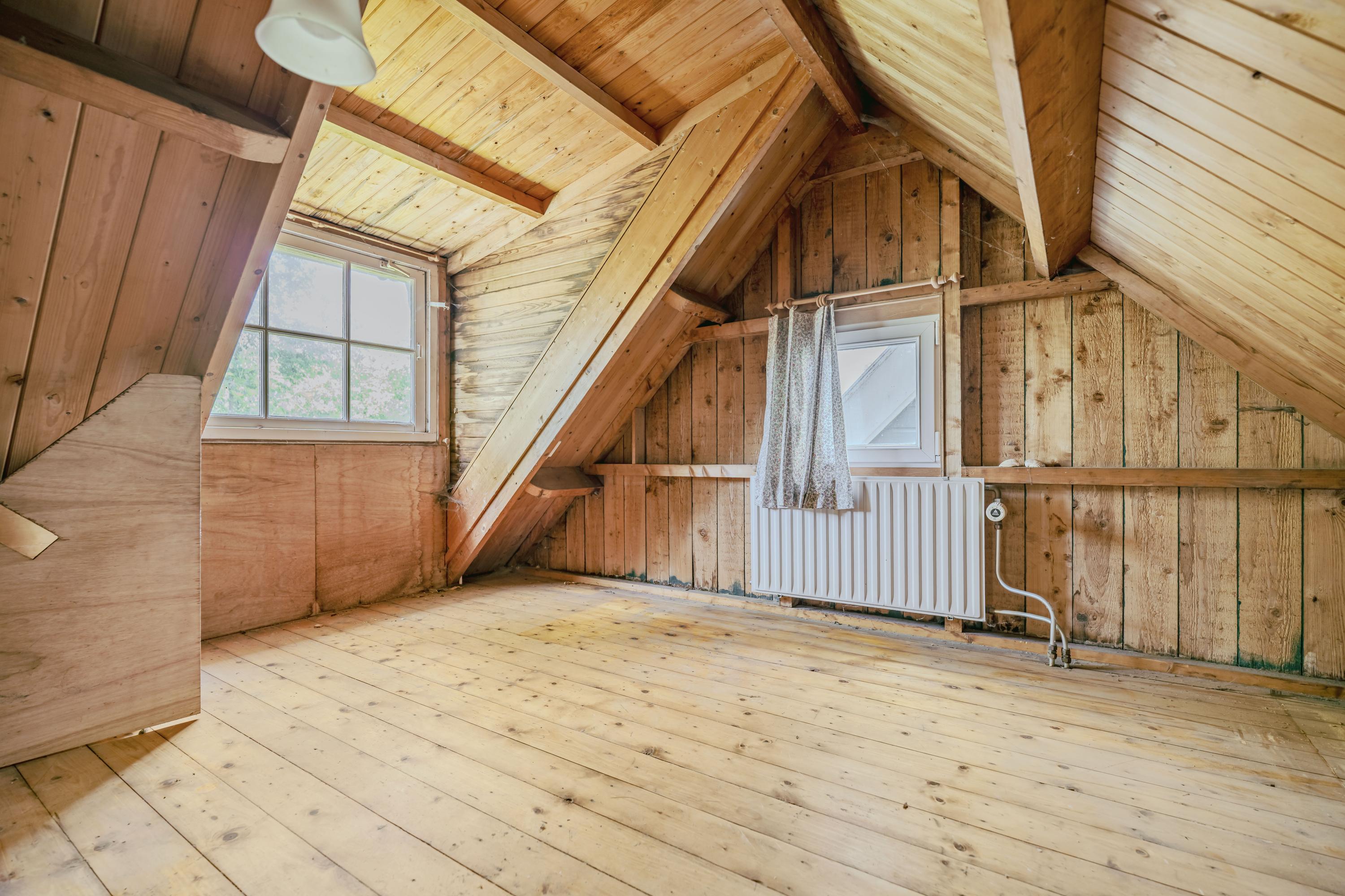 A wooden spiral staircase leads to the first floor, where a landing provides access to a spacious bedroom occupying the entire level. The room offers beautiful views over the River Amstel and the surrounding landscape. Practical storage spaces have been created beneath the sloping roofs. At the front, a window alcove provides a seating area with a view of the river.