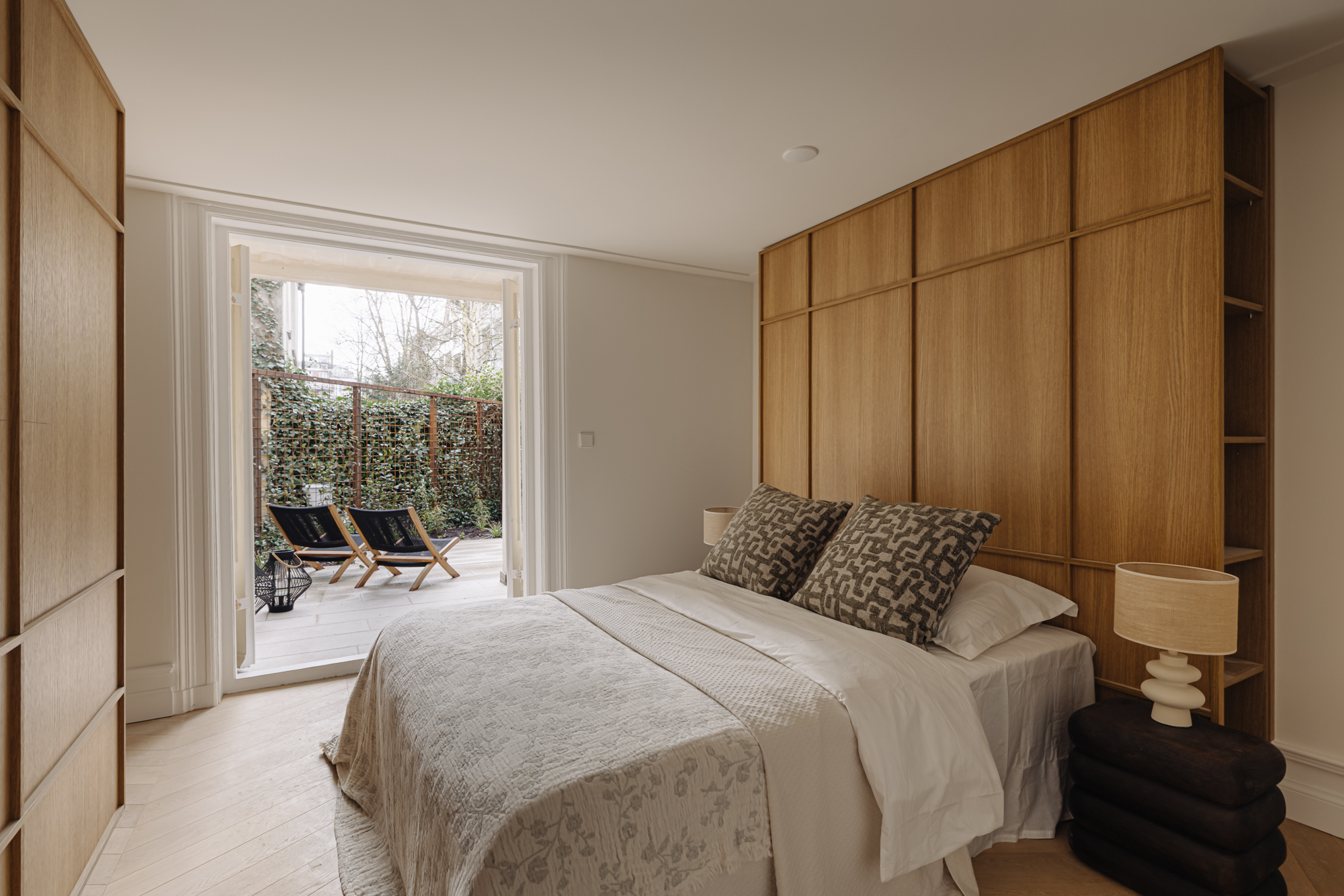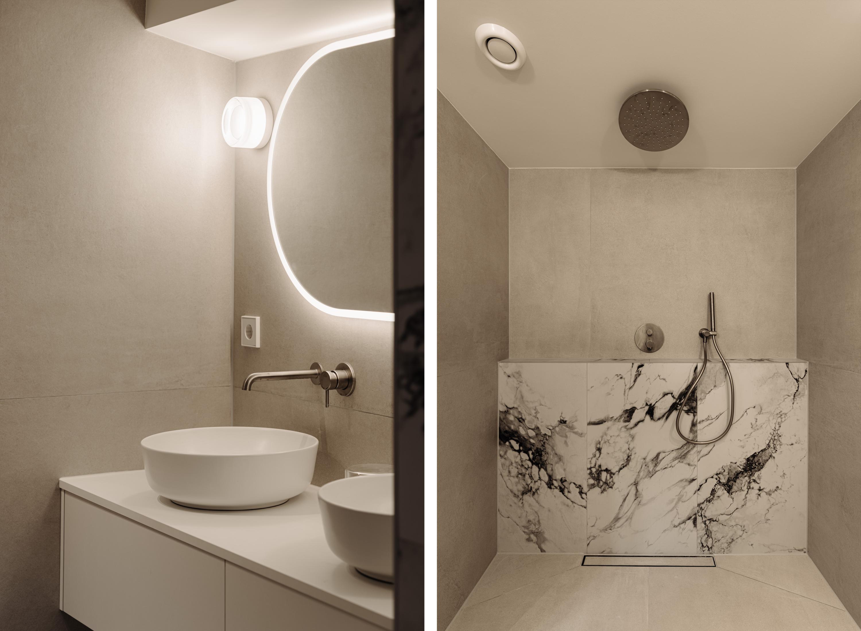 The lower ground floor is arranged as a comfortable sleeping level. At the front is the spacious master bedroom with built-in wardrobes and an en-suite bathroom featuring a walk-in rain shower and double washbasin. At the rear is the second large bedroom, also with its own bathroom equipped with a walk-in shower and washbasin. From this room, there is access to the attractively landscaped rear garden of approximately 18 m². A separate toilet is accessible from the hallway. In addition, the landing provides access to an internal storage room with connections for a washing machine and dryer.
