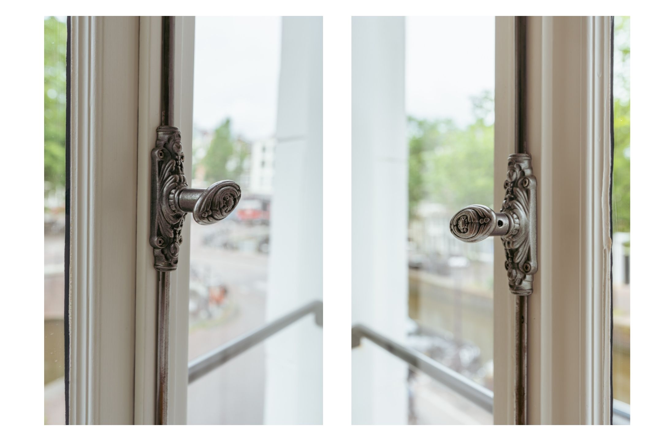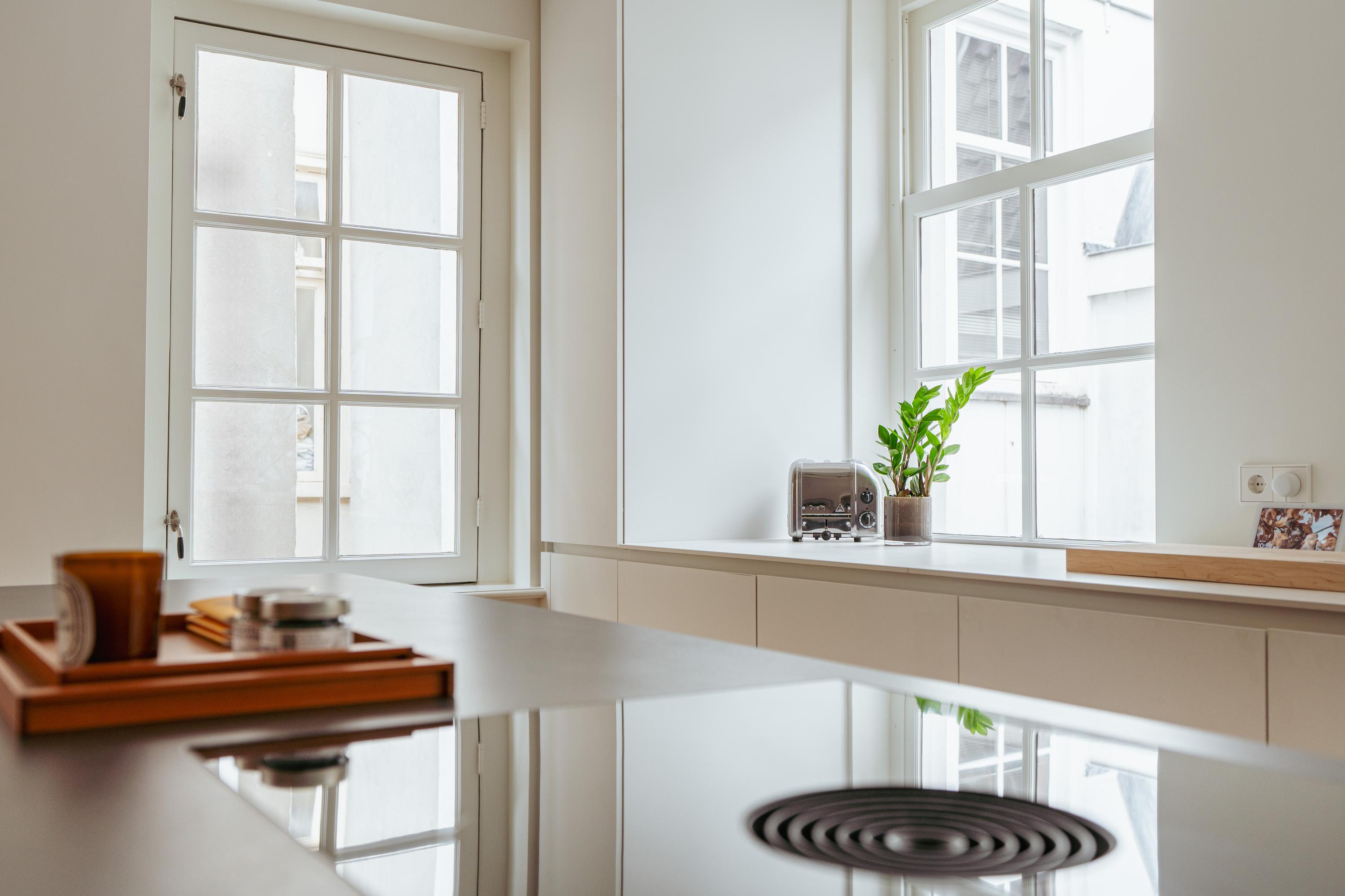 A tidy landing with built-in storage leads to two bedrooms. This floor features a beautiful wooden floor and premium finishes. At the front is a spacious bedroom with a custom-made built-in wardrobe that seamlessly integrates into the design. Large windows flood the space with natural light and offer a stunning view of the canal and historic facades. The second bedroom at the rear also includes built-in wardrobes. Centrally located on this floor is the modern bathroom, complete with a walk-in shower, sleek vanity, and stylish toilet — all finished to a high and timeless standard. Elegant steel-framed doors close off the bedrooms, combining functionality and design in harmony with the home’s aesthetic.