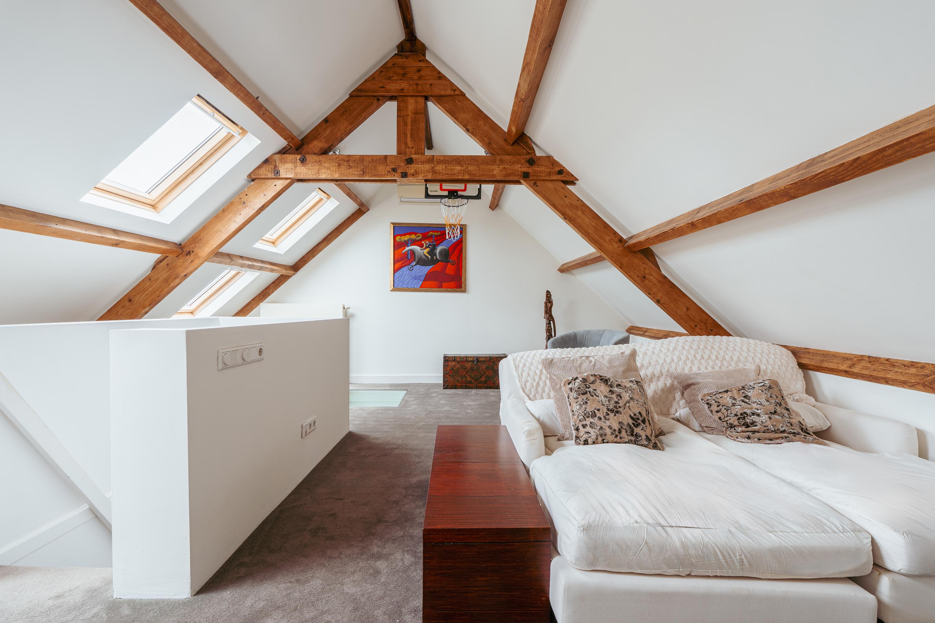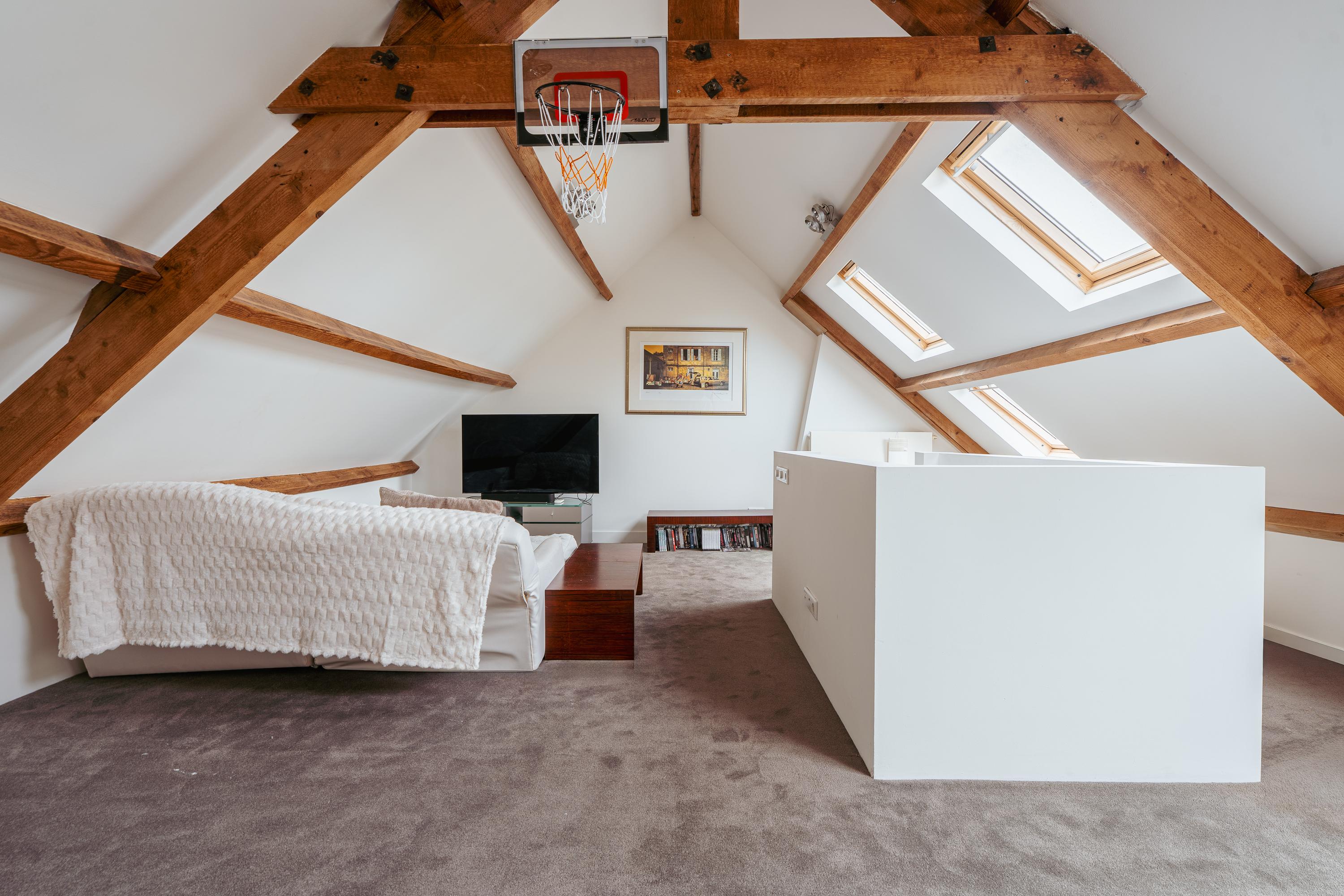 The top floor comprises a generous bedroom with an impressive ceiling height, giving the space a particularly bright and airy feel. This floor is also well-suited for use as a study, guest room or studio.
