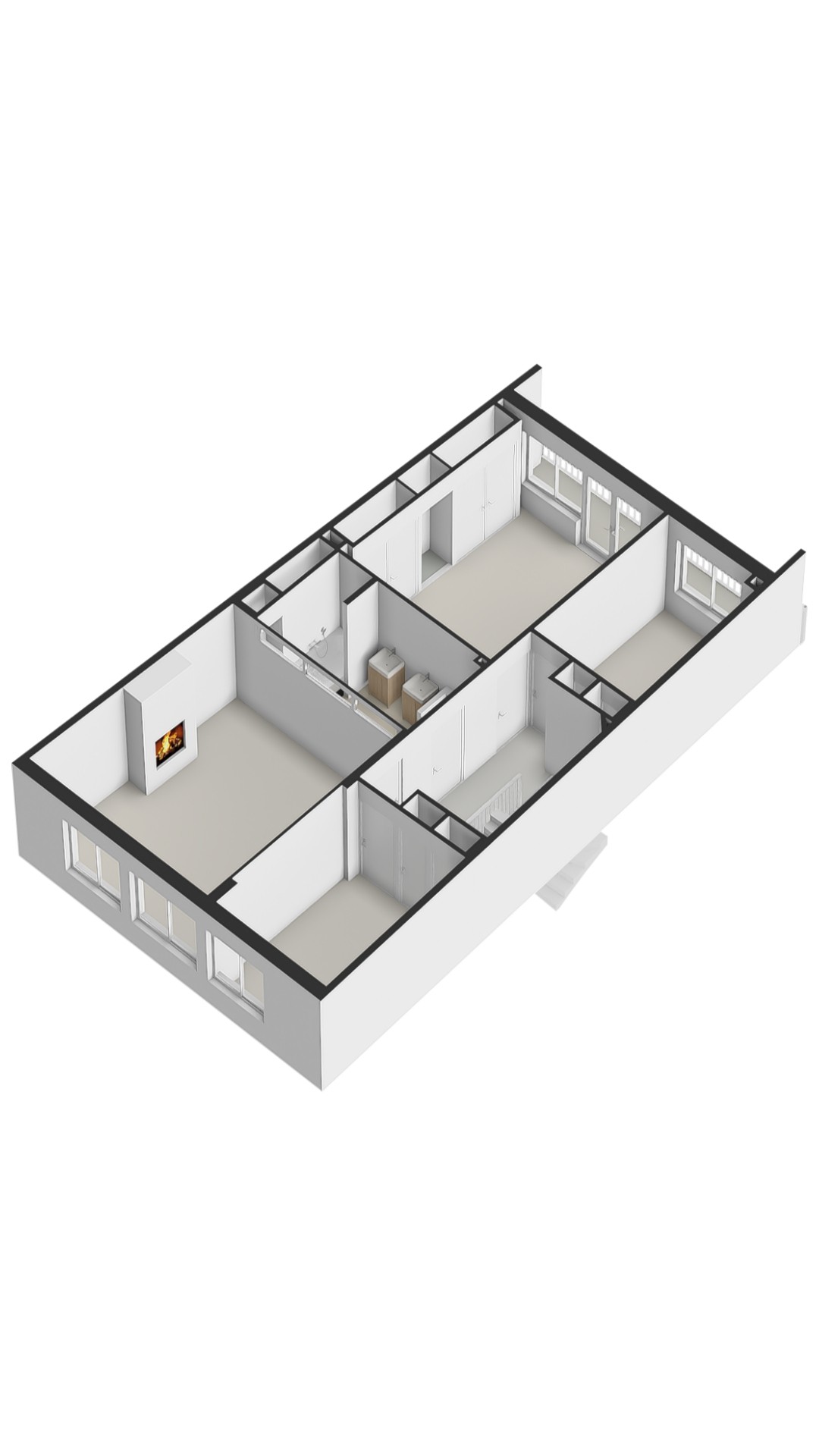 Landing with access to four well-proportioned bedrooms, the largest of which is located at the rear and features built-in wardrobes and access to the balcony. The other three rooms are perfectly suited as bedrooms, children’s rooms or home offices. Centrally on this floor is the bathroom, fitted with a bathtub with shower, double washbasin and toilet.