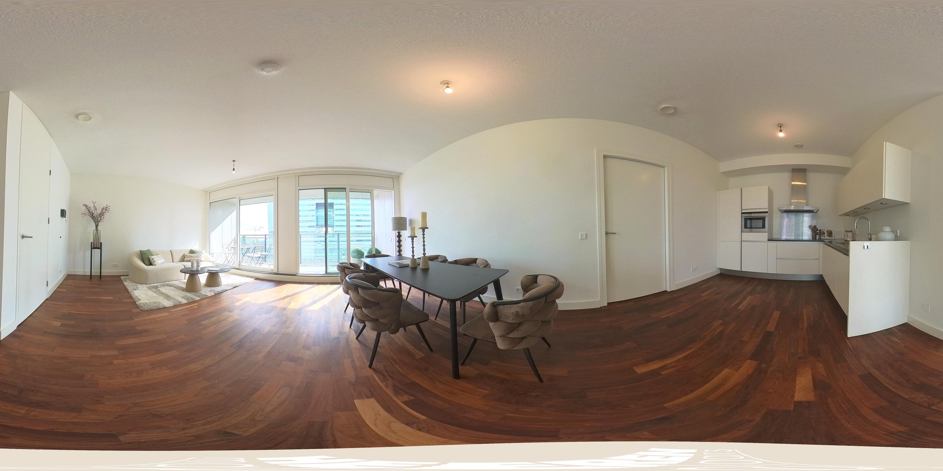 Upon entering the 8th floor, you step into a spacious hallway with a meter cupboard, separate toilet, and room for a wardrobe. From here, you enter the bright and airy living area, where the views immediately catch your eye, creating a sense of openness and calm. At the front, sliding glass doors give access to the generous balcony that spans the full width of the apartment — an ideal spot to relax, enjoy breakfast, or take in the view. The open-plan kitchen is situated at the rear and is equipped with modern built-in appliances, including a fridge, freezer, induction hob, Quooker, and dishwasher.
