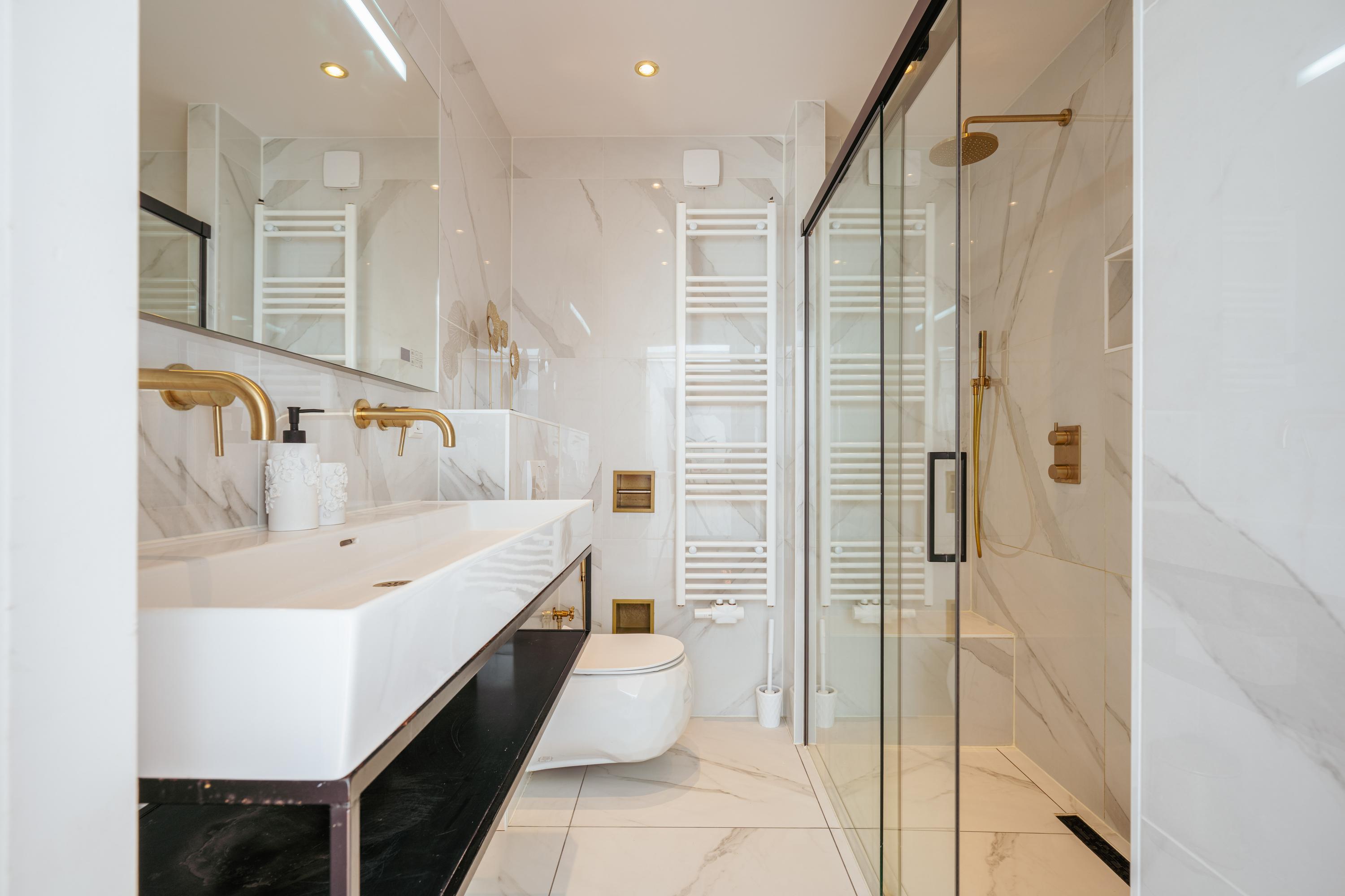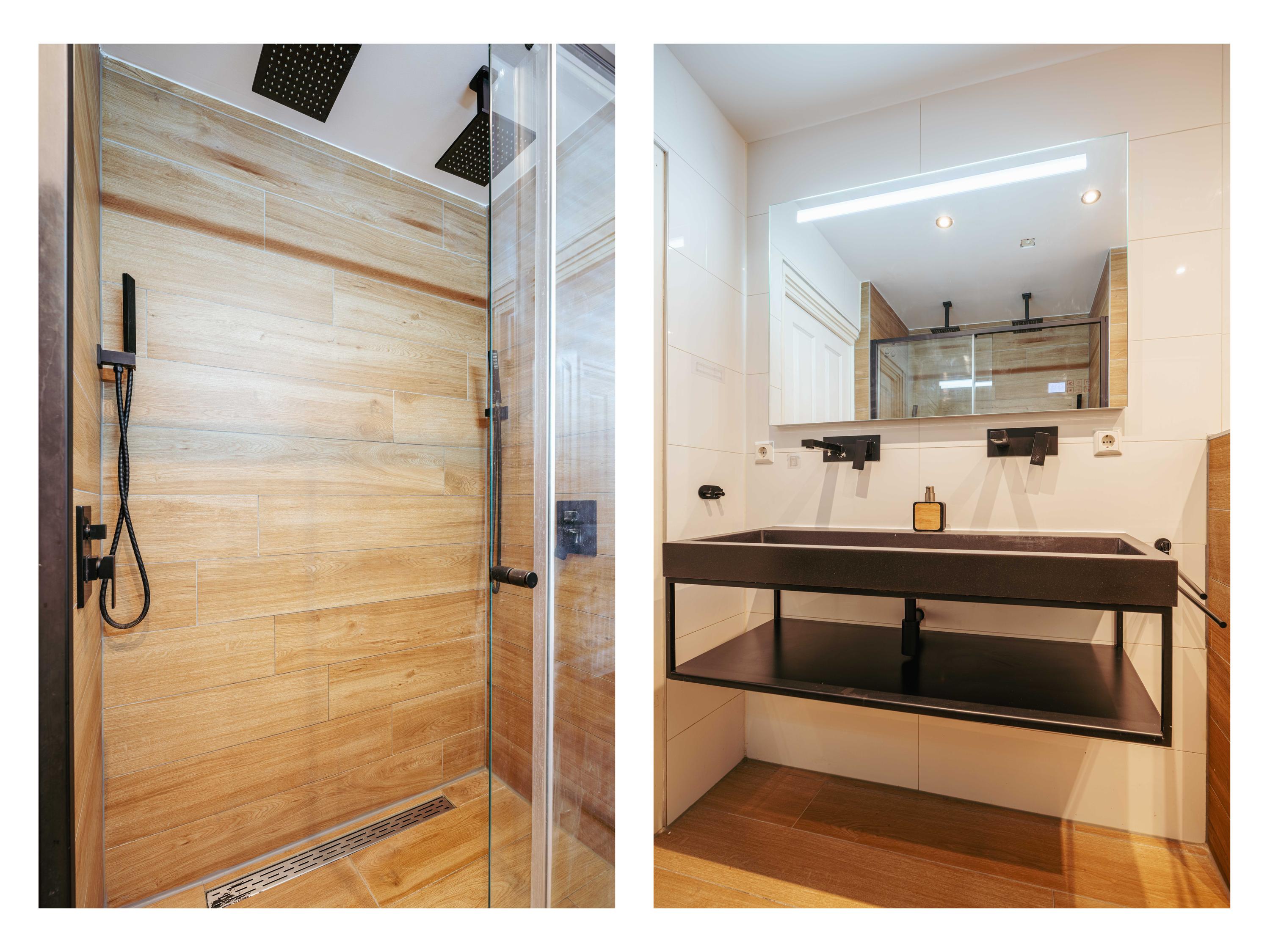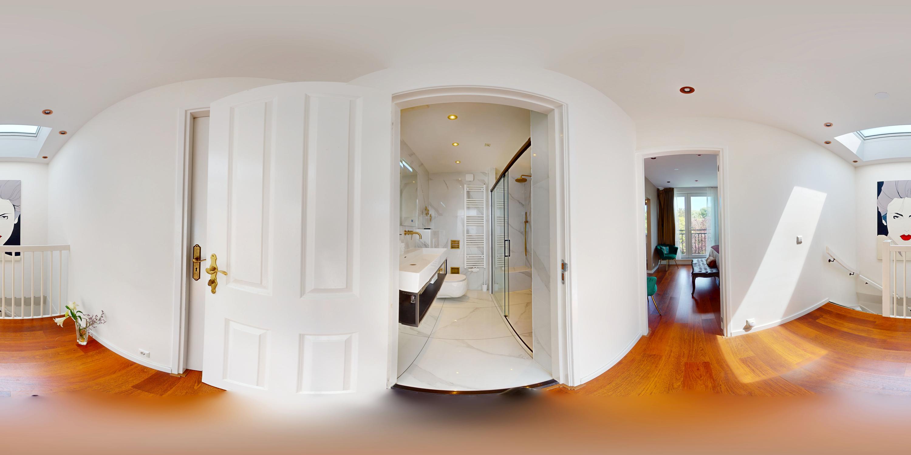 On the top floor are two more generous bedrooms, also divided between the front and rear. The second bathroom is centrally located and equipped with a double washbasin with cabinet, a double rain shower and a toilet - ideal for larger families or guests.