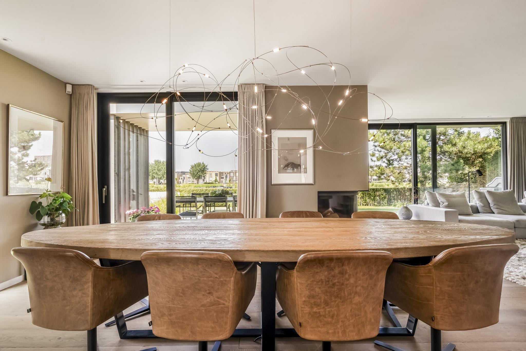 From the spacious hall with high ceilings, you enter the generous living area with large glass windows that immediately offer a beautiful view. The space has an impressive ceiling height and a cozy fireplace. Various sliding doors lead to the carefully landscaped garden with its own dock on the water. The garden features a large hardwood terrace, lawn and green borders.