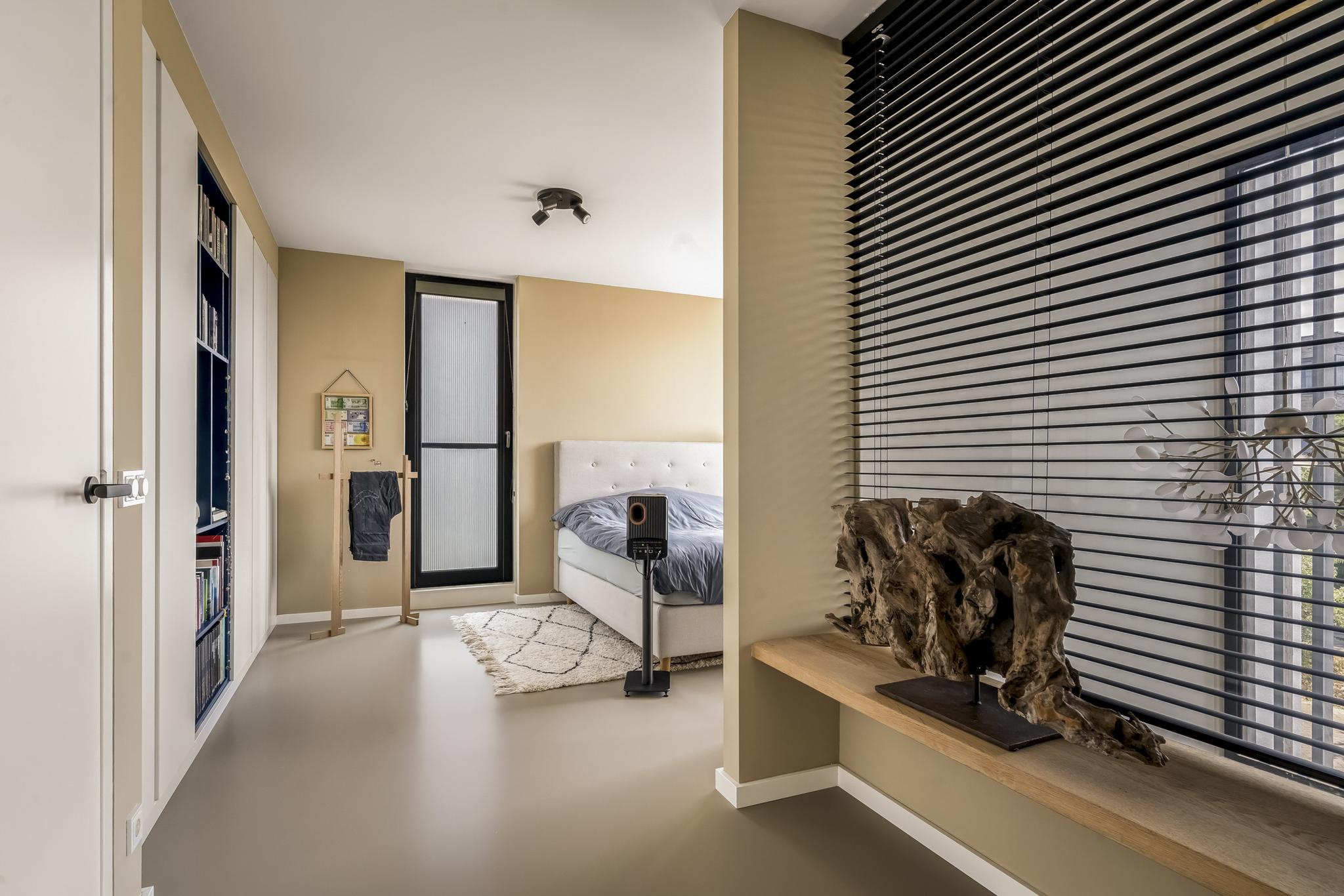 The spacious bedroom at the front can easily be divided into two bedrooms and offers a nice view of the entrance. This room is equipped with electric screens.