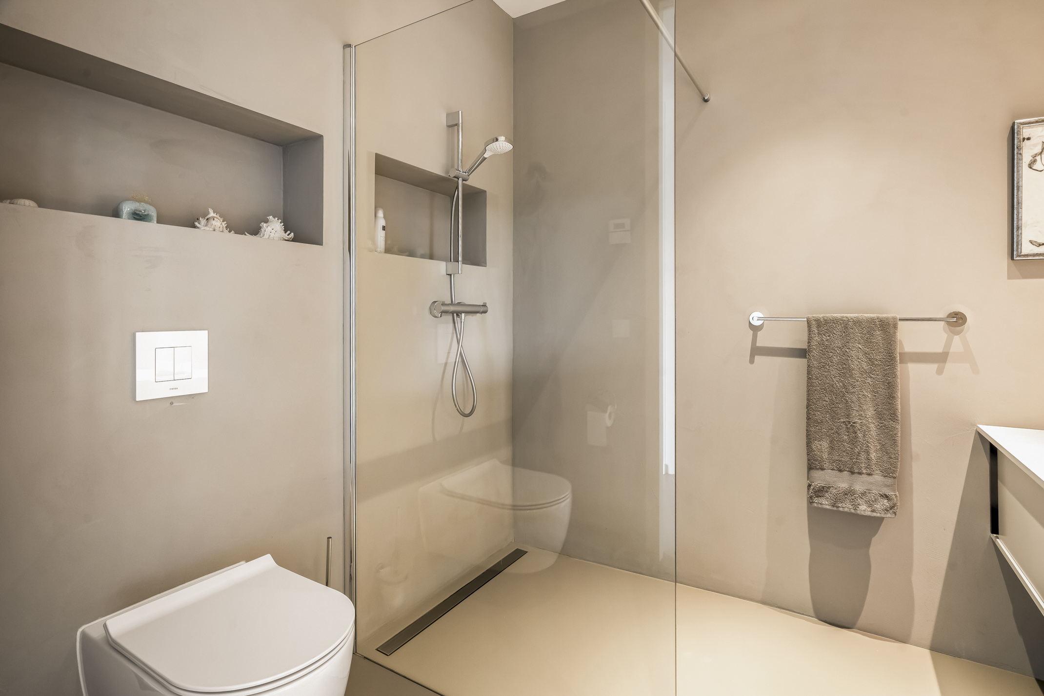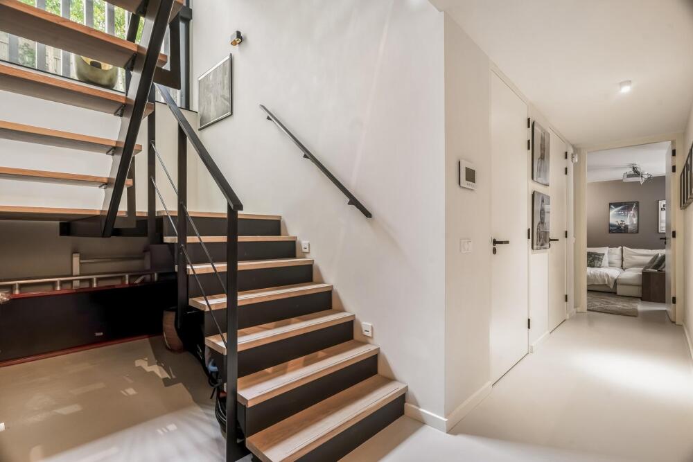 The second floor provides access to the sunny rooftop terrace with unparalleled privacy. On the landing, there is a kitchenette with a fridge and sink.