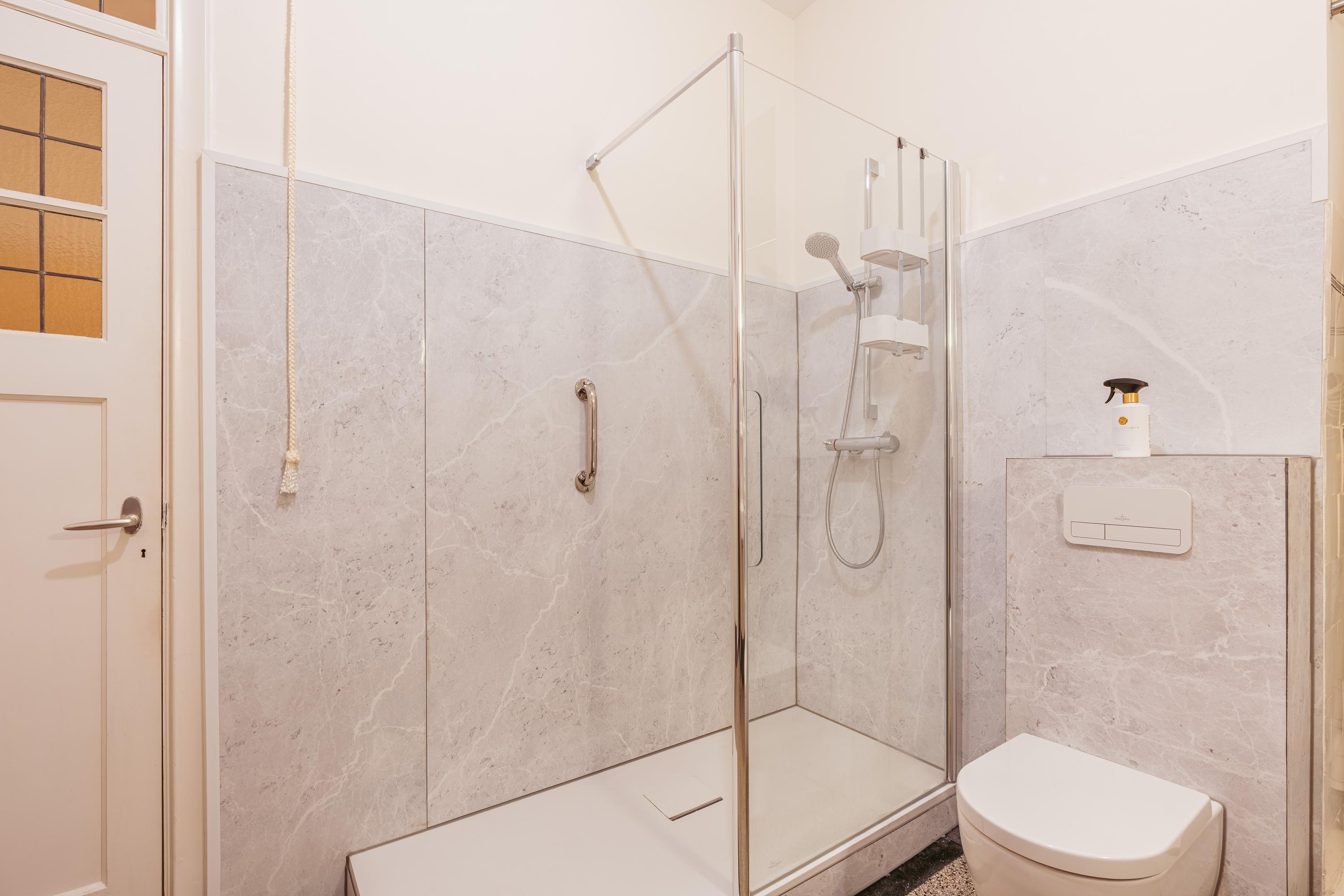 The bathroom is centrally positioned within the apartment and is neatly finished and practically arranged, featuring a walk-in shower, double washbasin and toilet. Furthermore, there is space for a washing machine and dryer setup, ensuring maximum convenience.