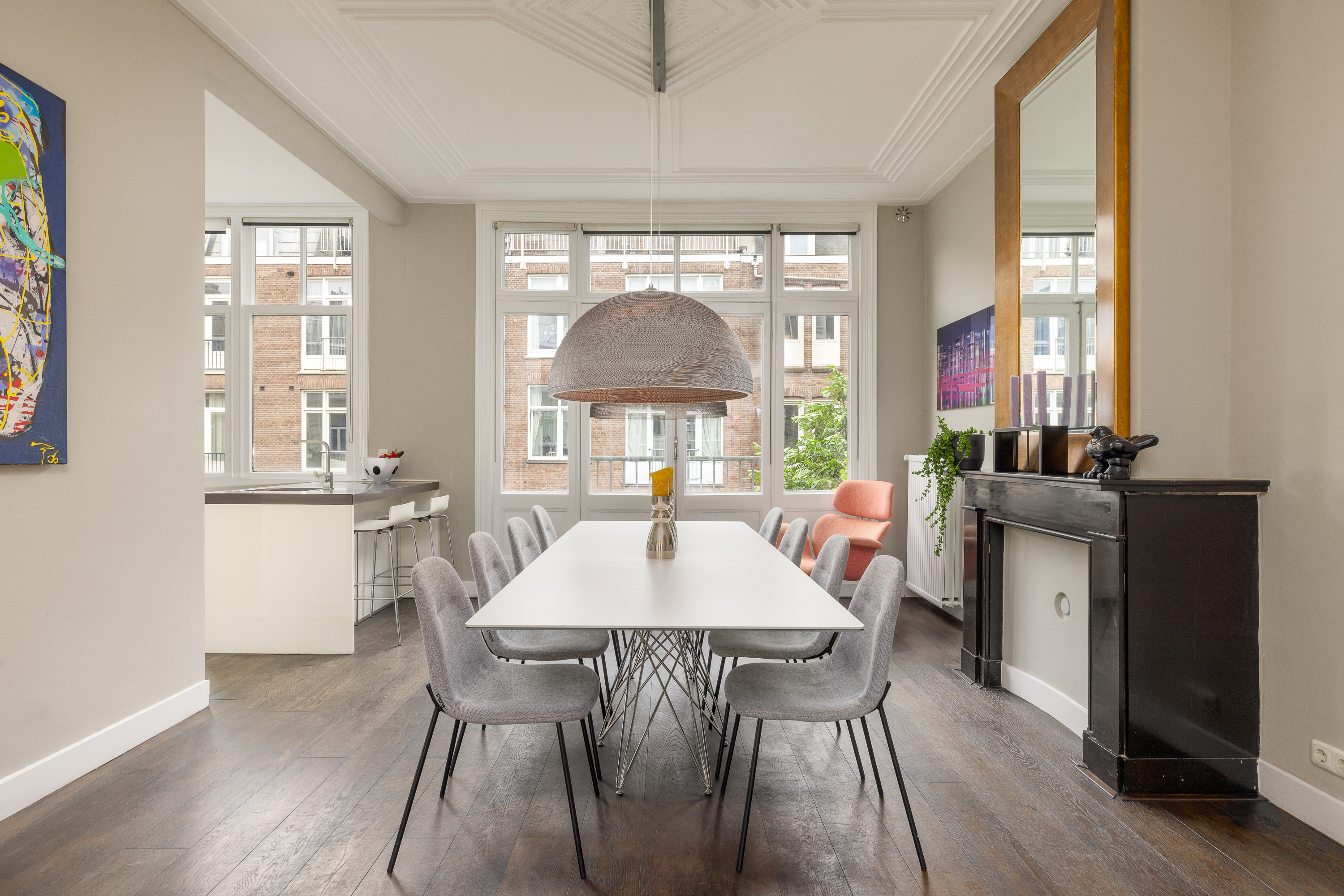On the landing, you will find a separate toilet with a sink. From the landing, you have access to the spacious through-living room. At the front of the living room, there is enough space for both a formal sitting area and a cozy TV corner. There is also a beautiful balcony with a view of Valeriusstraat and Amstelveenseweg. At the rear of the house is the dining area, open kitchen with island, and a French balcony. The kitchen is equipped with a 5-burner gas stove, oven, microwave, and a fridge/freezer combination. Due to the abundance of glass and the ceiling height of 3.07 meters, this floor is particularly light and spacious.