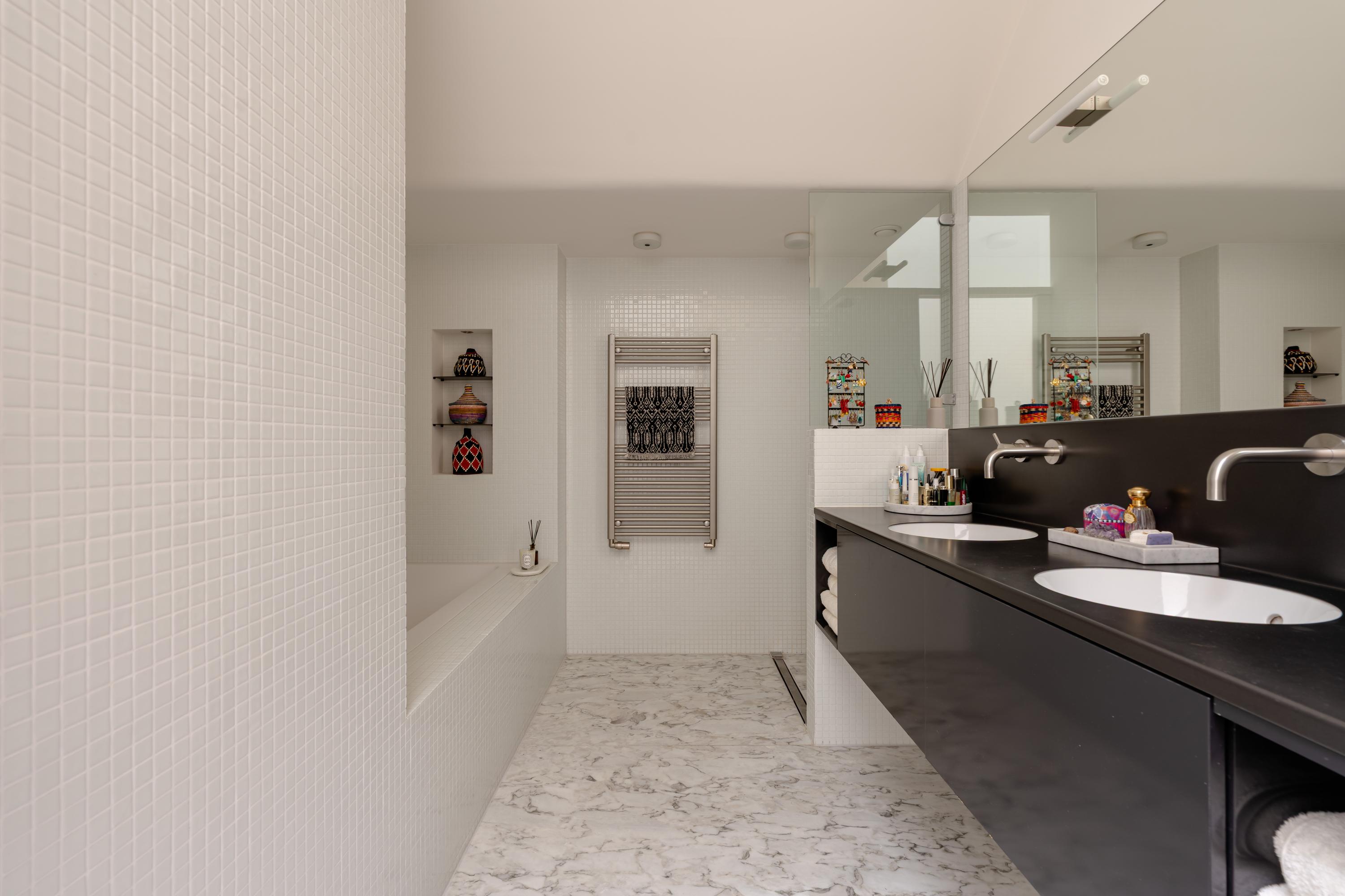 At the heart of the space is a large kitchen island with an inviting bar setup. Adjacent to the kitchen is a practical pantry, suitable for storing appliances and provisions. French doors provide access to the covered terrace and the sunny south-facing garden. The garden forms a natural extension of the kitchen, allowing you to enjoy a spacious and atmospheric living area during the summer months. Additionally, built-in cupboards and a separate toilet are present. The modern finish of the kitchen contrasts beautifully with the more classical elements found on the other floors.
