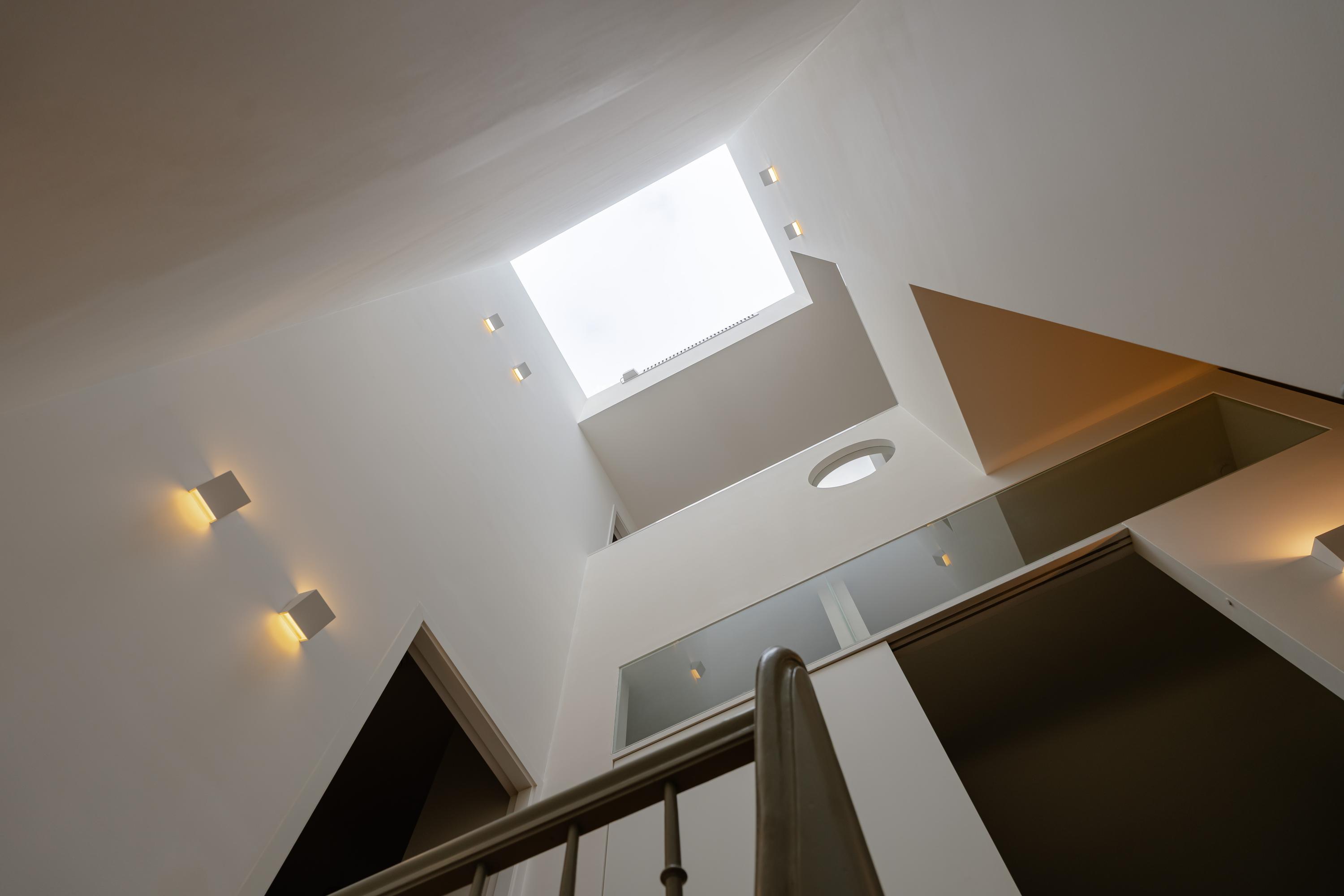 Upon entering, the playful influx of natural light immediately stands out. A large skylight at the top of the house allows daylight to flow through the central staircase and spacious atrium, creating an open and bright atmosphere throughout all floors.