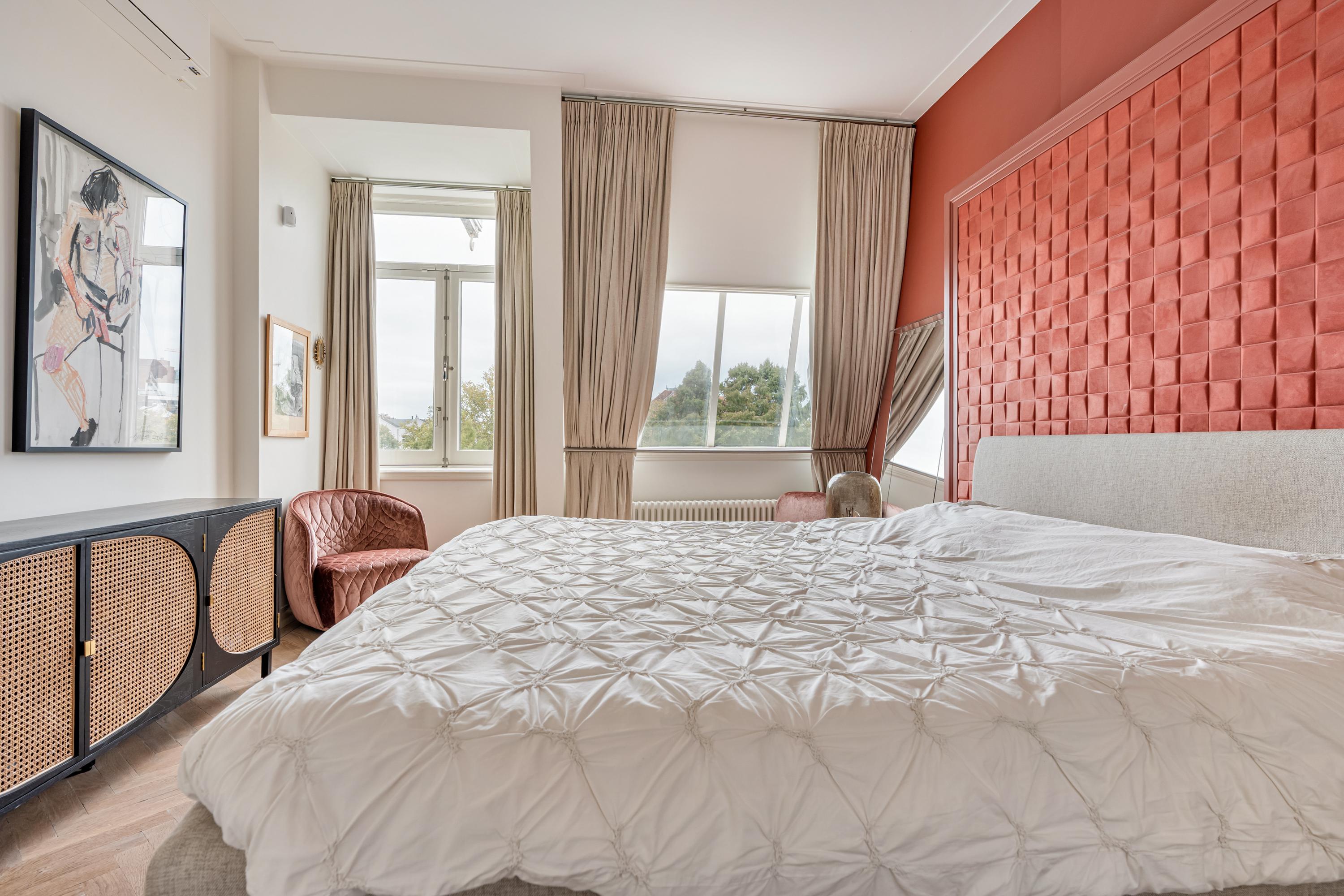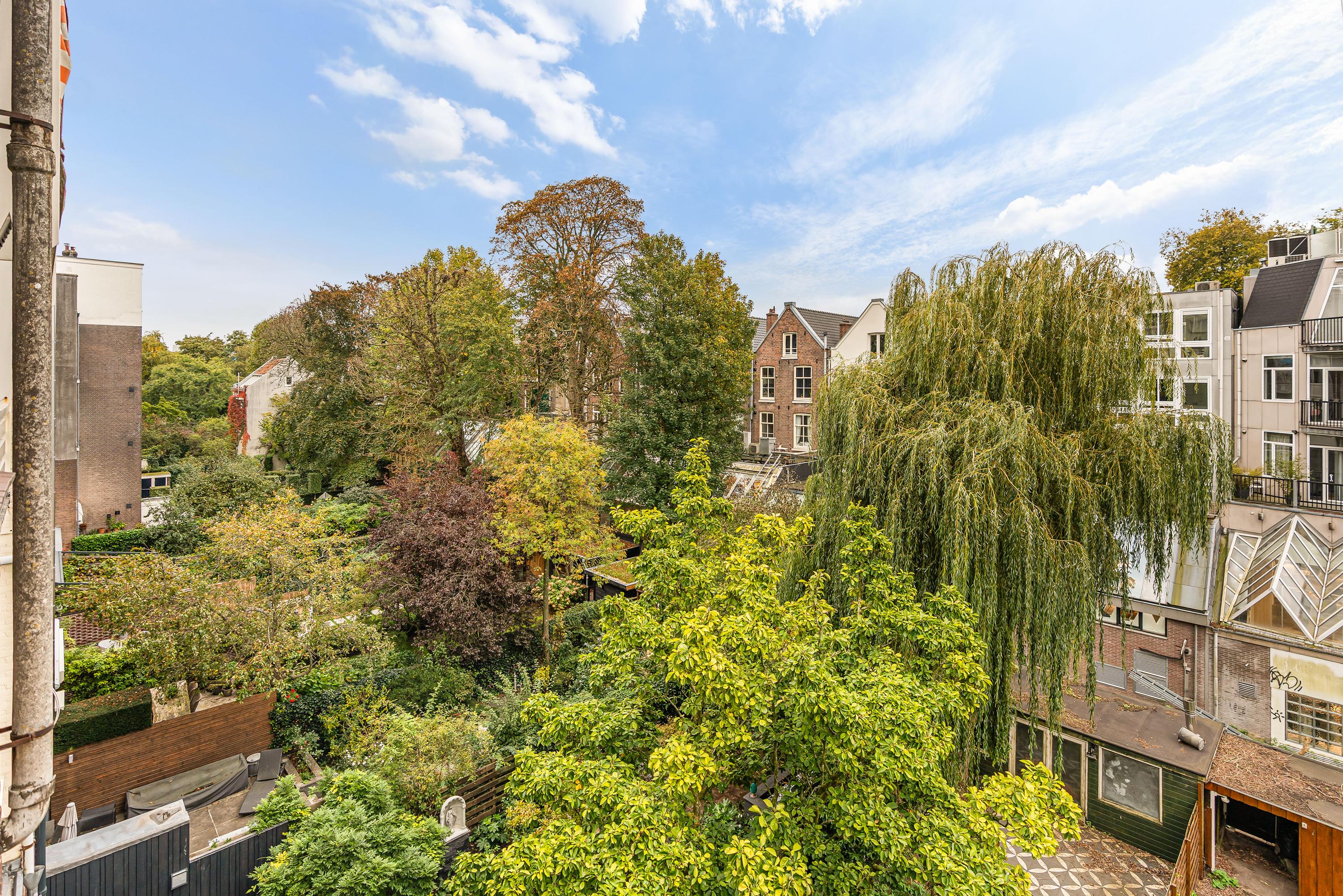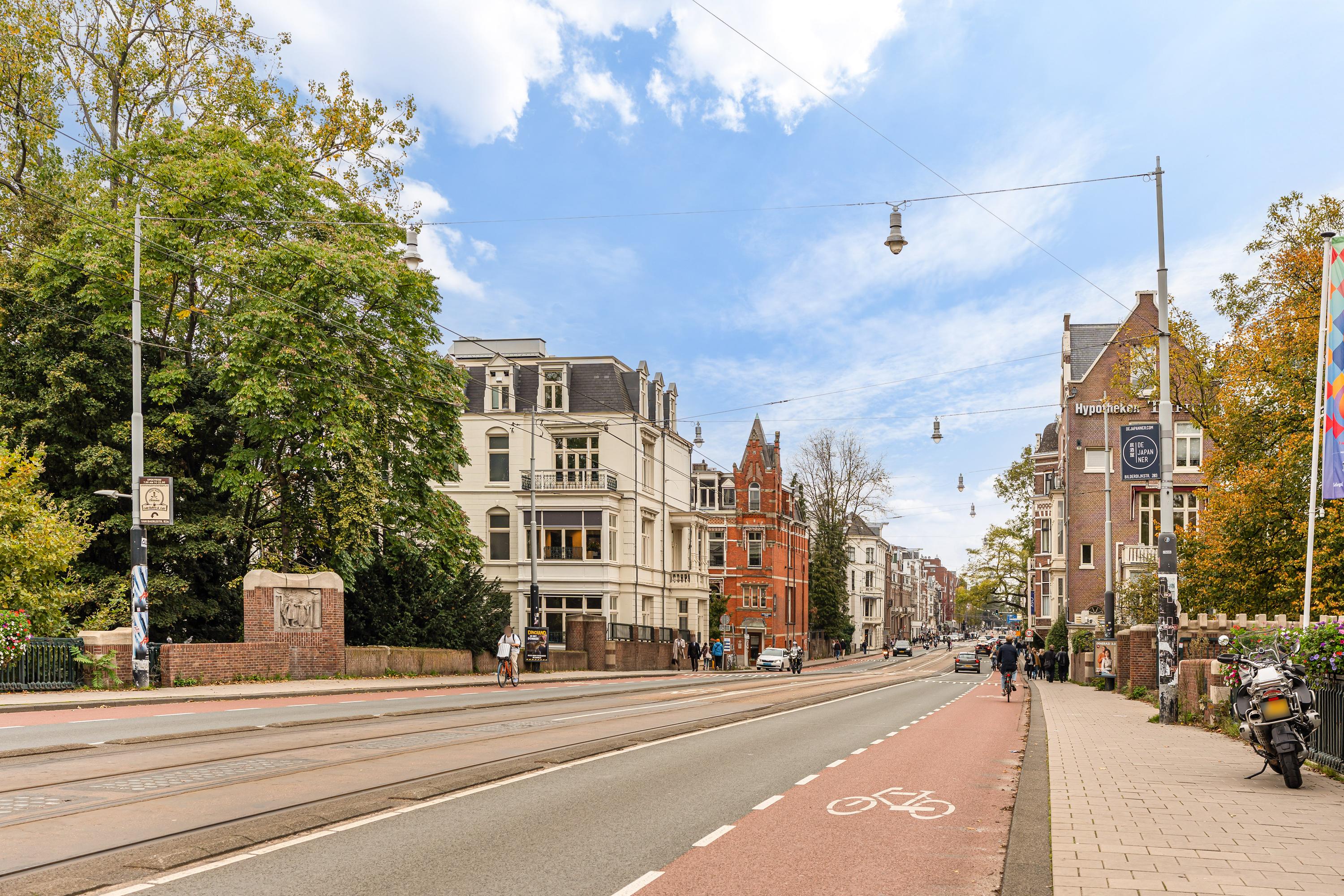 On the distinguished Vossiusstraat, directly bordering the Vondelpark, lies this remarkable upper residence of approximately 183 m², spread over two floors and featuring several outdoor spaces, including a spacious roof terrace of no less than 59 m². The home combines the character of a classic Amsterdam townhouse with the comfort of a modern residence. High ceilings with original ornaments, a light herringbone floor, wooden en-suite doors and marble details give the interior timeless elegance, while the layout and finish create a sense of calm and warmth.