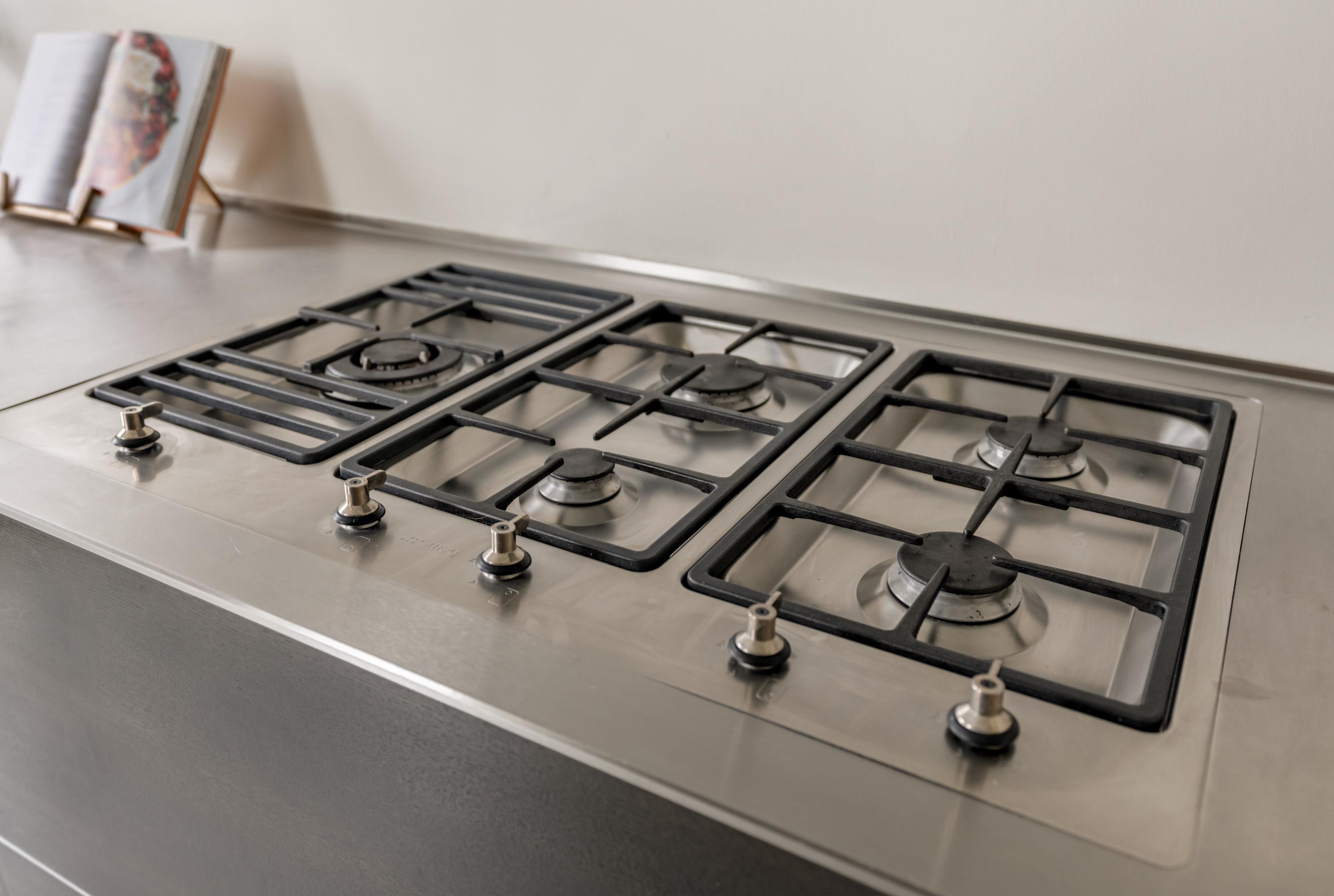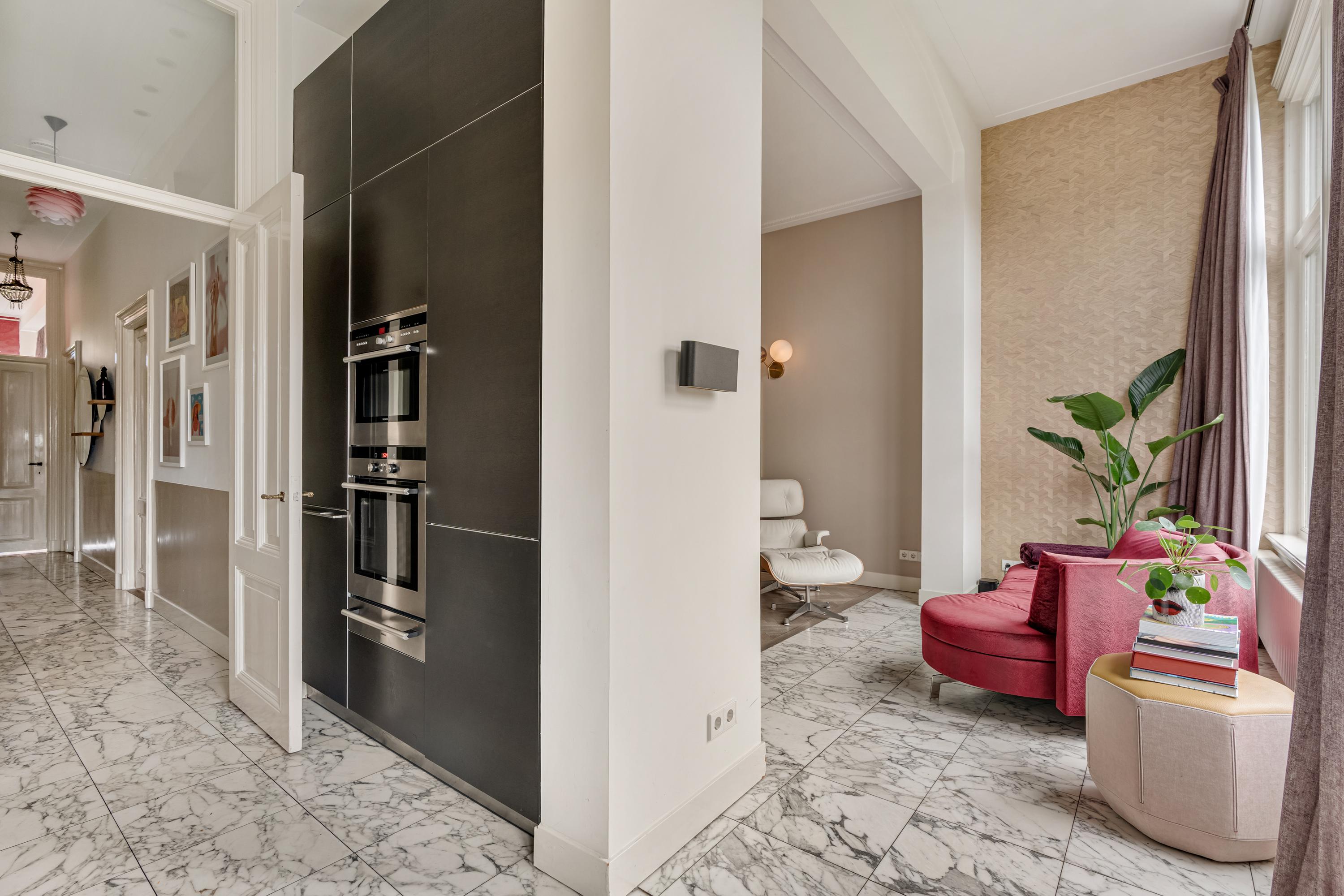 At the rear is the semi-open kitchen, connected to the dining area. The kitchen is modern and features a marble floor and high-quality built-in appliances, including a five-burner gas hob, Quooker tap, fridge-freezer, oven and microwave with plate warmer, and a dishwasher. A stylish and functional space with plenty of storage.