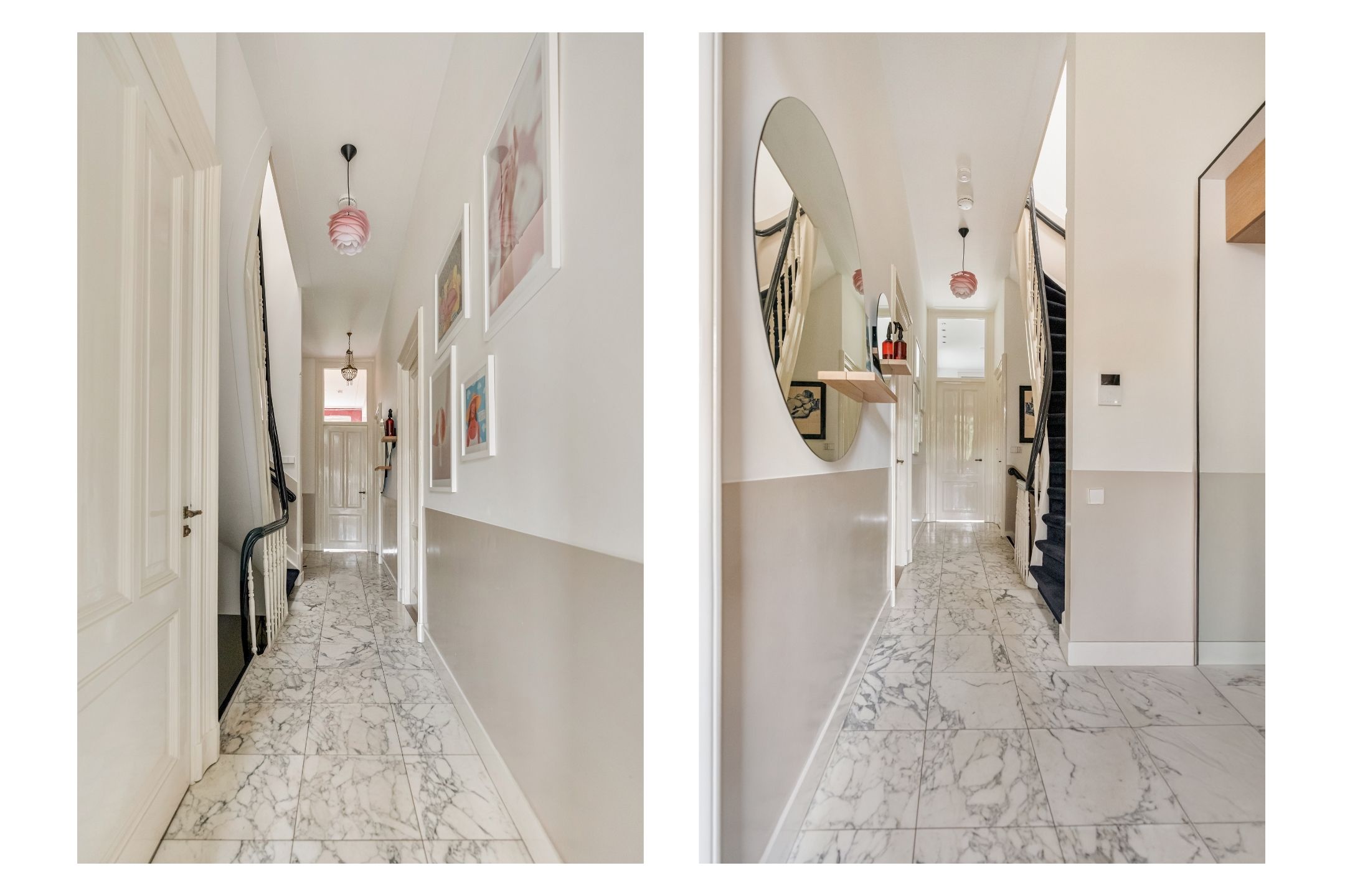 Via a private entrance, you reach the second floor of this spacious and characterful apartment of approximately 184 m². The hallway, finished with a marble floor, provides access to all rooms and includes a cloakroom and a guest toilet with wash basin.