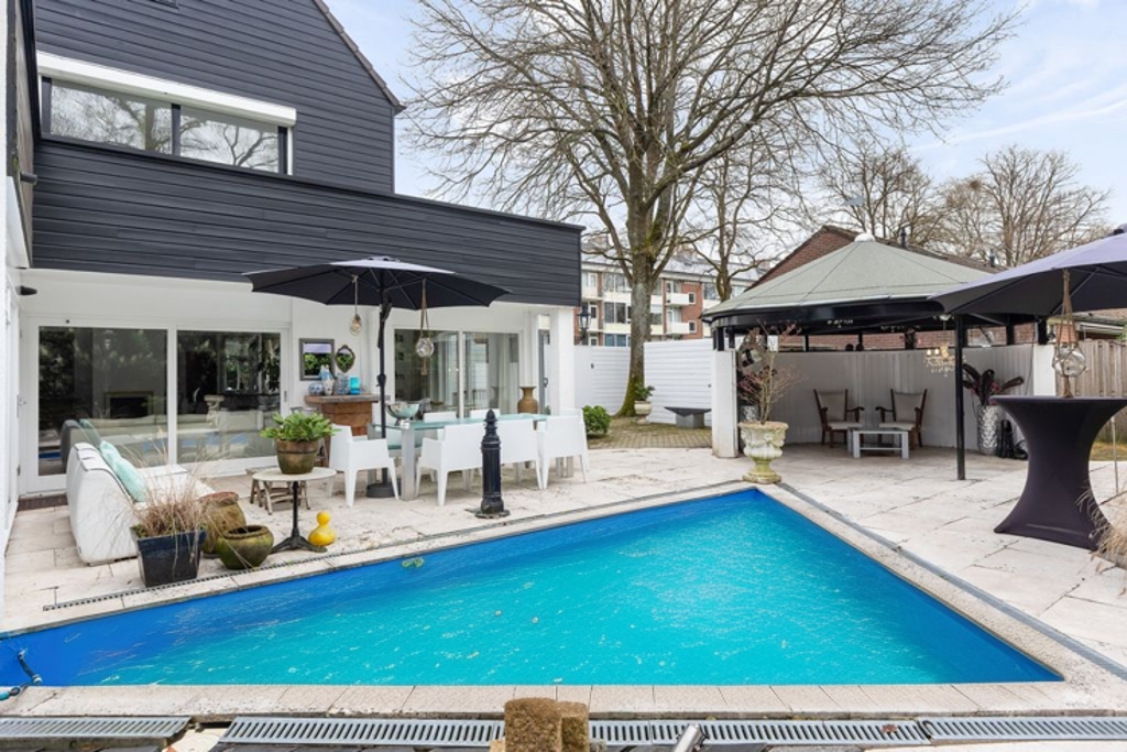 With a living area of no less than 230 m², this property offers exceptional space for both living and working. The house was designed and built in 1987 by an architect as his own home, which is evident in the quality of the construction and the thoughtful layout. The entrance hall with double doors leads to a spacious T-shaped living room and a spacious kitchen-diner, both with underfloor heating. The garden room, insulated former garage, six bedrooms and two bathrooms make the house multifunctional. The many windows provide plenty of light and contribute to the pleasant living environment.