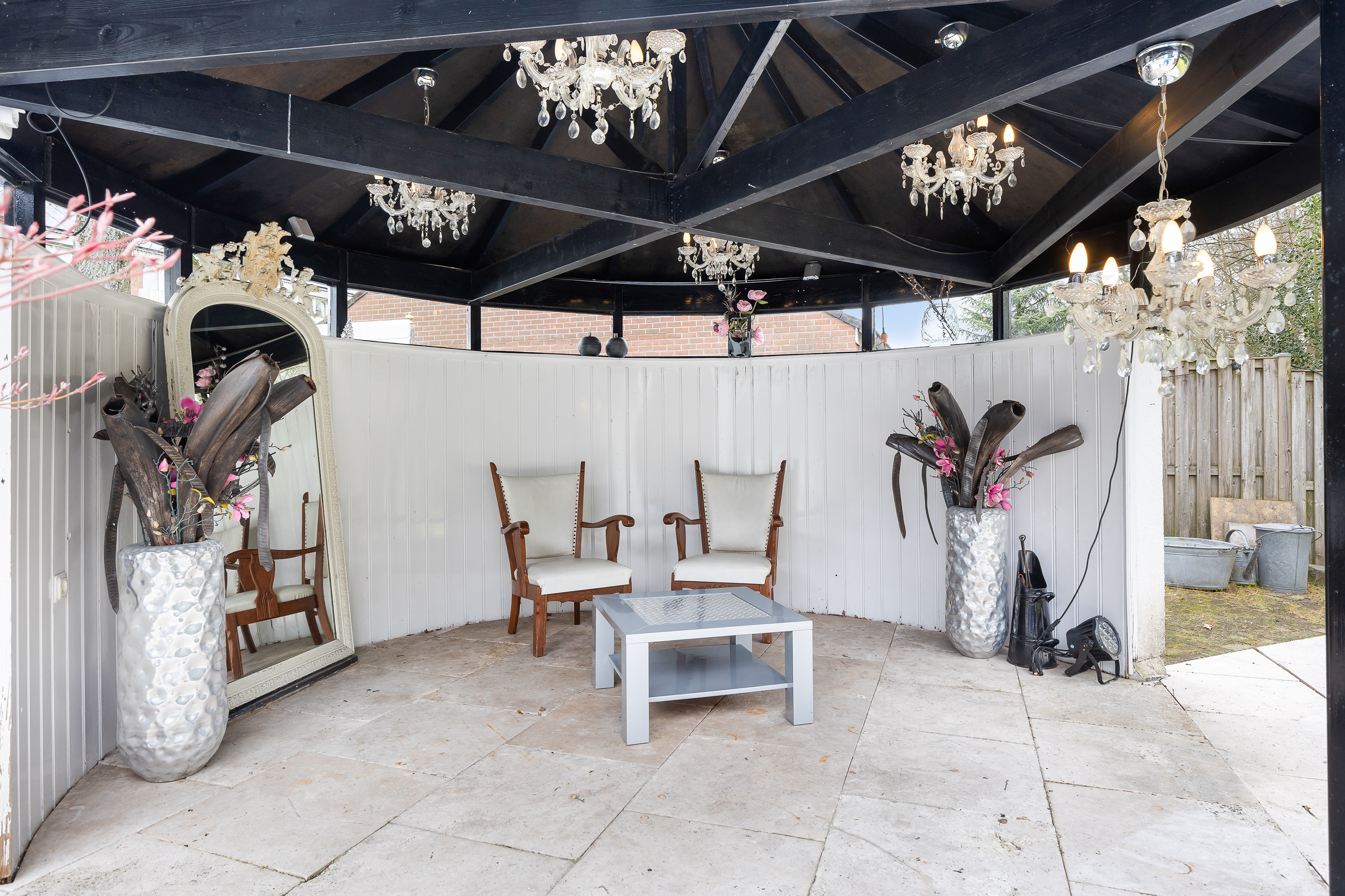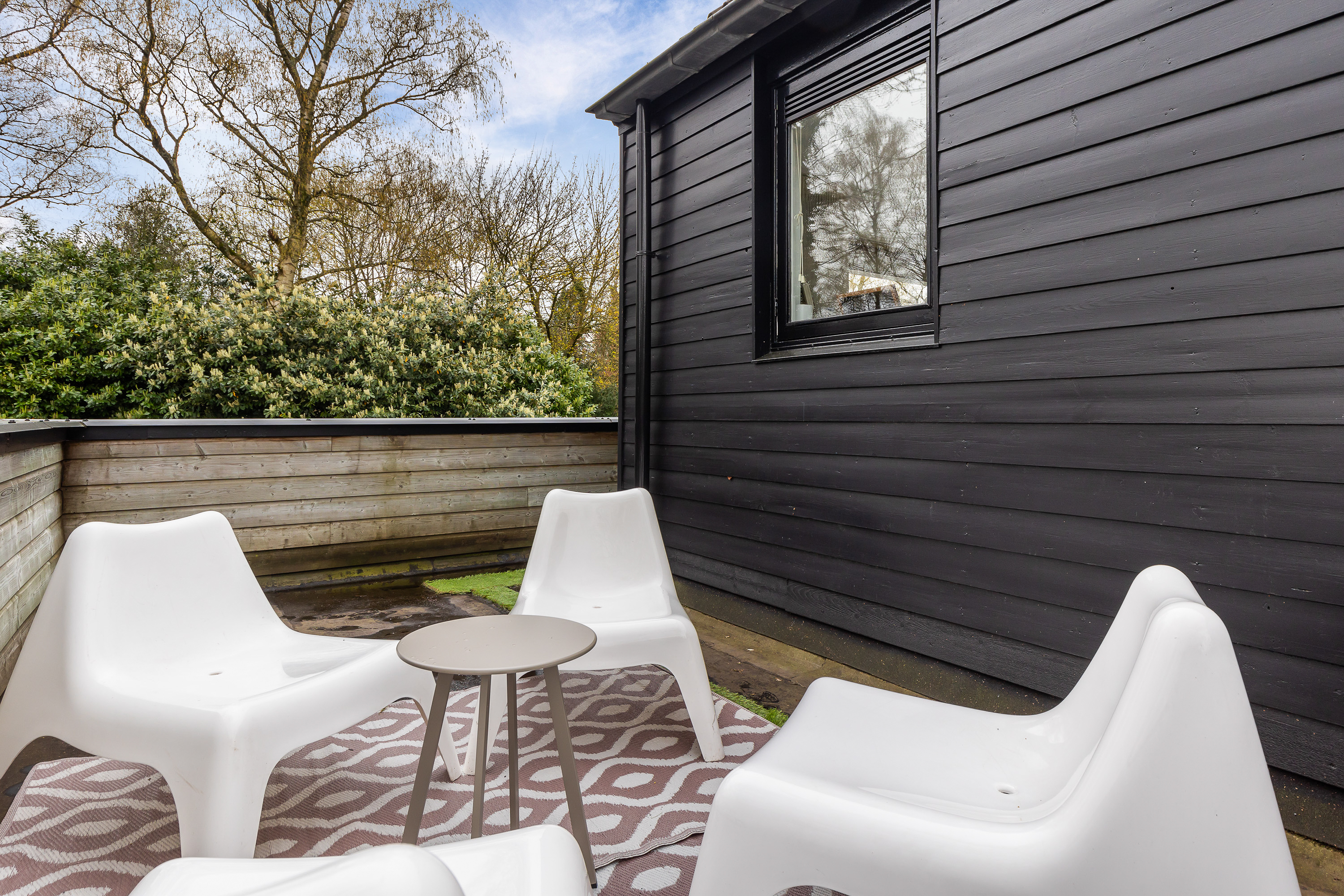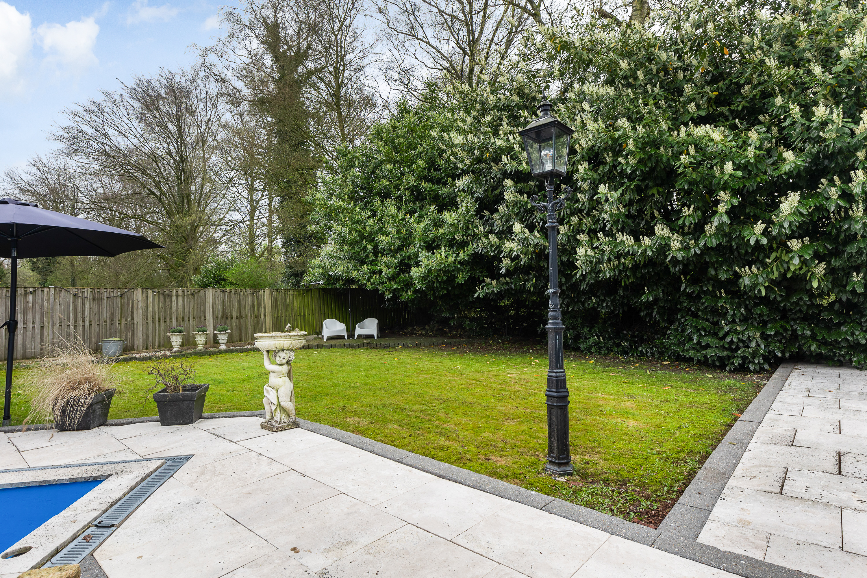The garden is one of the great assets of this property. Facing south and bordering a communal green area with pond, the rear garden offers tranquillity, privacy and sunshine all day. The large terrace leads to an attractive pavilion with lounge area. There is also a playful dragon-shaped swimming pool, a barbecue area and a spacious wooden shed. The low maintenance design makes the garden easy to lay out and maintain.