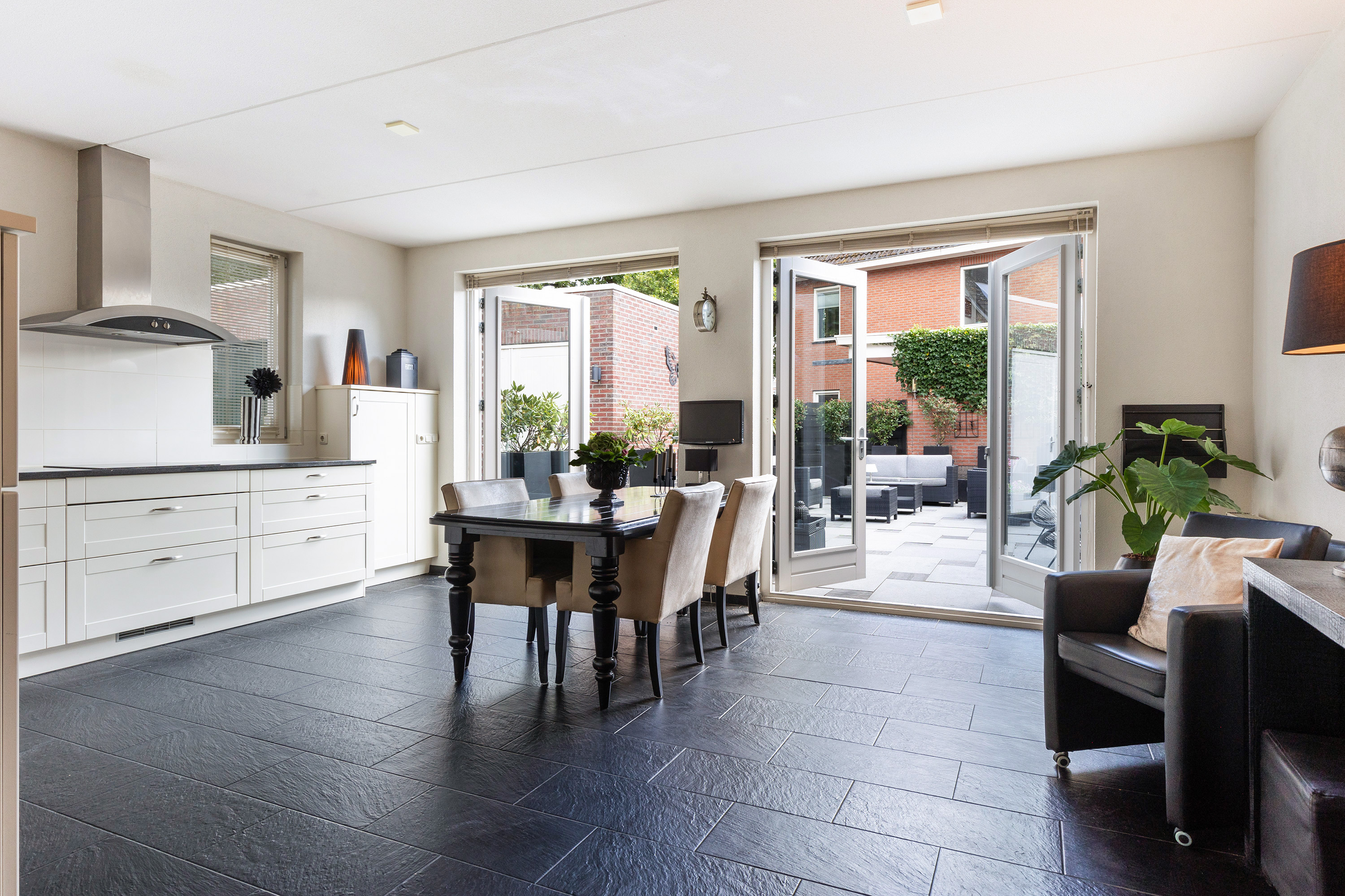 Aan de achterzijde bevindt zich de royale woonkeuken van circa 26 m². De keuken is in een praktische L-opstelling geplaatst en voorzien van diverse inbouwapparatuur, waaronder een vaatwasser, inductiekookplaat, koelkast en vrieskast. De ruime opzet biedt volop plek voor een grote eettafel, waardoor dit de ideale plek is om met het hele gezin of met vrienden samen te komen. Dankzij de twee openslaande deuren is er een directe verbinding met de zonnige achtertuin.