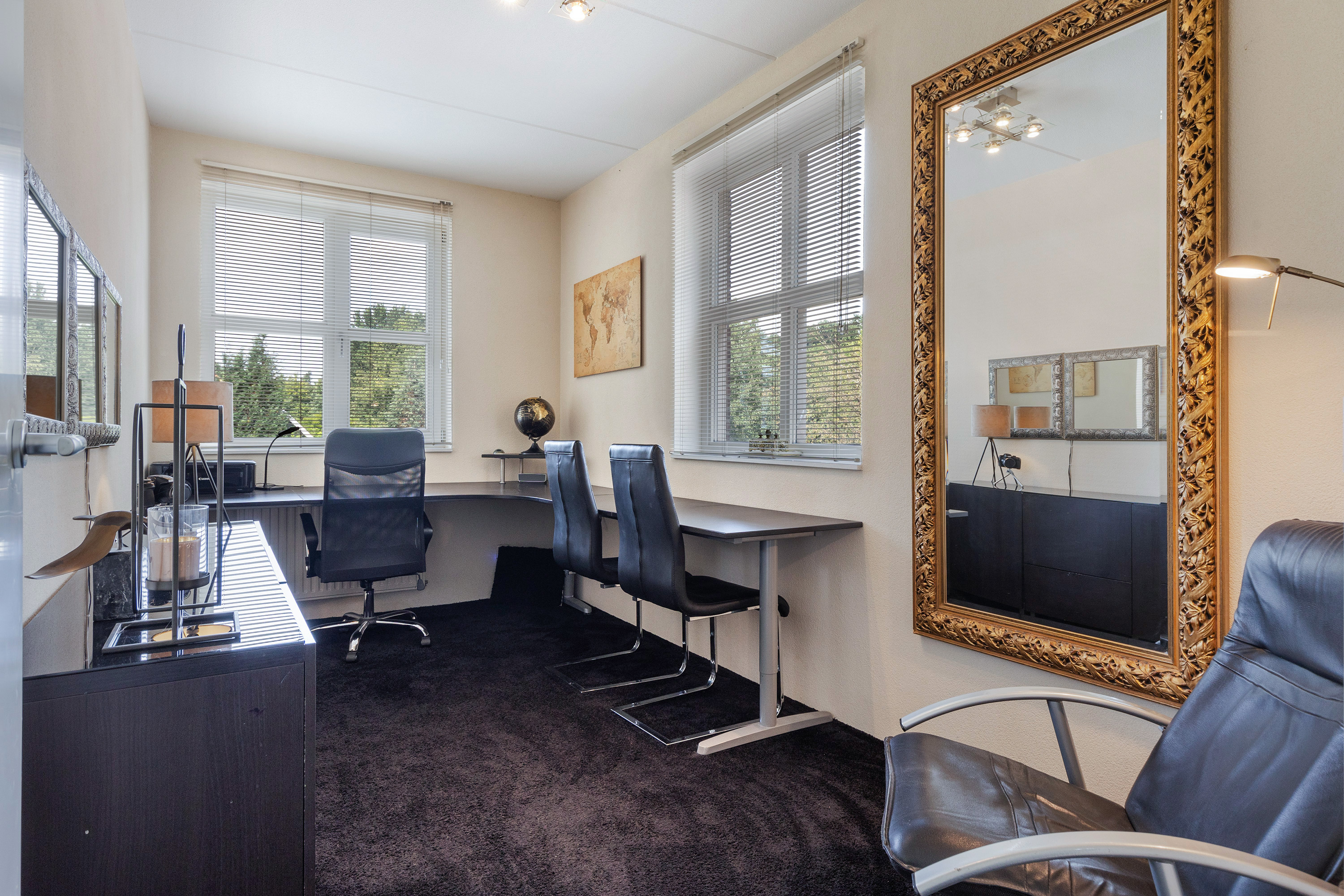 De overloop, voorzien van een zijraam, geeft toegang tot drie slaapkamers en de badkamer. De ouderslaapkamer aan de voorzijde is royaal bemeten en biedt ruimte aan een tweepersoonsbed én een grote garderobekast. Ook de tweede slaapkamer bevindt zich aan de voorzijde en is momenteel in gebruik als kantoor, maar kan eenvoudig weer dienstdoen als slaapkamer. De derde slaapkamer aan de achterzijde kijkt uit op de tuin.
