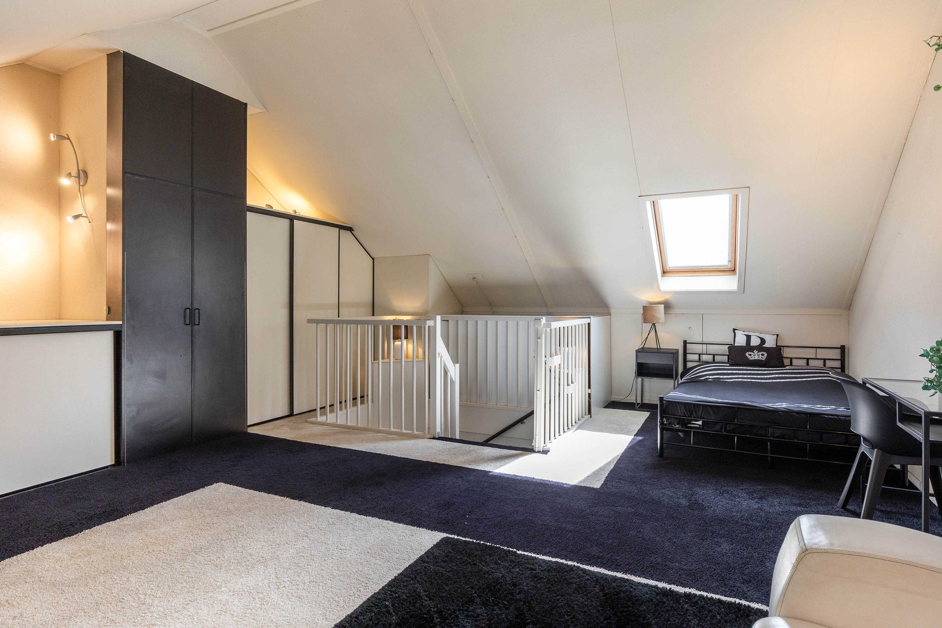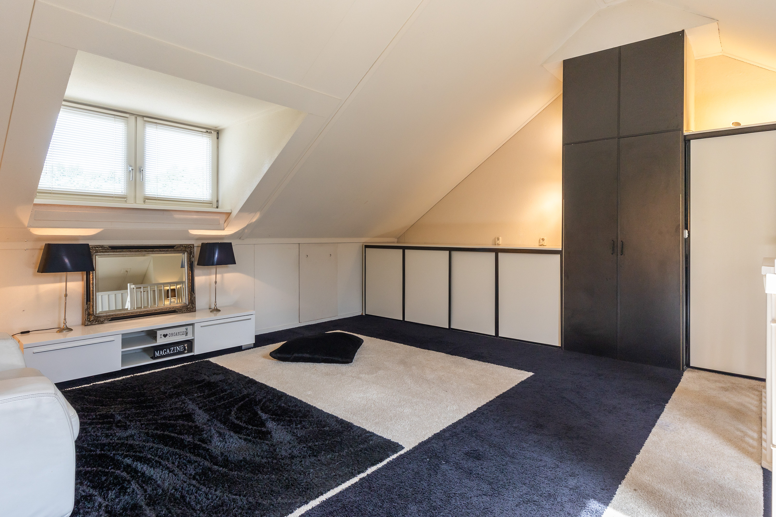 Een vaste trap leidt naar de ruime tweede verdieping. Dit is nu één grote open ruimte met een royale nokhoogte, wat een zee aan mogelijkheden biedt. Hier kunnen met gemak een vierde en zelfs vijfde slaapkamer worden gerealiseerd, of bijvoorbeeld een royale werk- of hobbyruimte. Achter de knieschotten is veel bergruimte aanwezig en in de inbouwkasten bevinden zich de aansluitingen voor de wasmachine en droger, evenals de cv-installatie.
