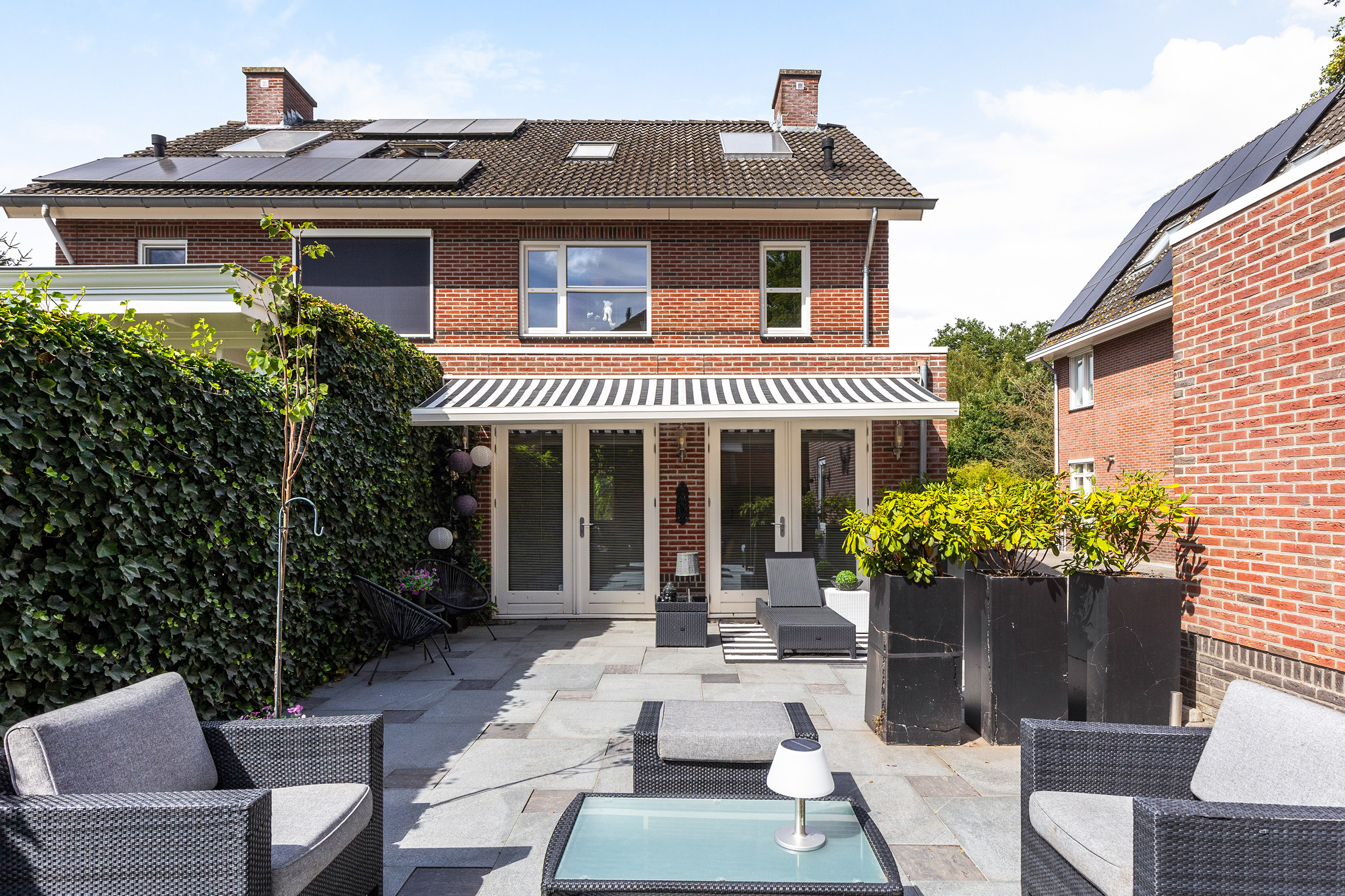De onderhoudsvriendelijke achtertuin is fraai aangelegd met terrastegels, groen en sfeervolle verlichting. Door de ligging op het zuidwesten geniet u hier van de zon van ’s ochtends vroeg tot in de avond. De royale garage zorgt voor veel praktische ruimte – en de oprit biedt plek voor meerdere auto’s.