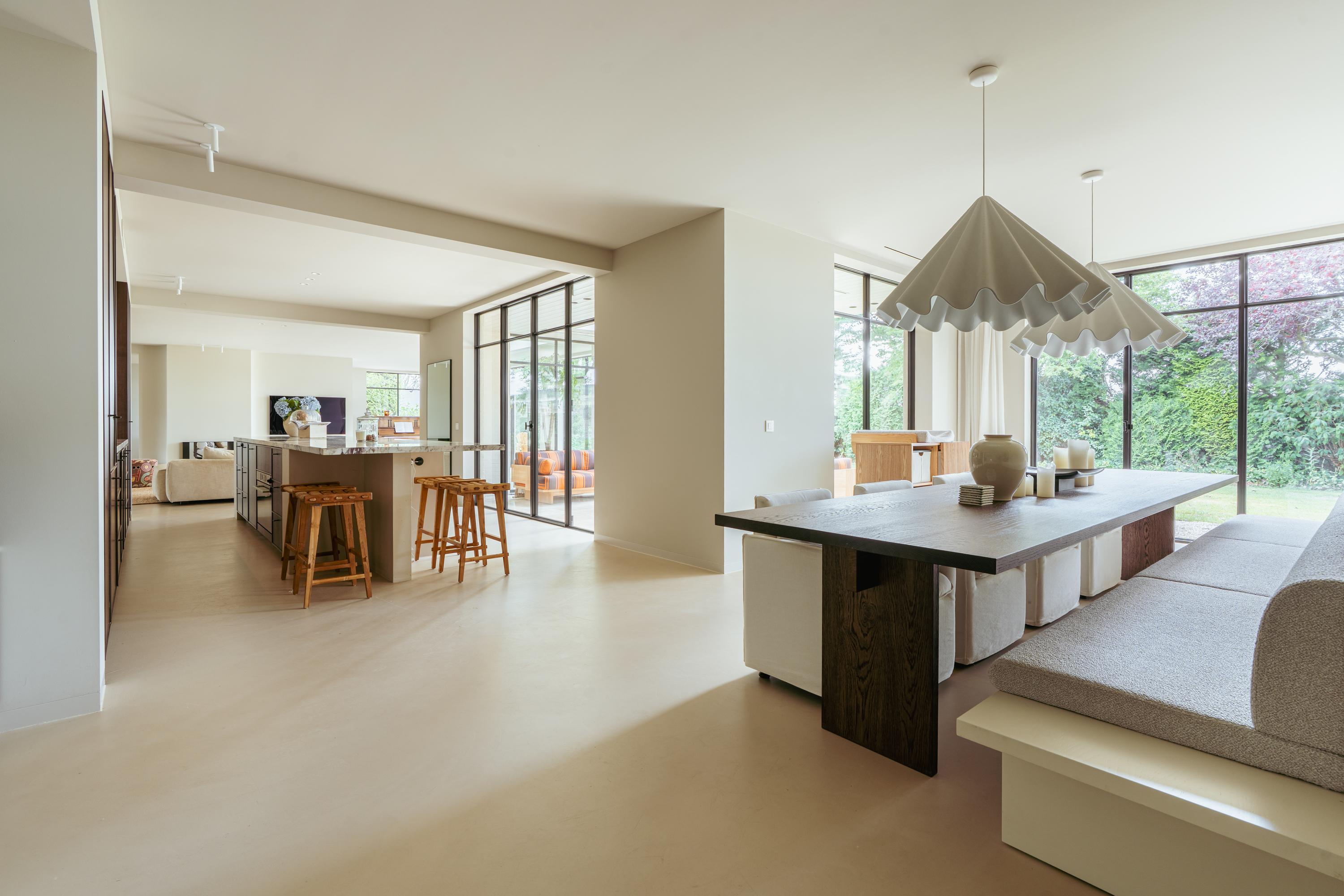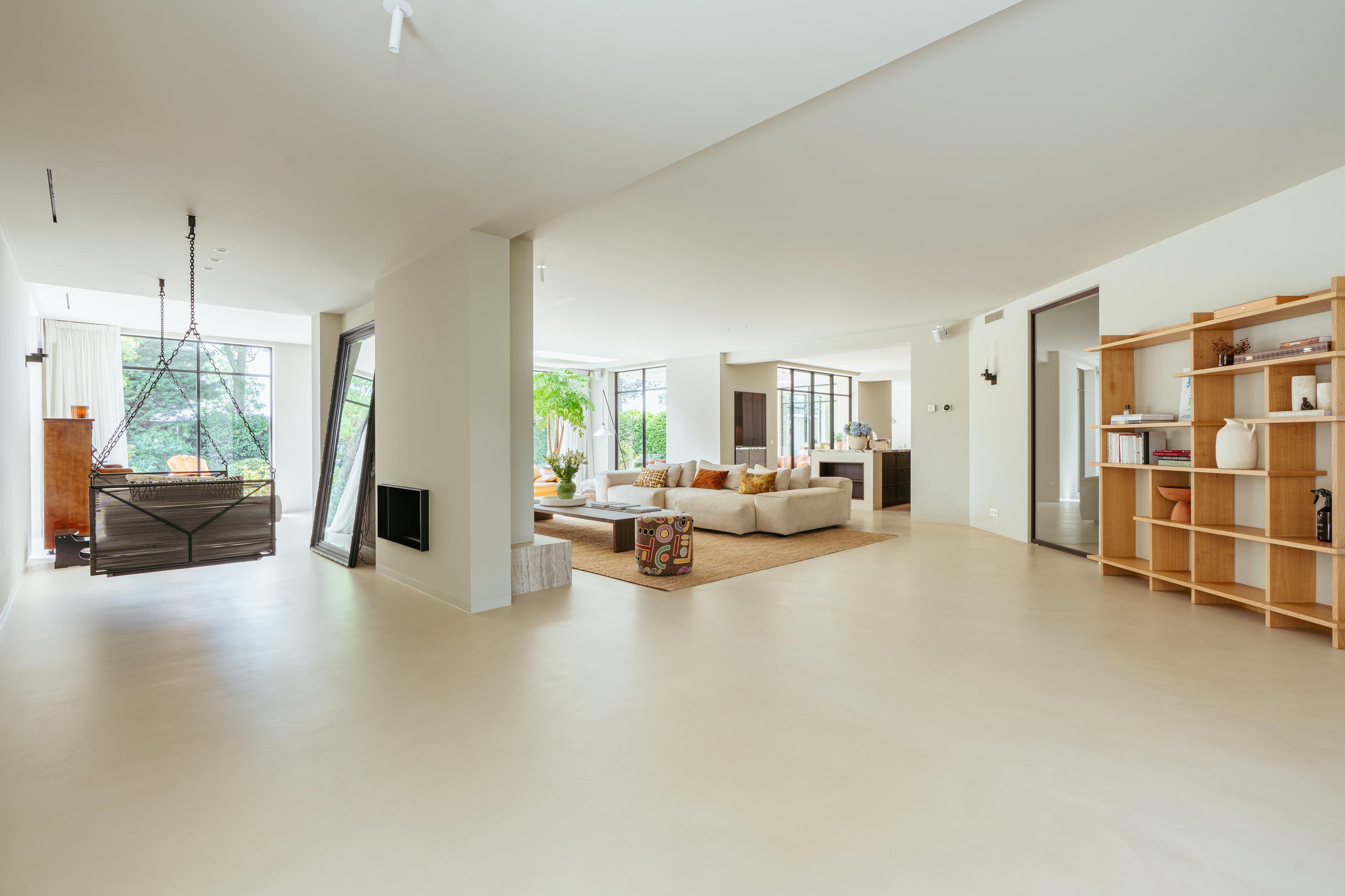 The expansive living room, featuring floor-to-ceiling windows and a stunning round bay window, is bathed in natural light, instantly creating a sense of space and tranquillity. The elegant fireplace forms a central feature of the open-plan living area, which flows seamlessly into the luxurious kitchen. The kitchen is equipped with high-end built-in appliances and modern conveniences, including a generous island of approx. 5 metres, Quooker tap, dishwasher, fridge/freezer combination, and an induction hob with integrated extractor. The exclusive book-matched marble worktop extends into the sink, giving the kitchen a refined and sophisticated finish. French steel doors open onto the delightful covered terrace and beautifully landscaped garden. Adjoining the kitchen is the spacious dining room.