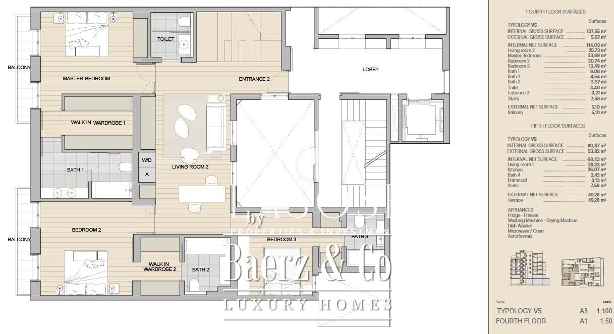 With three bedrooms and five bathrooms, the layout supports both private living and refined entertaining. Impeccable finishes complement modern appliances, air-conditioning, heating, video intercom, and thoughtful conveniences such as wardrobes cupboards and a dedicated washing room.