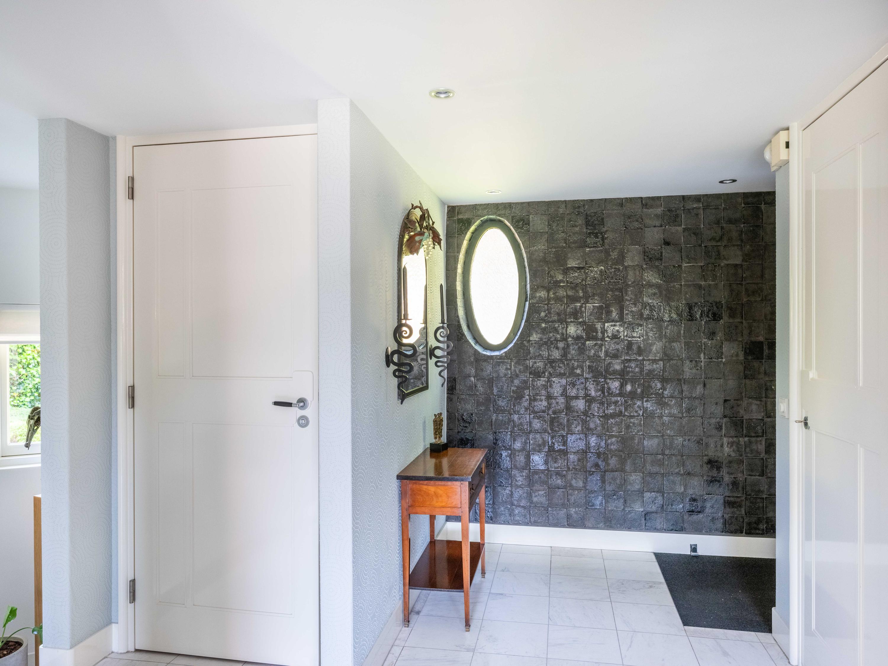 A winding path between beautifully shaped privet hedges leads to the hidden front door. Through the entrance, one enters the hall with a cloakroom, the stairs to the upper floor and a toilet.