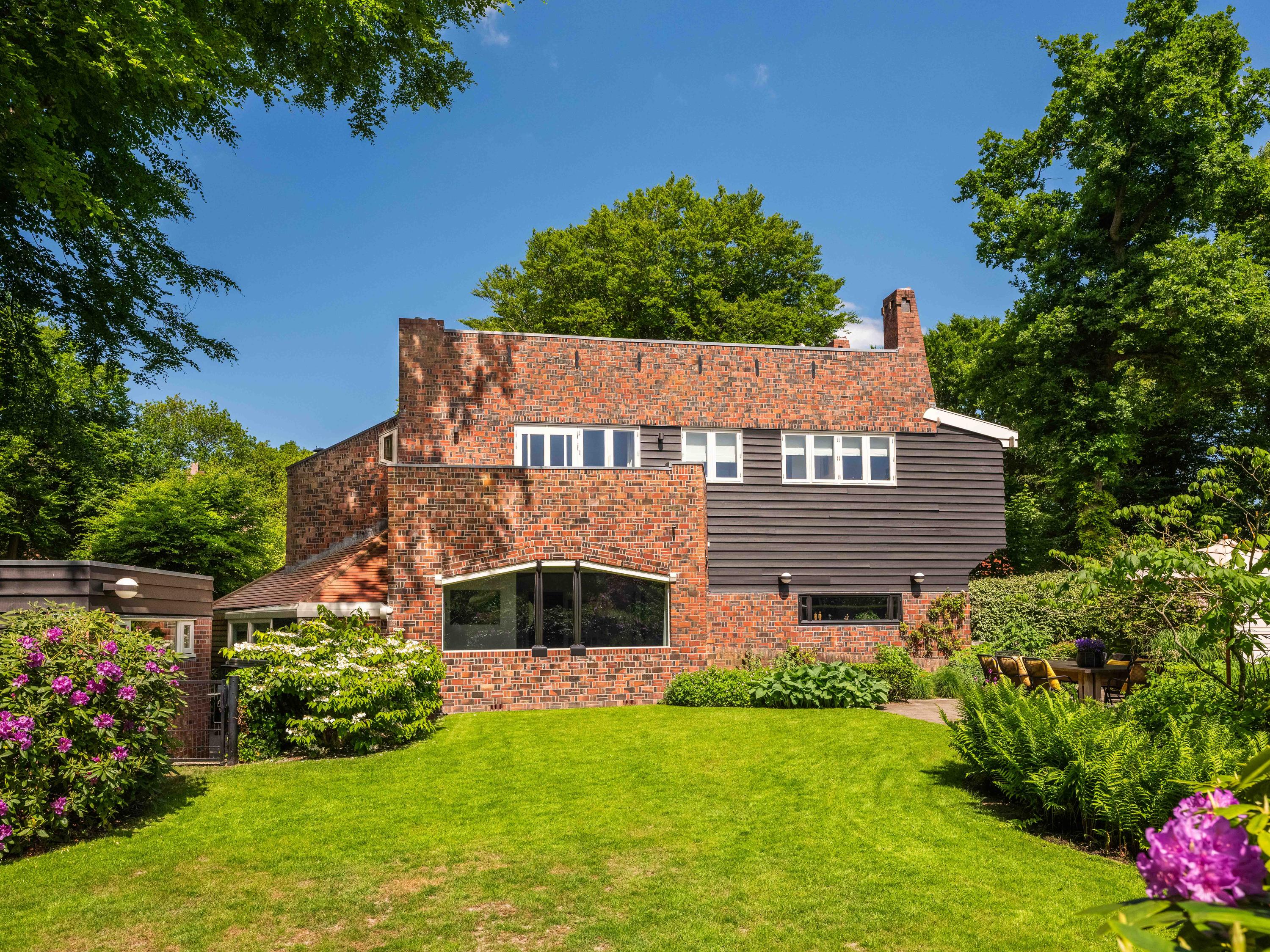 French doors lead to the spacious living room with fireplace, a dining area and conservatory. A striking feature is the raised section, known as the ‘wheelhouse’, which has monumental value. A beautiful parquet floor with piping, the rounded shapes of the fireplace, the ‘compass balls’ near the raised section and the trapezoidal window with columns give the whole a special appearance.