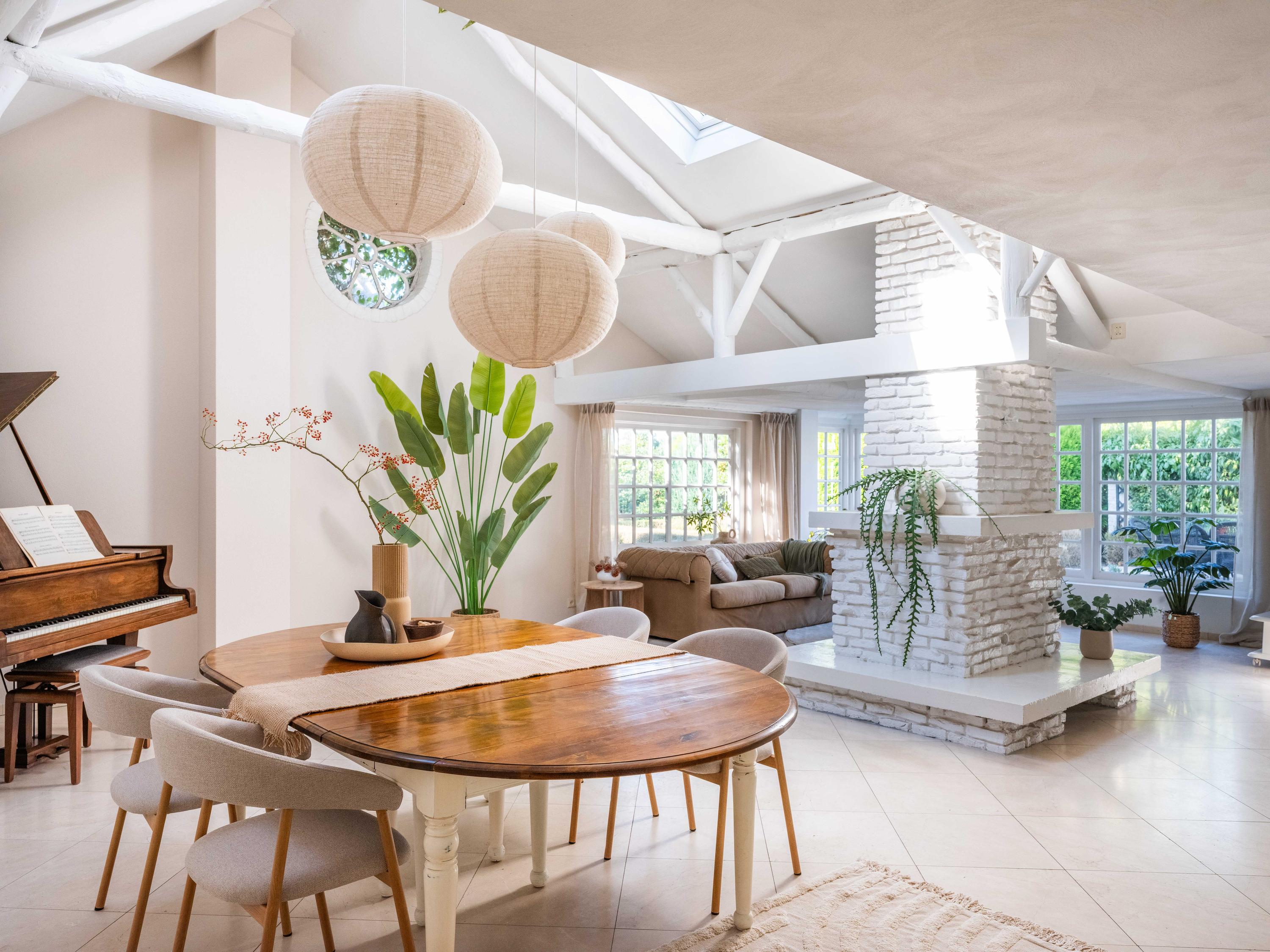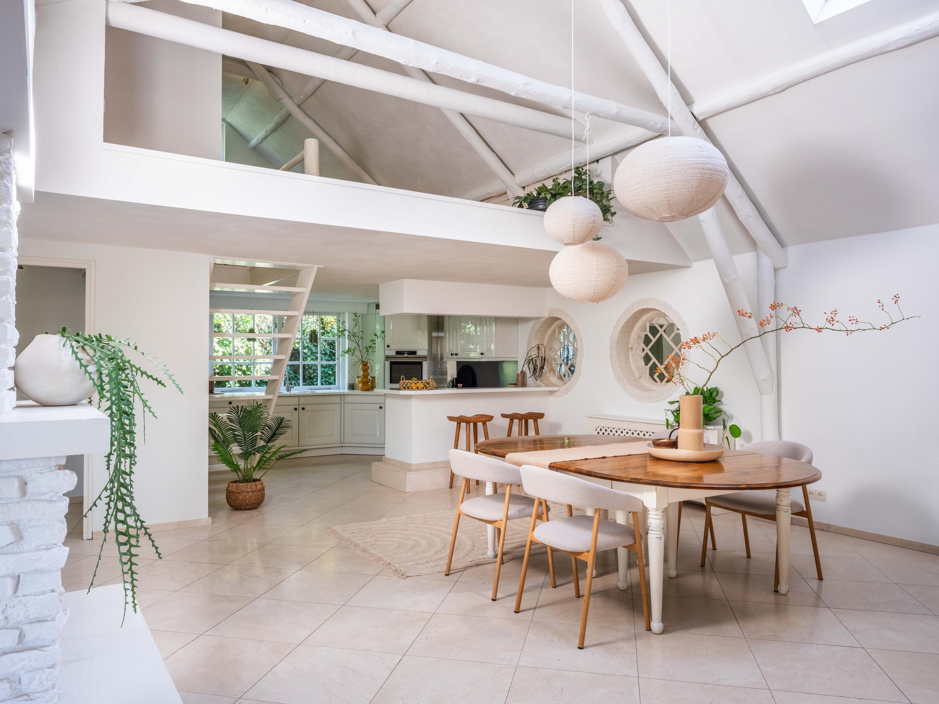 The spacious living room has a cozy gas fireplace (formerly fireplace) in the center of the room. The room is cozy with many authentic details. Think of the wooden beams in sight, a high ceiling up to the ridge and round stained-glass windows. At the back left we find the open kitchen with built-in appliances. From the kitchen we enter the utility room with the connection for the washer and dryer, the central heating system and a door to the outside.