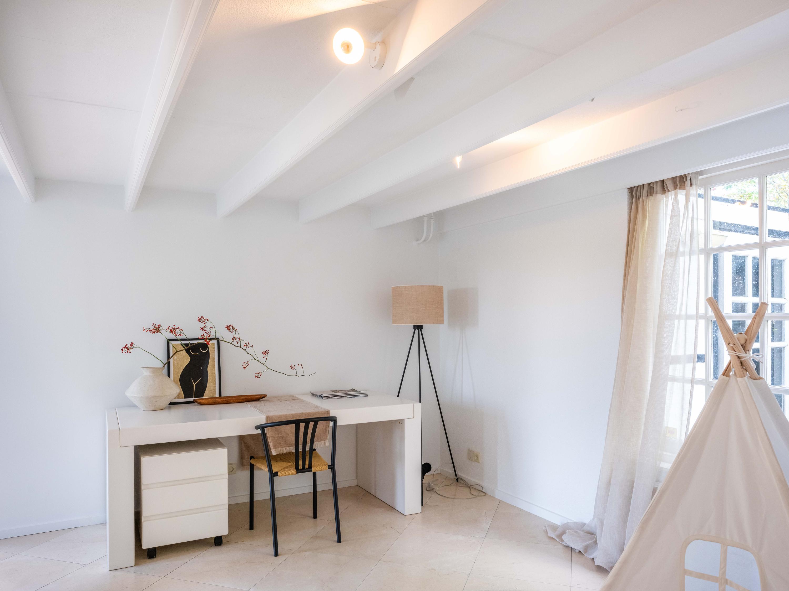 The deep front garden, brings us to the entrance of the house. Upon entering we enter the hall with immediately to the left a bedroom with private bathroom (ground floor living is thus possible here). The bathroom is equipped with a walk-in shower, sink, toilet and urinal. Back in the hall we find behind a wall a room that is now used as an office/guest room. Here is also located the toilet and an additional shower stall.