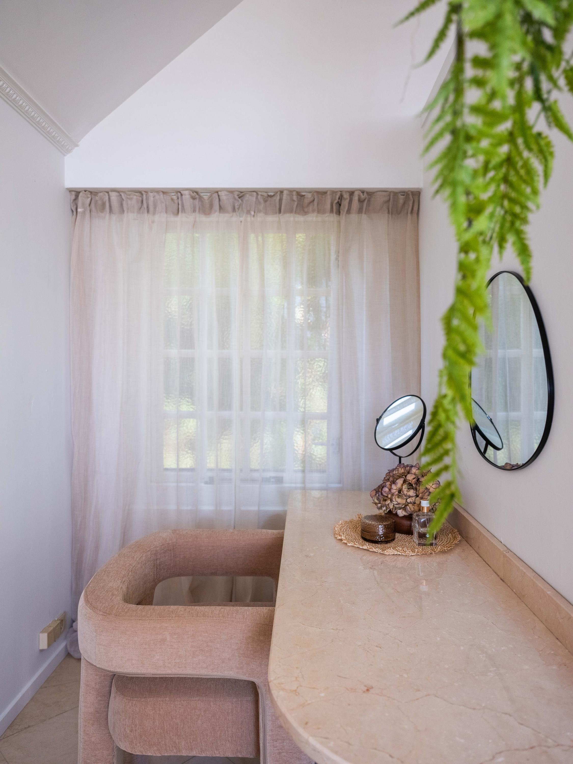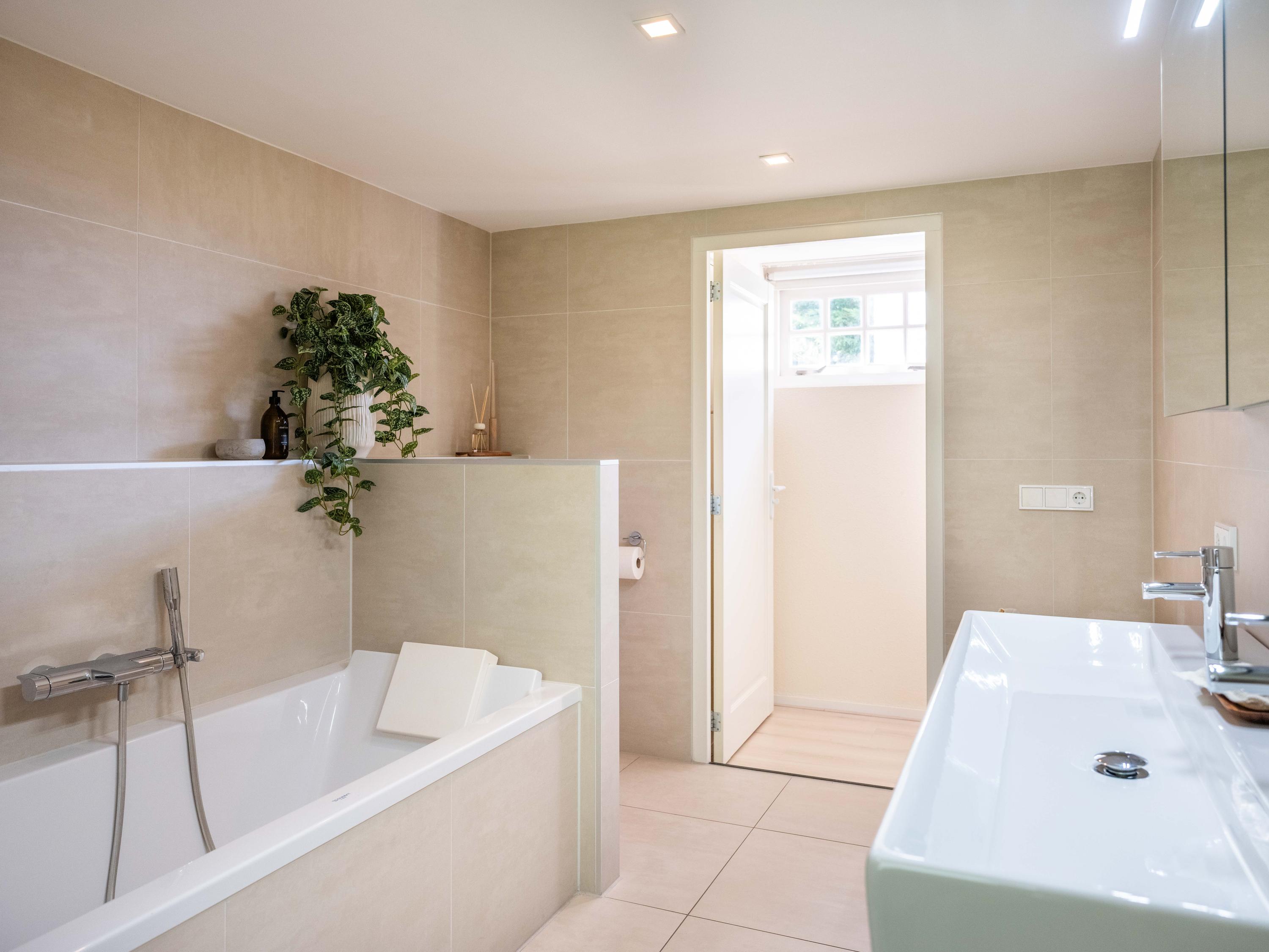On the second floor, we walk across the loft to the bedroom. This room has closets and provides access to a spacious roof terrace. From the terrace again a great view. The bathroom on this floor is surprisingly spacious and modern (2018). This bathroom has a bathtub, walk-in shower, double sink and toilet.