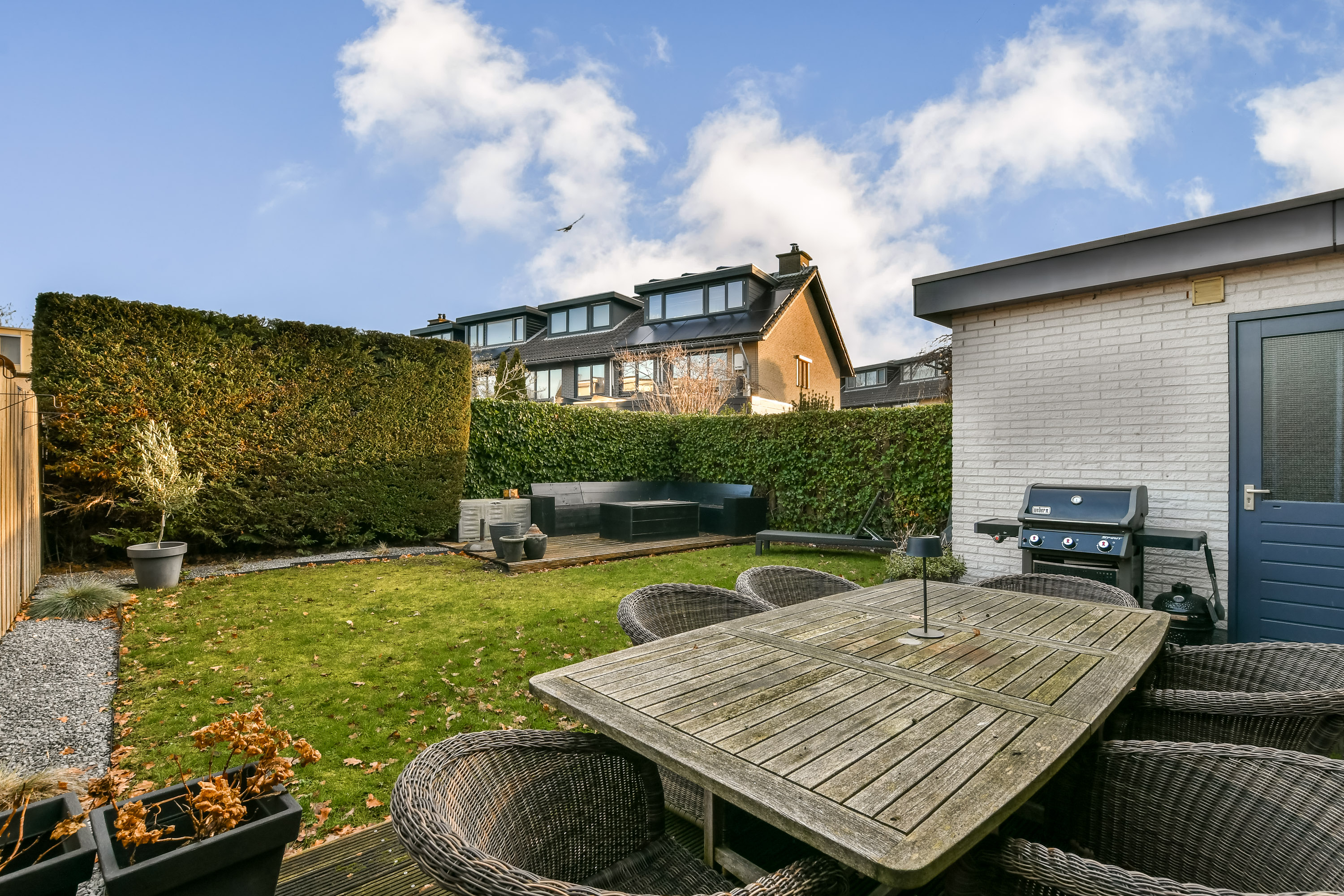The ground floor has a welcoming entrance, a generous living room with bay window, gas fireplace, and laminate flooring, flowing into a bright open kitchen equipped with built-in appliances. A versatile adjacent room connects to the garden and garage, adaptable as a playroom, lounge, or workspace. In the northeast-facing garden, thoughtfully designed terraces and modern conveniences create a sunlit retreat accessible from both the living room and multifunctional space.