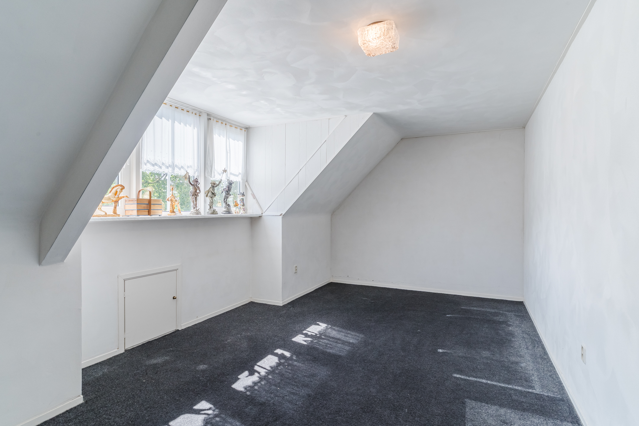Approx. 19.5 m², carpet flooring, plastered walls and ceiling, dormer window, knee wall storage, and access to attic via retractable stairs.