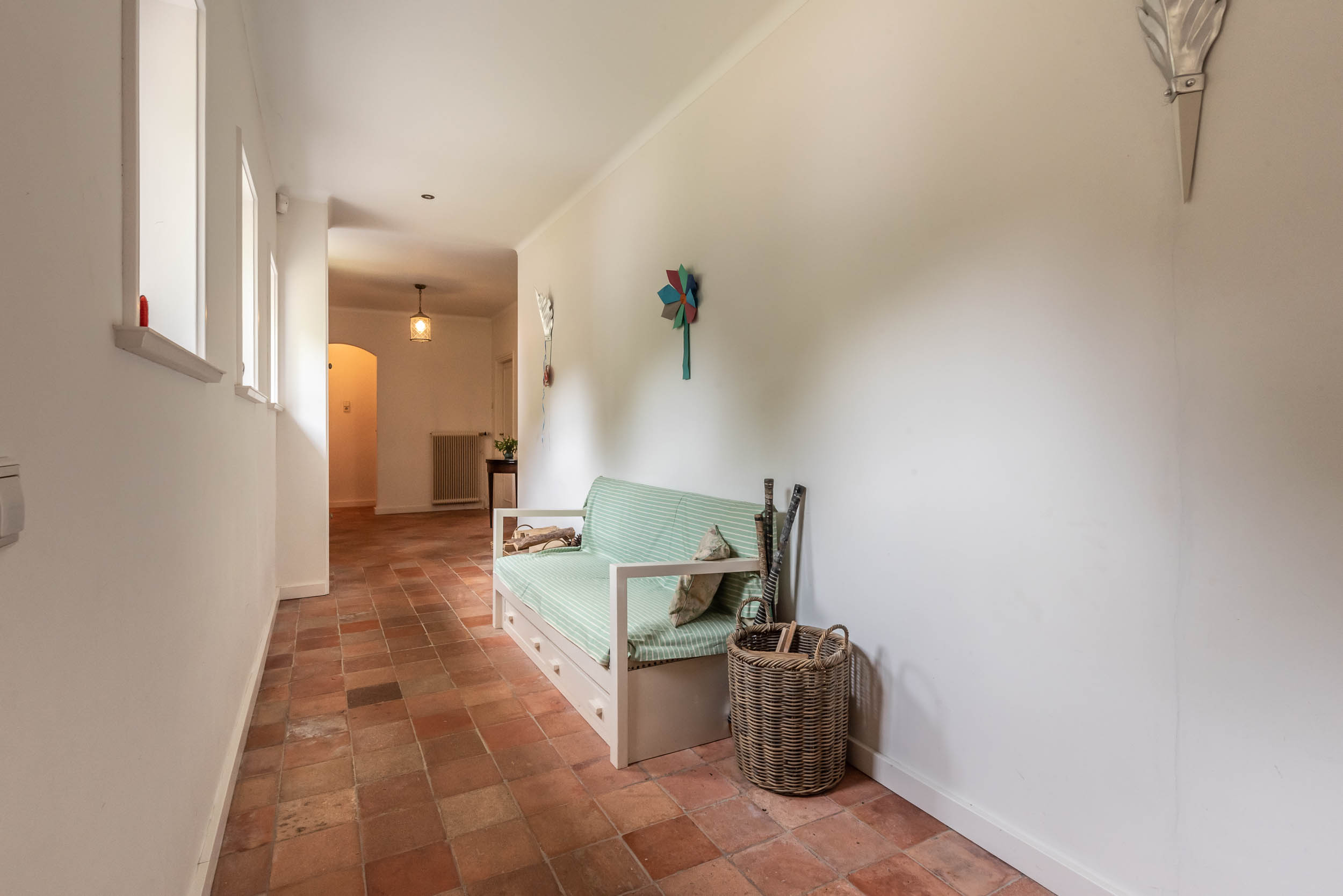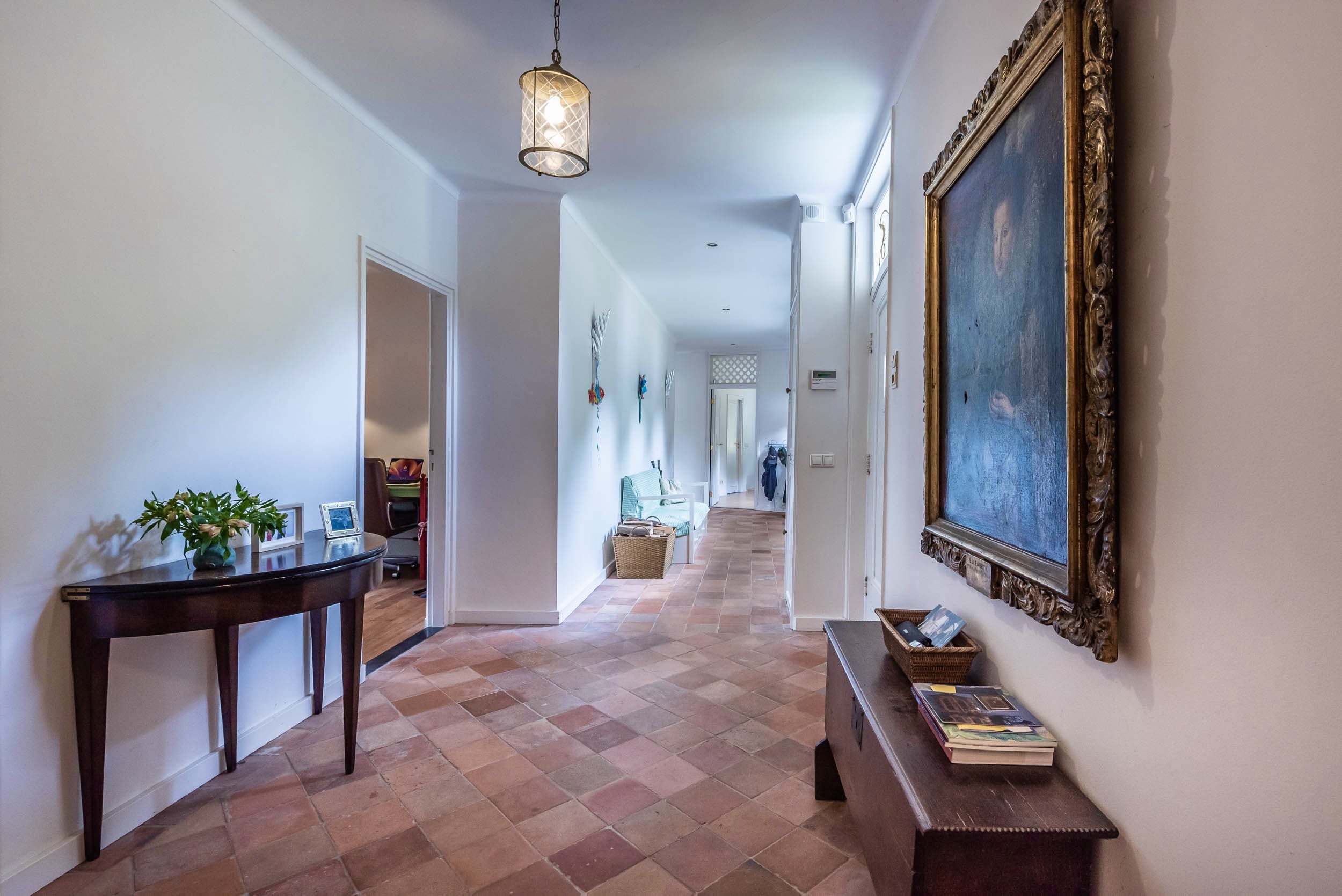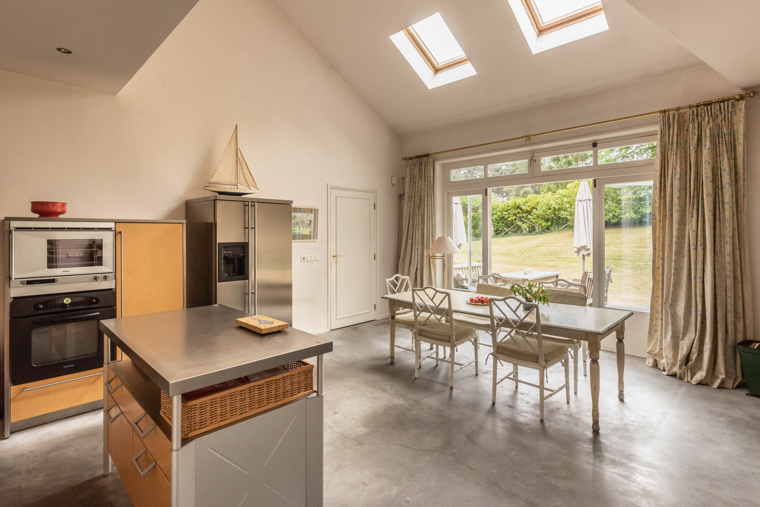 A sweeping driveway leads to a double carport with round point and ample parking, complemented by an indoor garage. The living area of 221 m² is arranged in both the original 1953 house and a 2001 extension, maintaining architectural continuity throughout. Interiors are composed for comfort: airy rooms are connected by French doors to the unusually varied and sunlit garden. The main living spaces blend parquet and terrazzo flooring, open fireplaces, and bespoke built-ins, shaping an atmosphere of understated warmth.