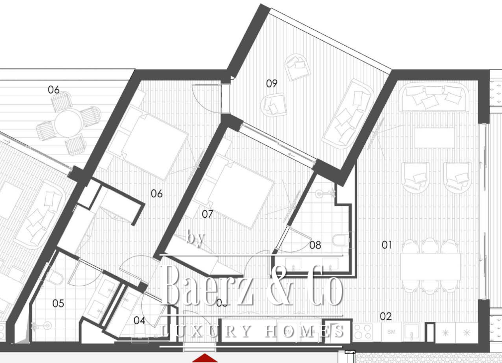Most apartments in the building have a sea view. The longer lamella of the property is the dominant one, while the shorter one is cascaded.