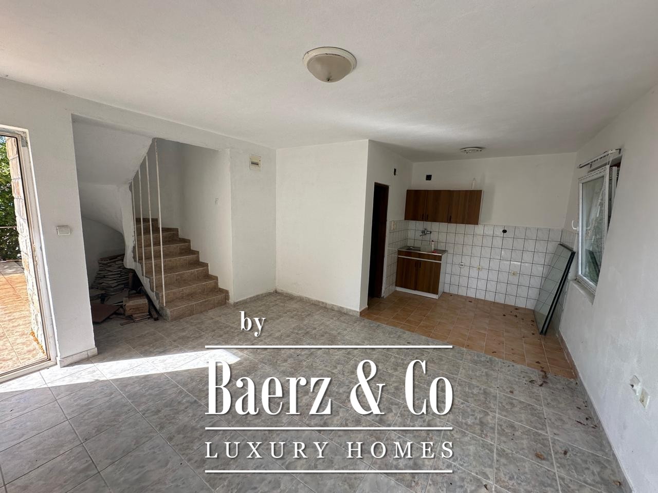 House Budva is quietly set in the natural surroundings of Sveti Stefan, where the beach and the Adriatic are just 400 metres away. This 210m² residence spans two levels plus an attic, offering four bedrooms, three bathrooms, three balconies and a terrace with views that sweep from sea to mountain. Connected by an asphalt road to the main route, it balances seclusion with accessibility. The house stands unfurnished and in need of renovation, presenting a canvas for personal vision. Daylight moves easily through the living spaces, including a living room with kitchen and generous balcony exposures.