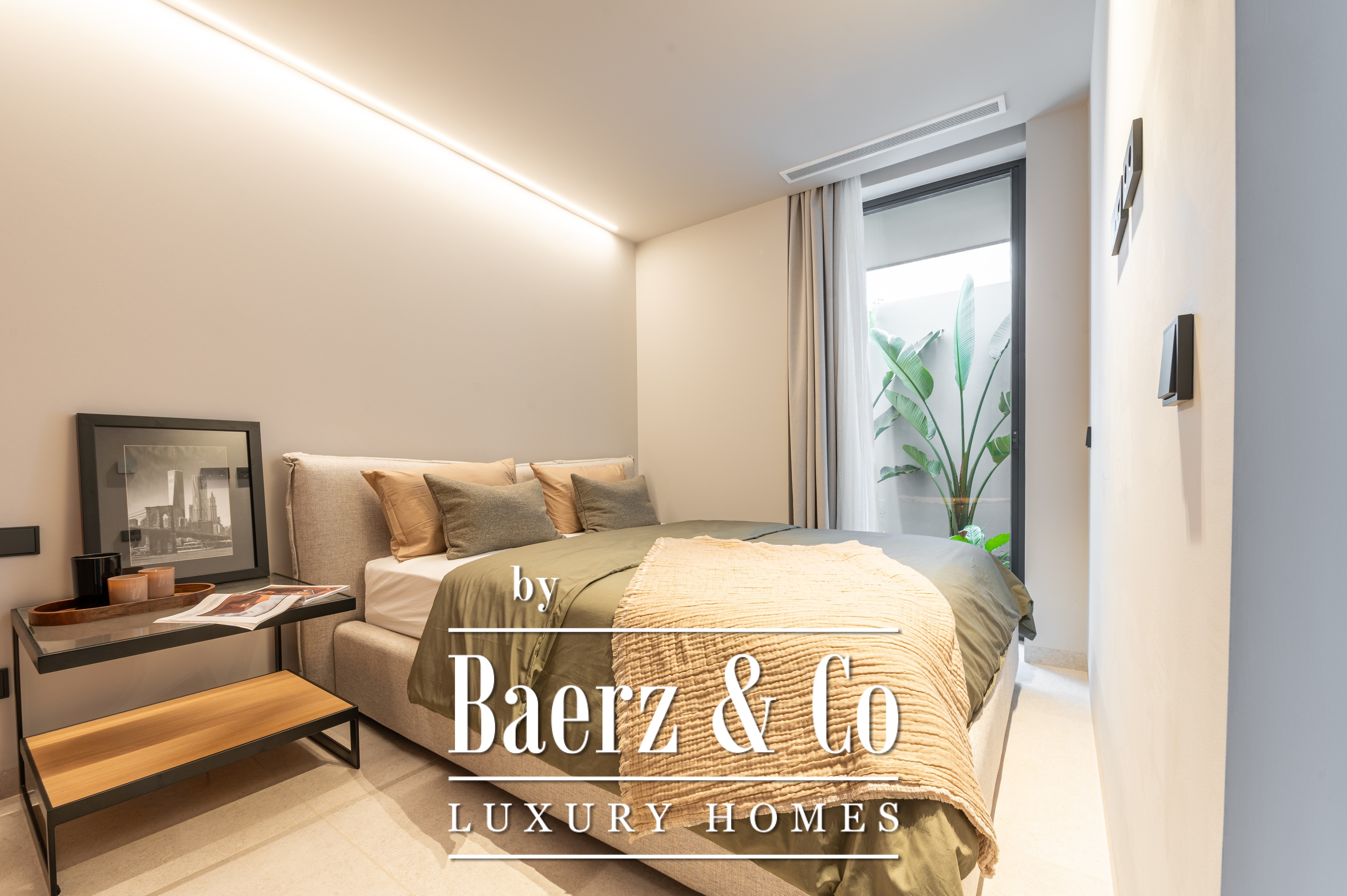 The interior spans 114 m², featuring two bedrooms and two bathrooms, thoughtfully designed for ease and privacy. A private heated swimming pool extends the living experience outdoors, while energy-efficient systems and heat pumps deliver both comfort and sustainability. The kitchen, outfitted with top-brand appliances, stands ready for both daily routines and impromptu gatherings, complemented by three fitted wardrobes for refined storage.