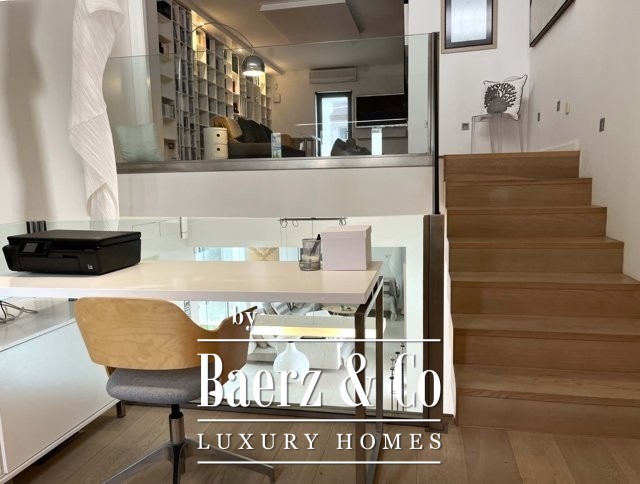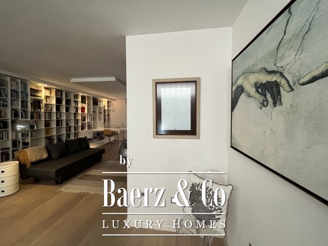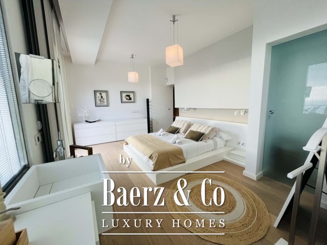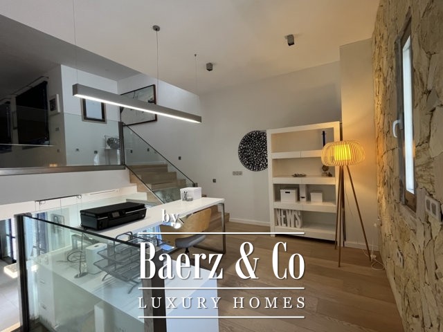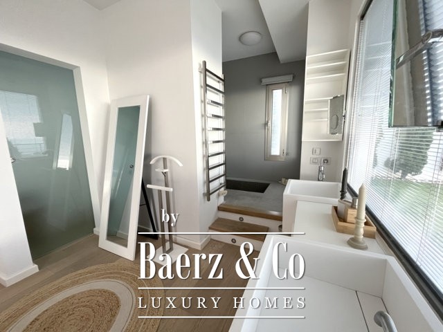 Above, a mezzanine office floats above the living space, while the top floor provides a tranquil library or creative room, a double bedroom with en-suite, and a terrace of 50 m² opening to uninterrupted sea views. The basement features a gym, music room, daylight living lounge, ample storage, and a guest suite with its own entrance and sunlit terrace.