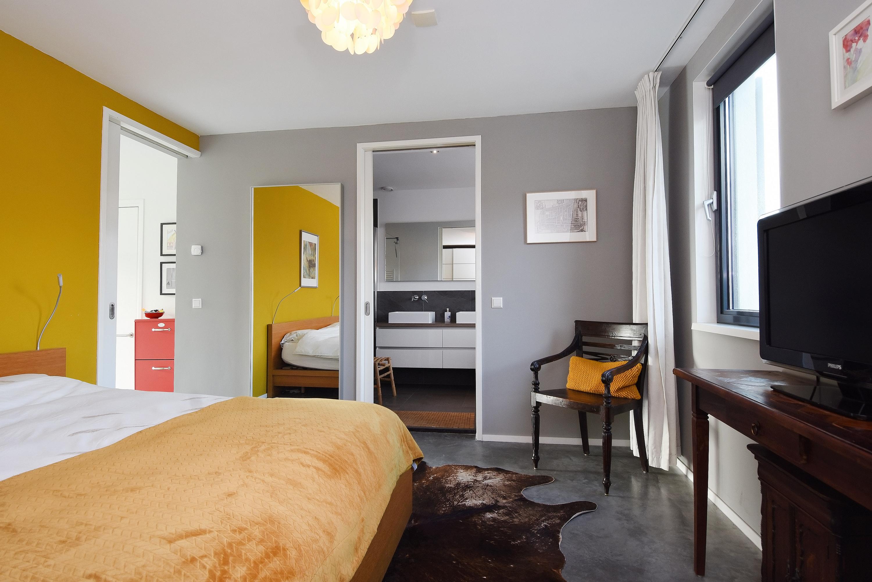 The hallway provides access to a utility room with space for a washing machine, dryer, freezer, etc., and to a luxurious toilet (wall-mounted) with washbasin. From here you also enter the master bedroom with an ensuite bathroom featuring a beautiful walk-in shower, bathtub and double washbasin with cabinet.