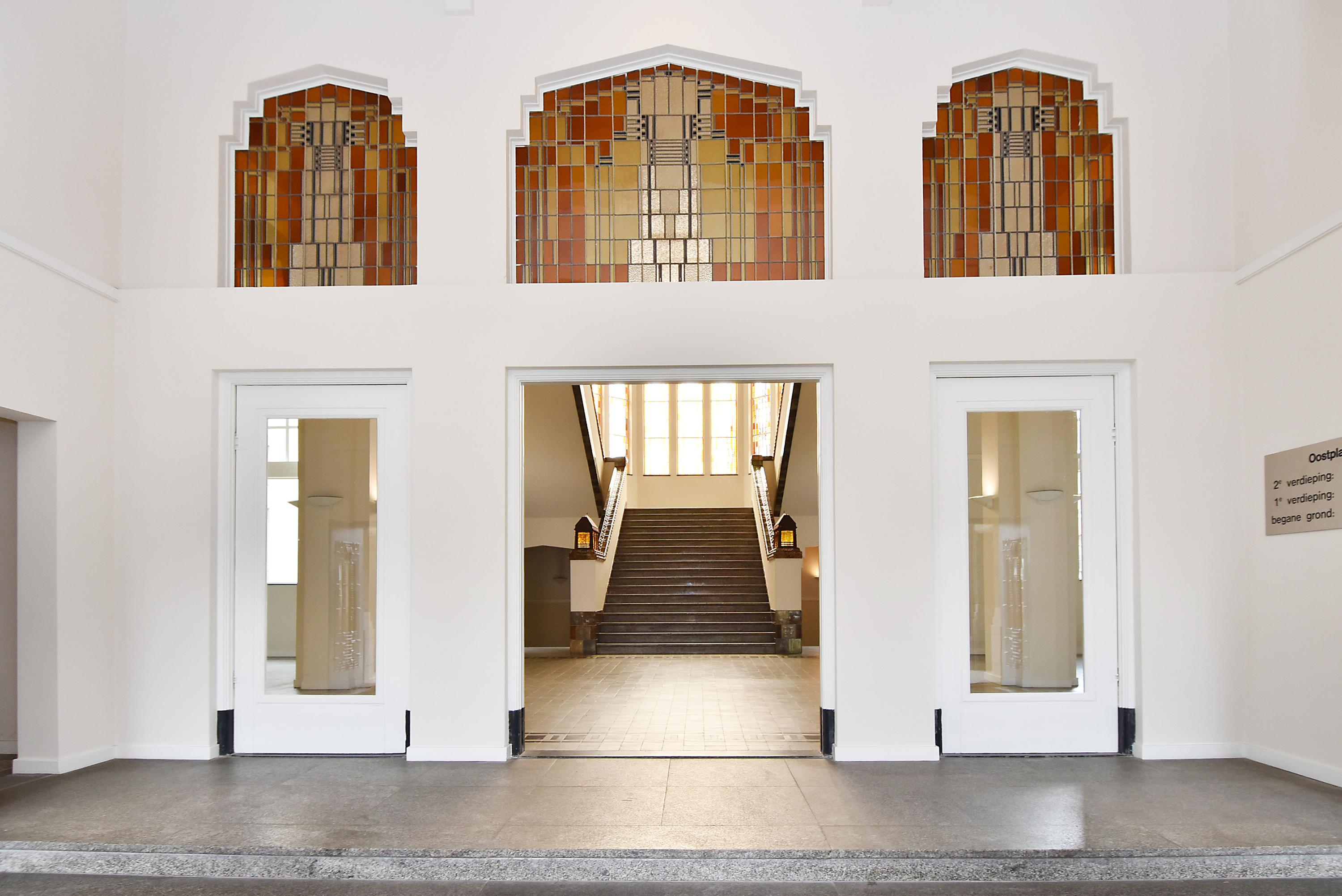 Representatieve entree met centrale hal, brievenbussen, lift en een prachtig monumentaal trappenhuis met glas-in-looddetails.