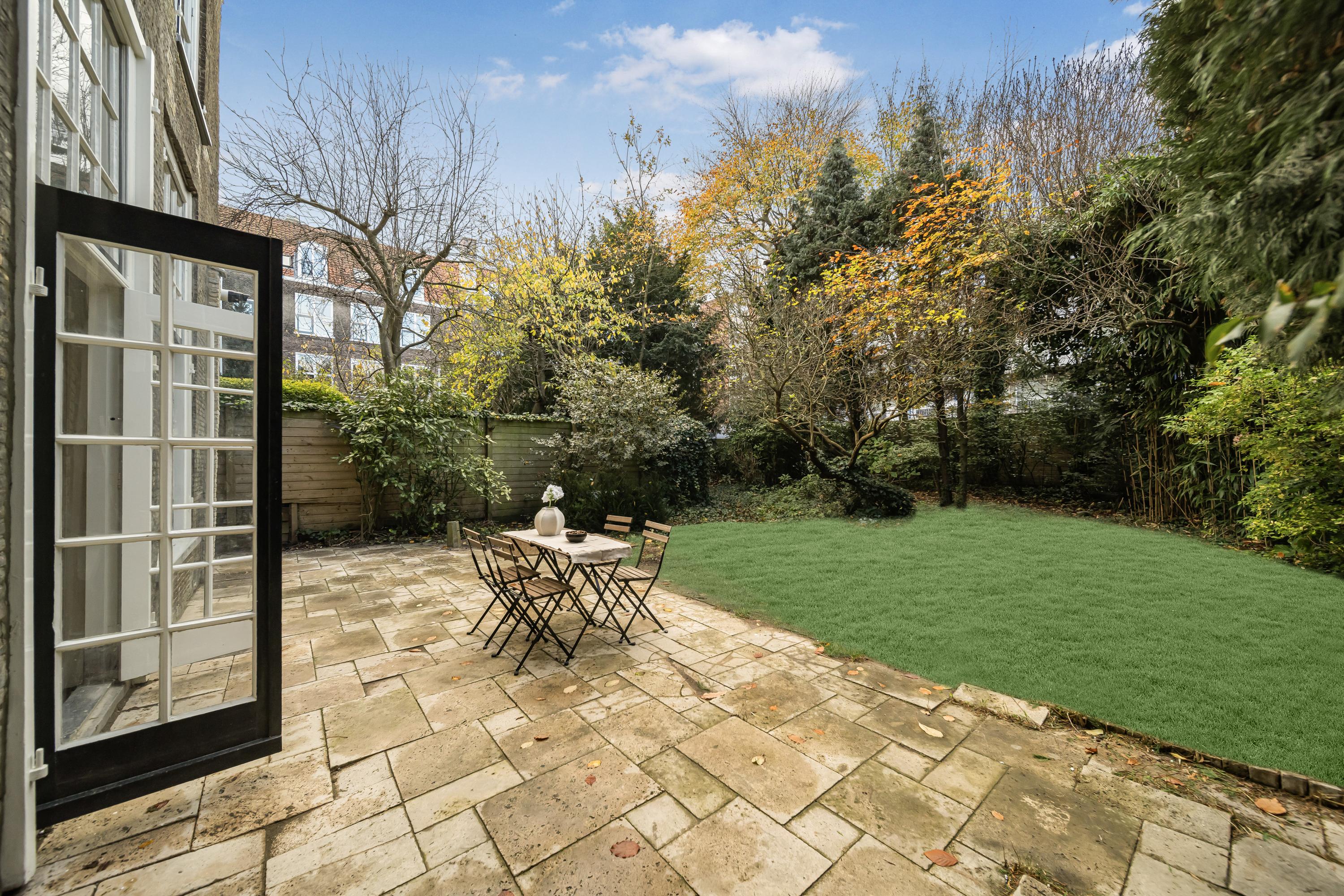 The L-shaped city garden facing southwest is an oasis of peace and privacy. With a full-width terrace, lawn, mature trees, and a storage shed, it offers a unique green retreat in the heart of the city centre.