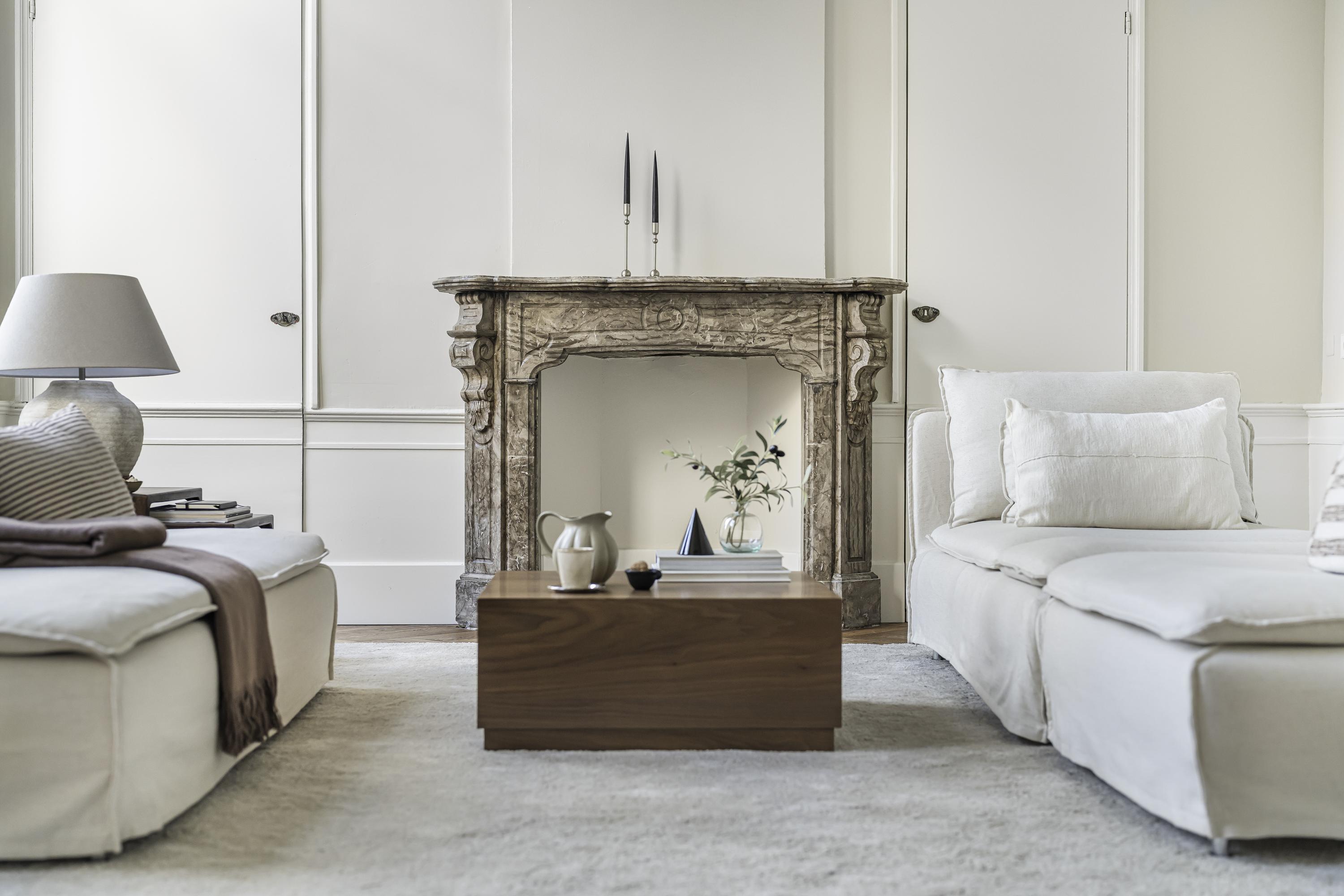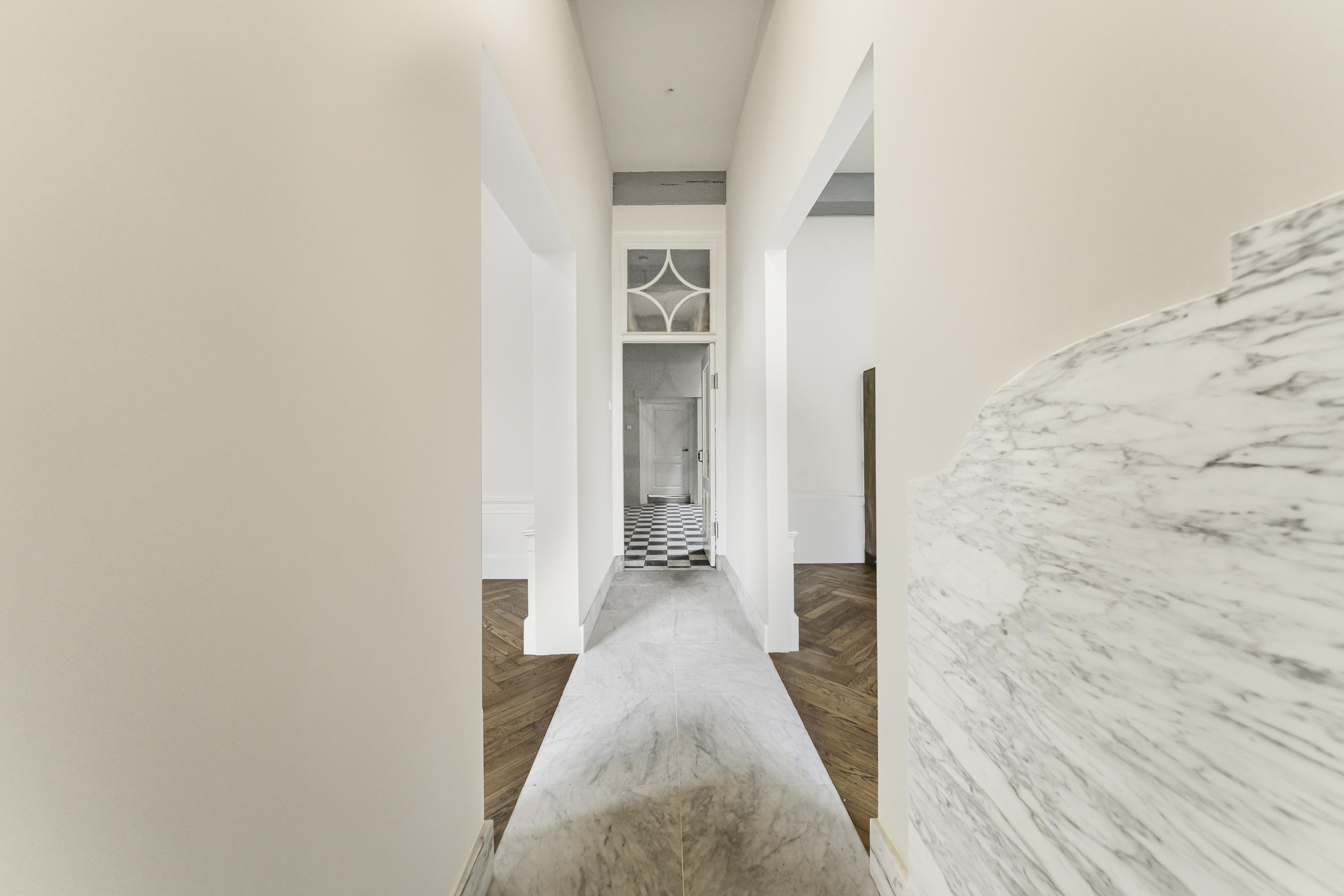 Entrance, long hallway, and impressive main hall featuring a classic black-and-white marble floor and monumental oak staircase. At the front are two rooms with original fireplaces—ideal as offices or consulting rooms. Adjacent is a spacious intermediate room that flows into the sunny, garden-facing living room with monumental fireplace.