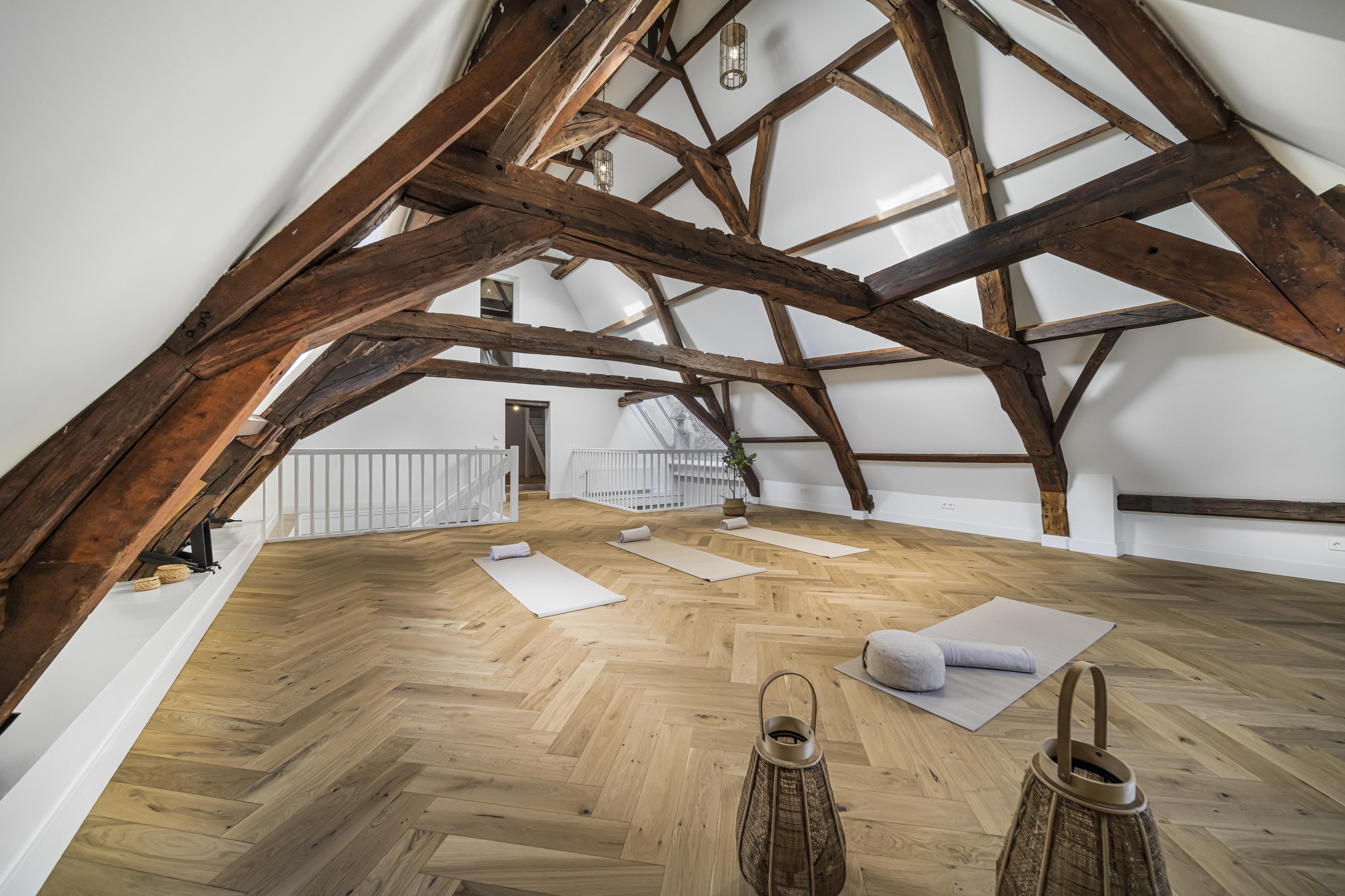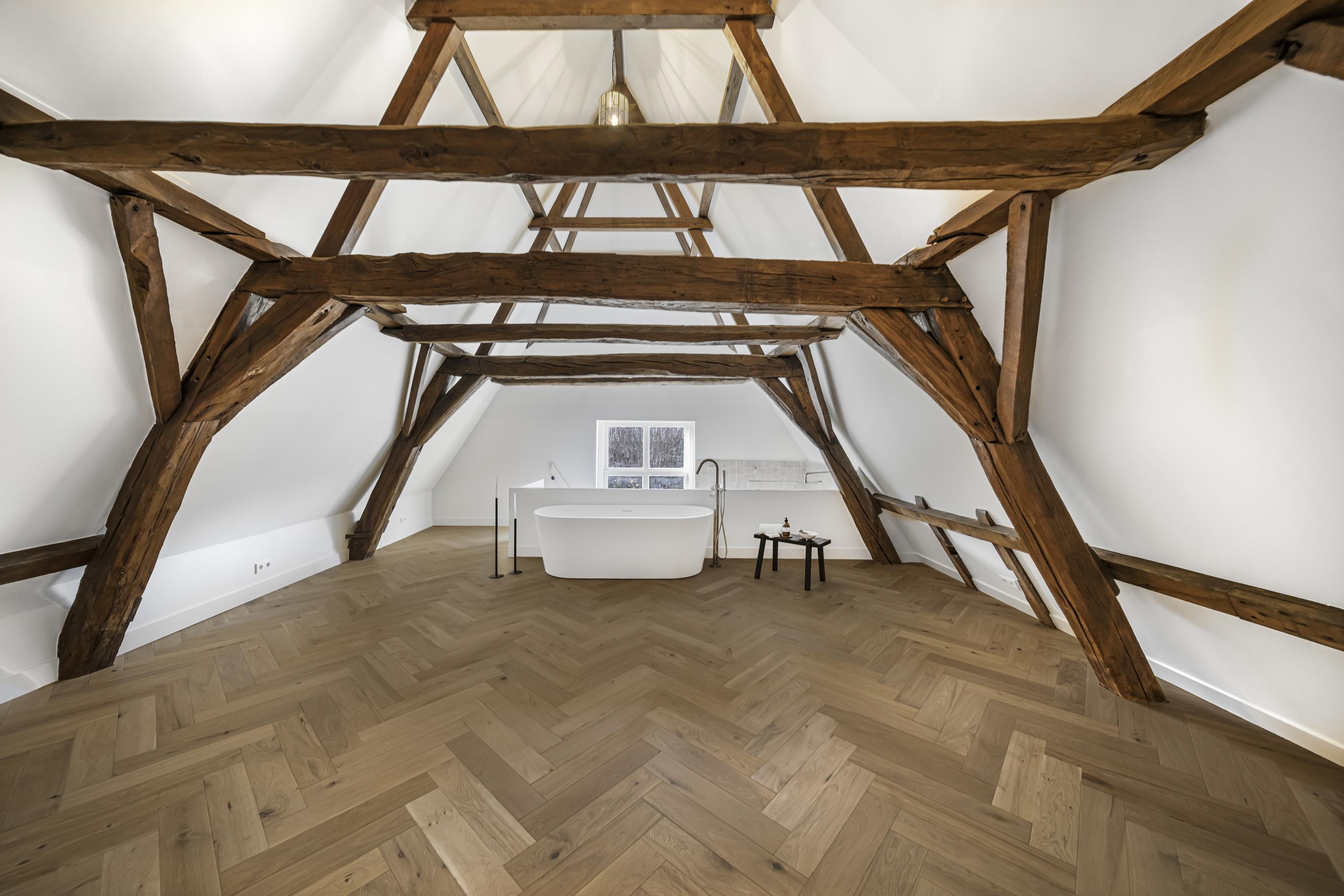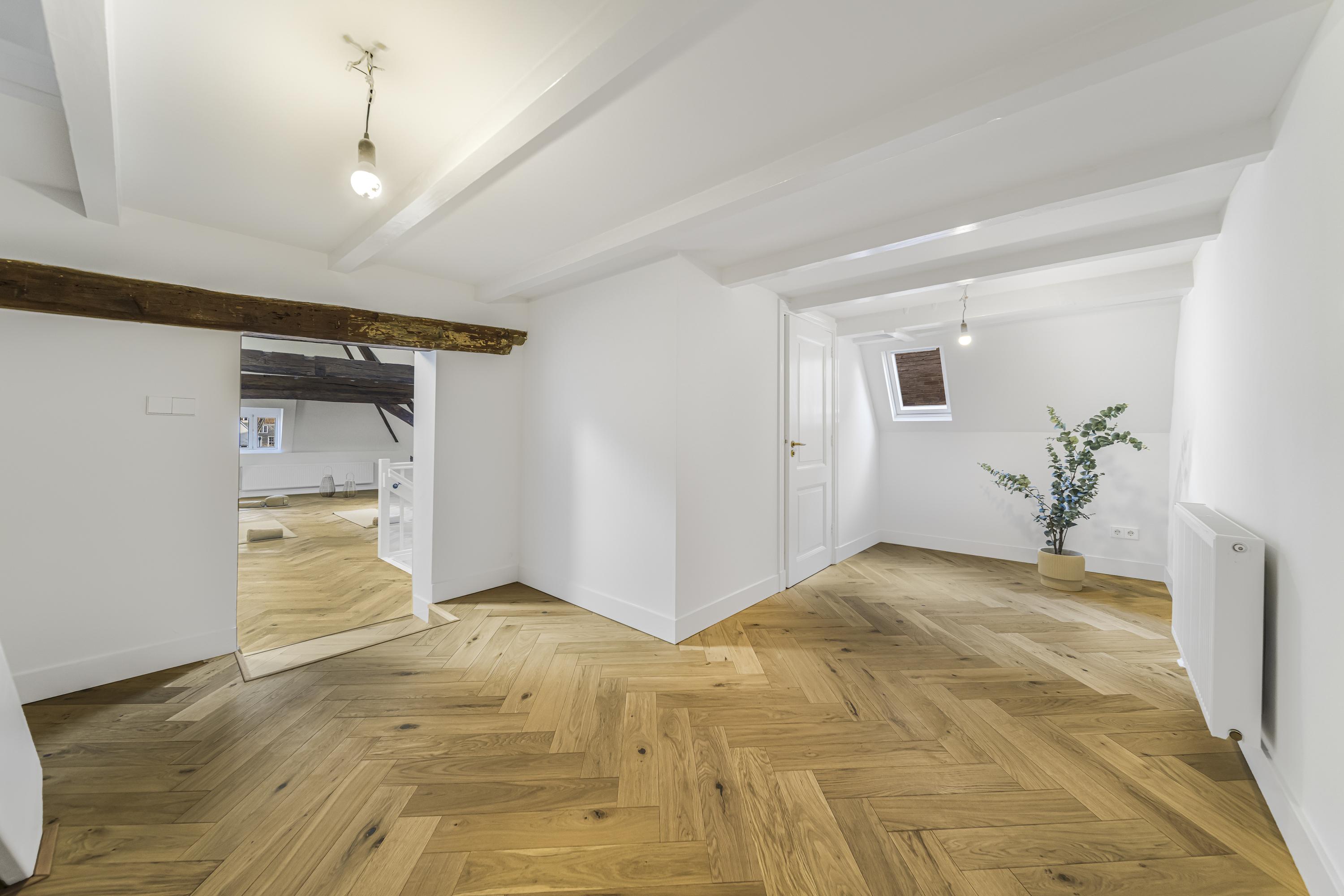 A beautiful floor showcasing the original roof structure. At the front is a bright, multifunctional space. Additionally, there is a large storage room and a toilet. Extra daylight enters through newly installed, high-placed windows above the mezzanine.