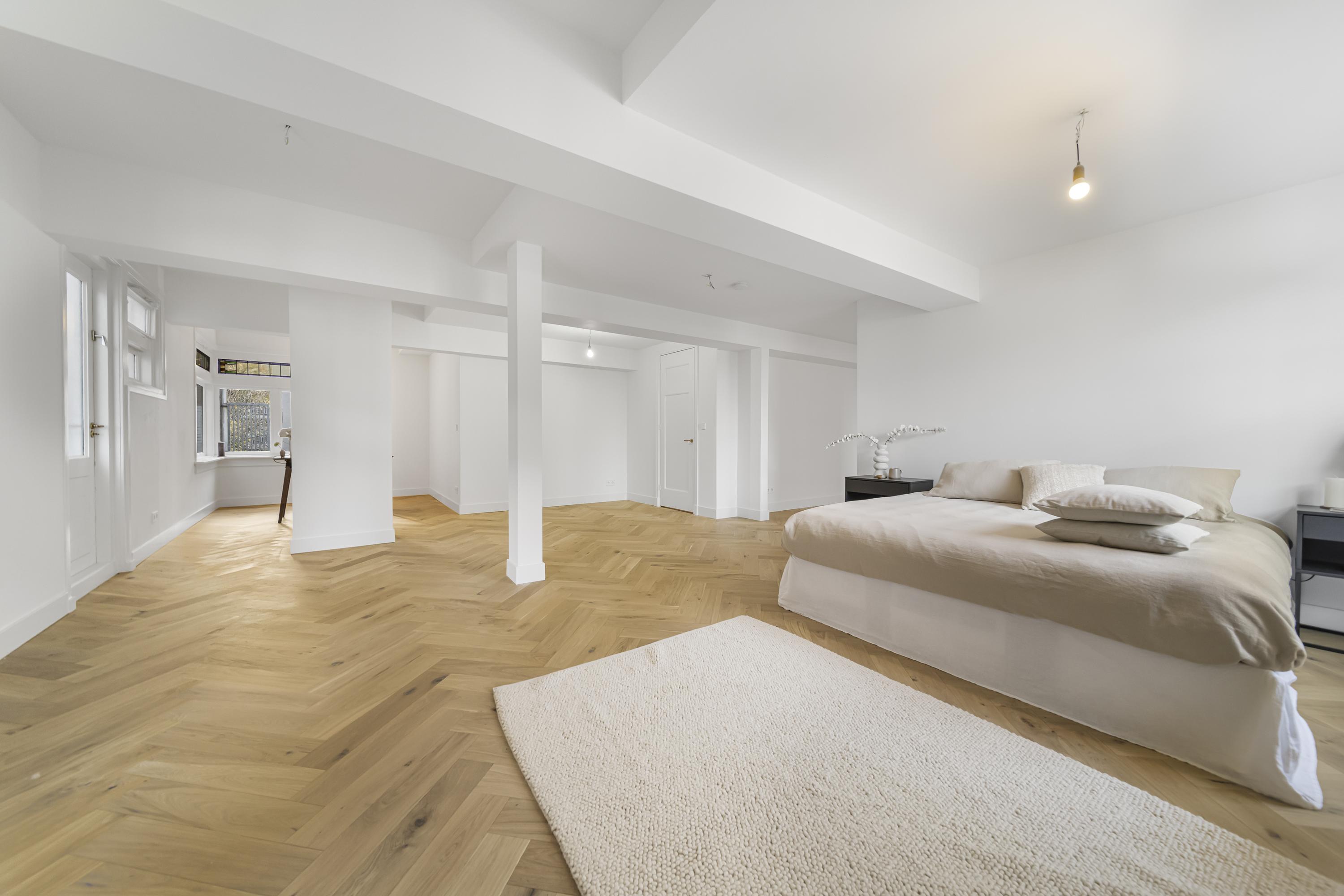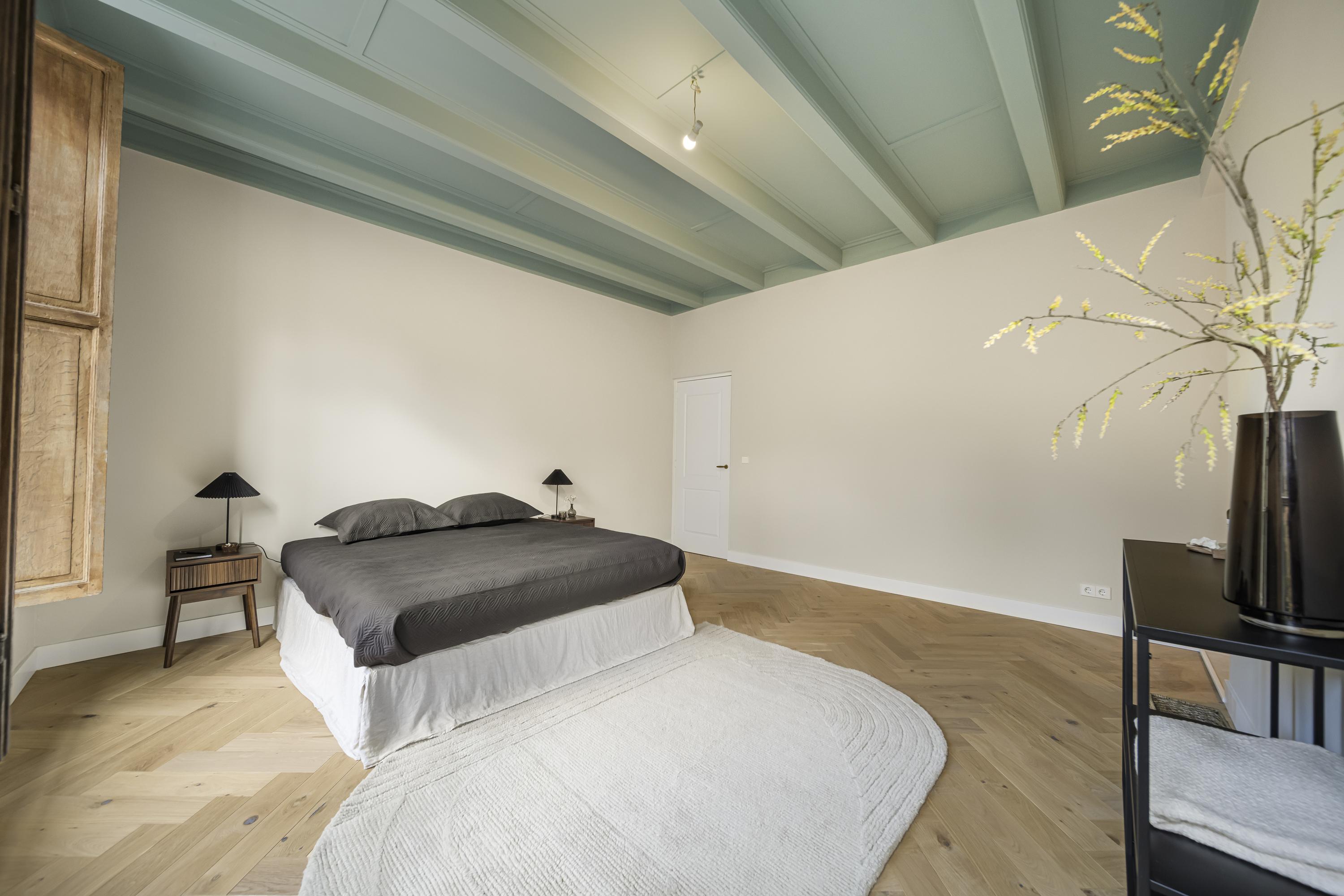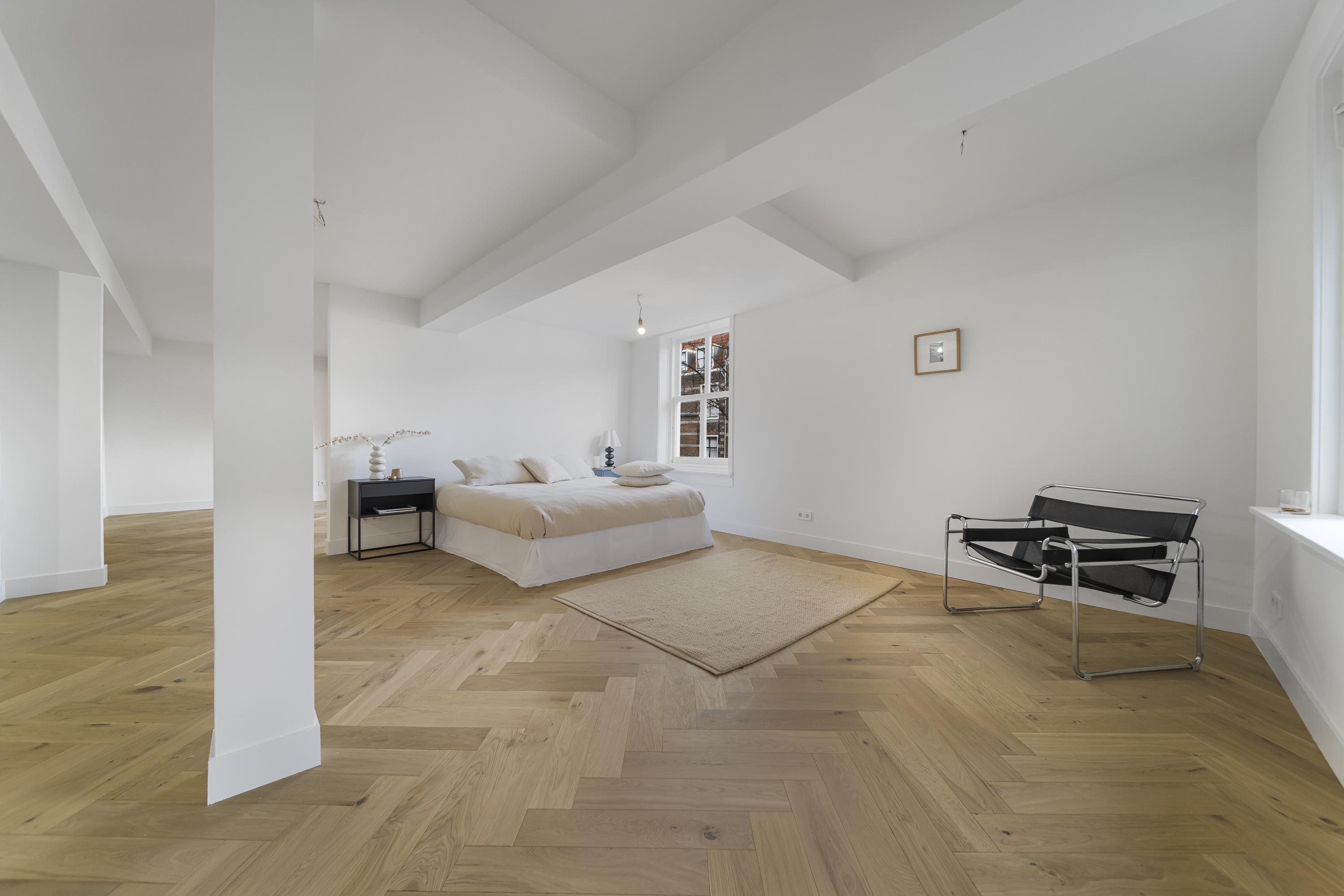 A beautiful floor showcasing the original roof structure. At the front is a bright, multifunctional space. Additionally, there is a large storage room and a toilet. Extra daylight enters through newly installed, high-placed windows above the mezzanine.