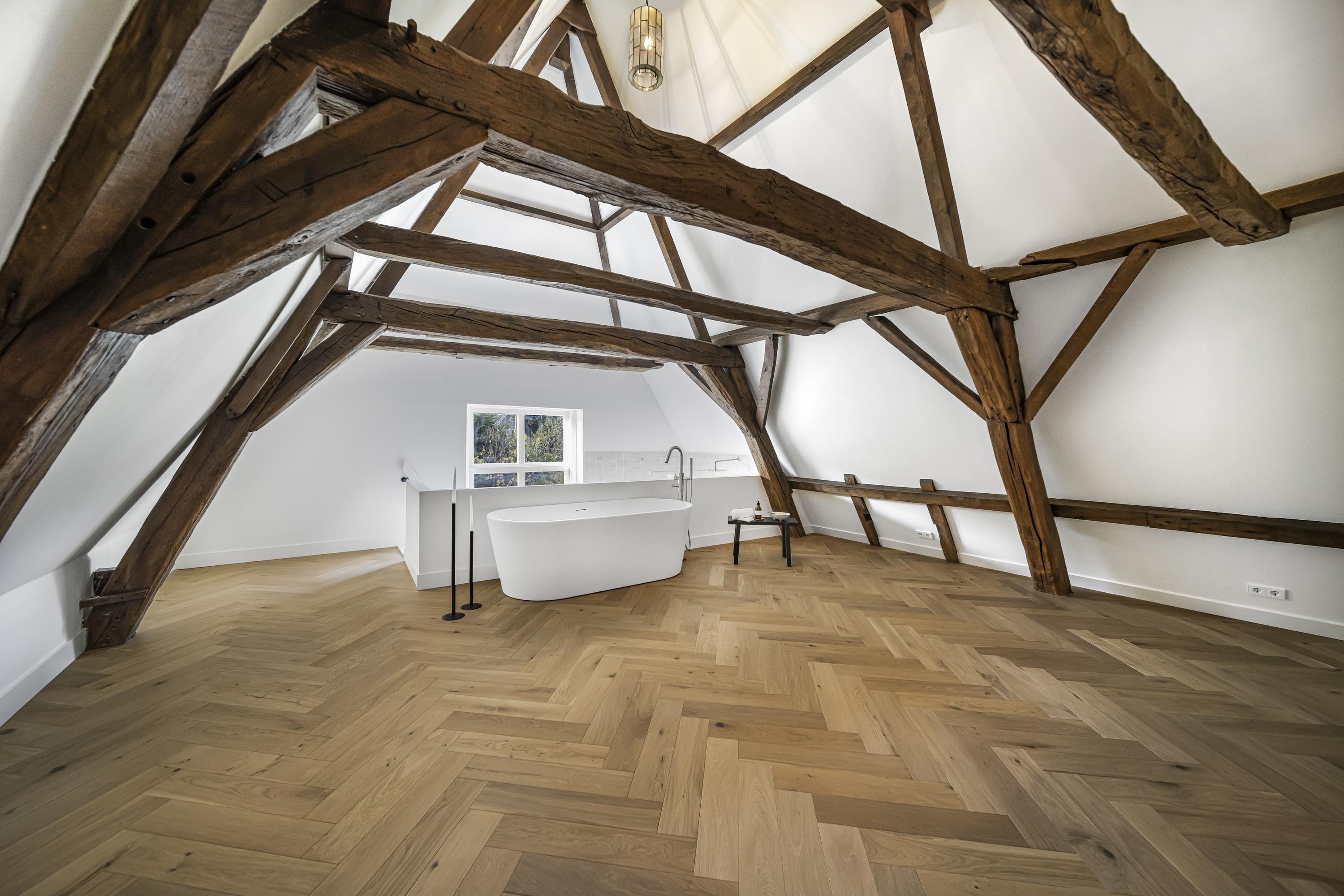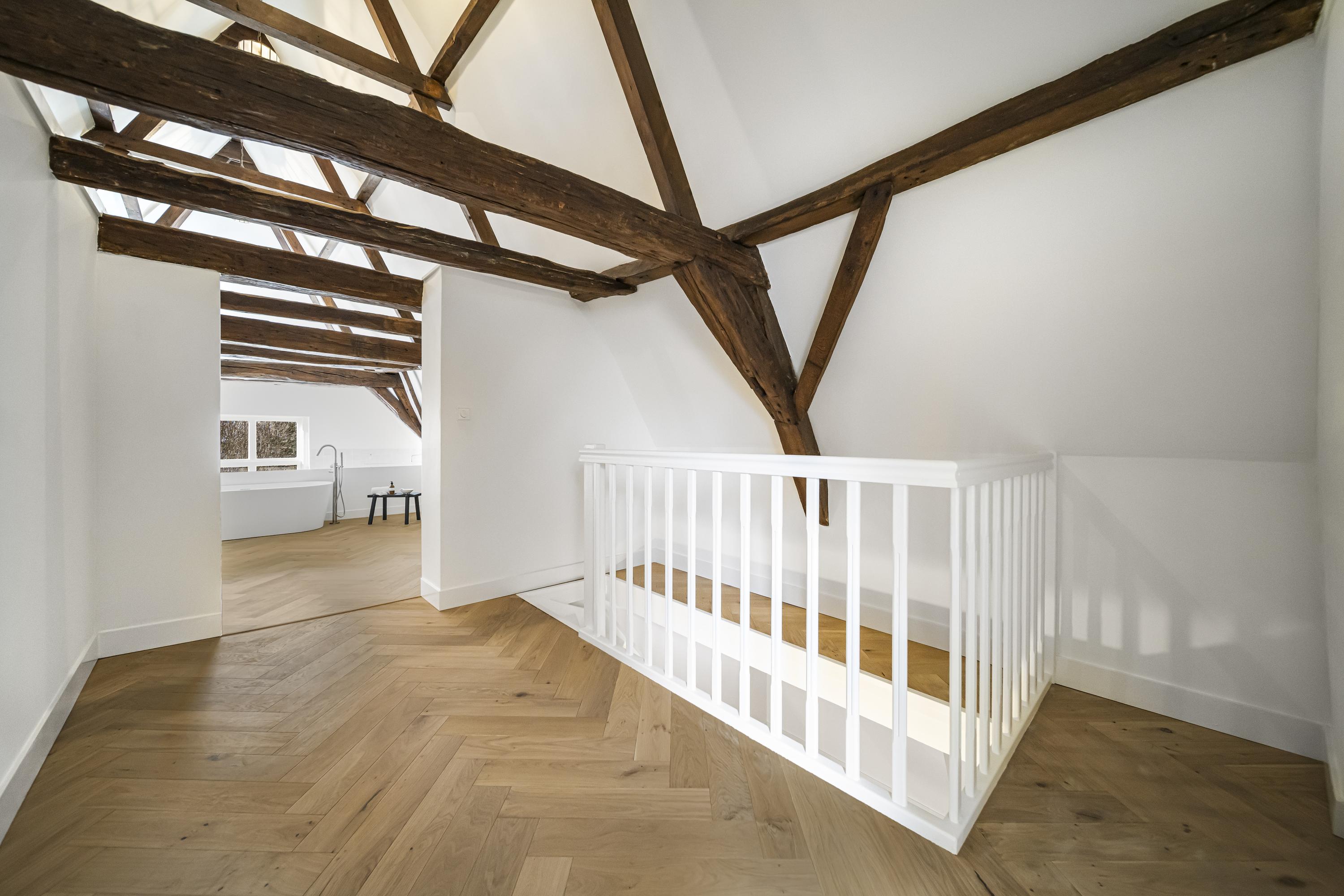 Newly installed herringbone parquet flooring on the ground and upper floors